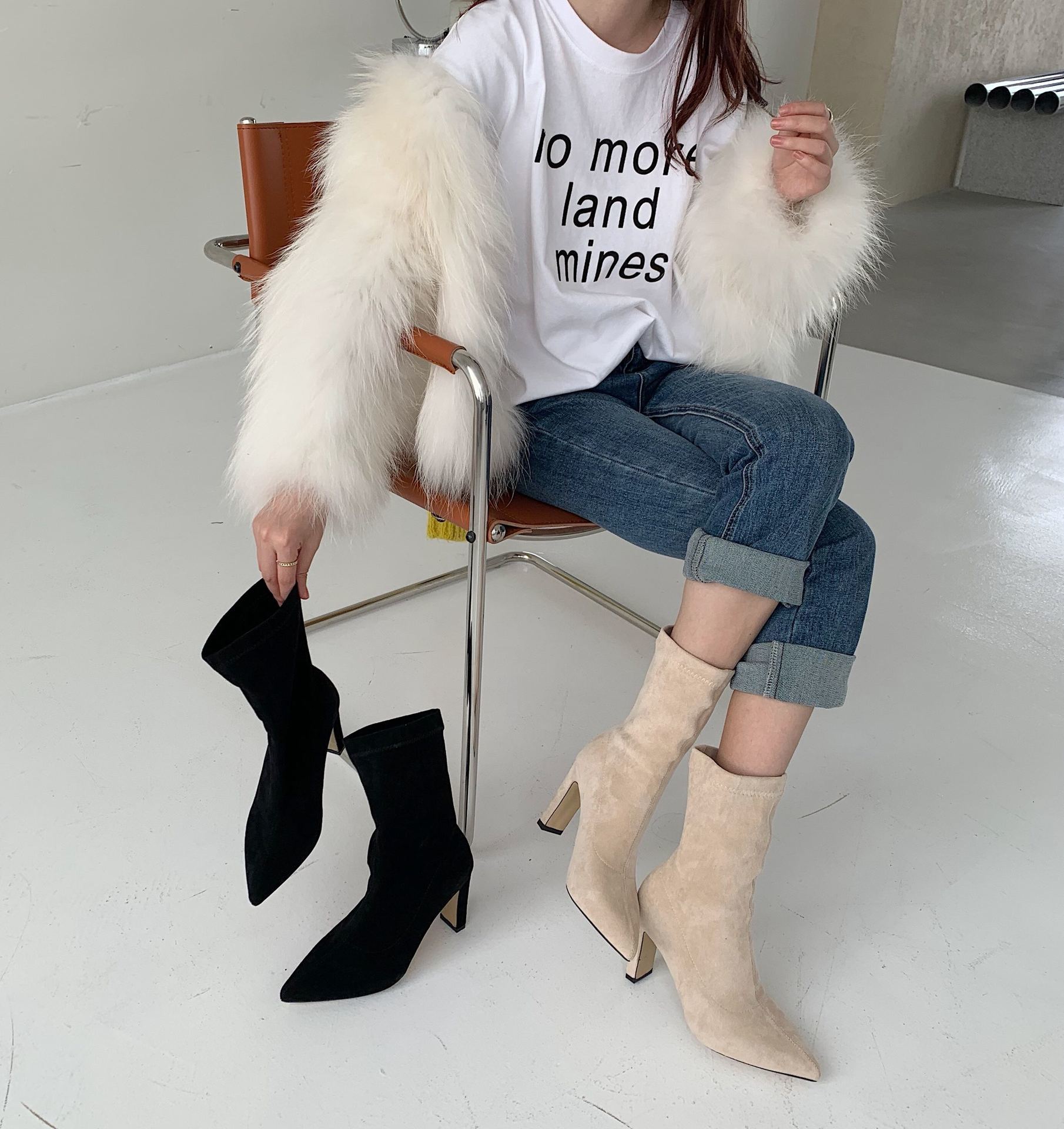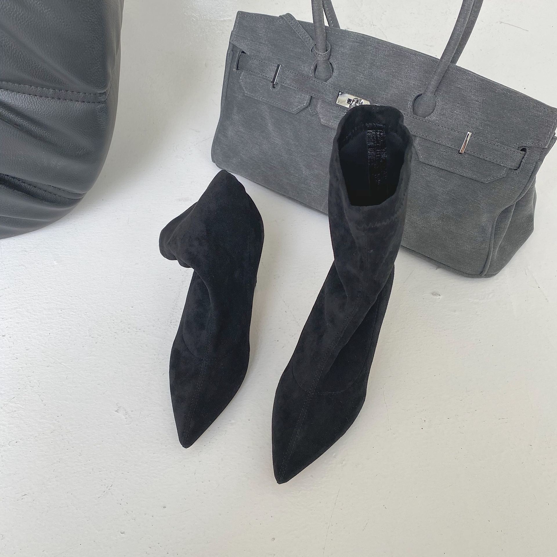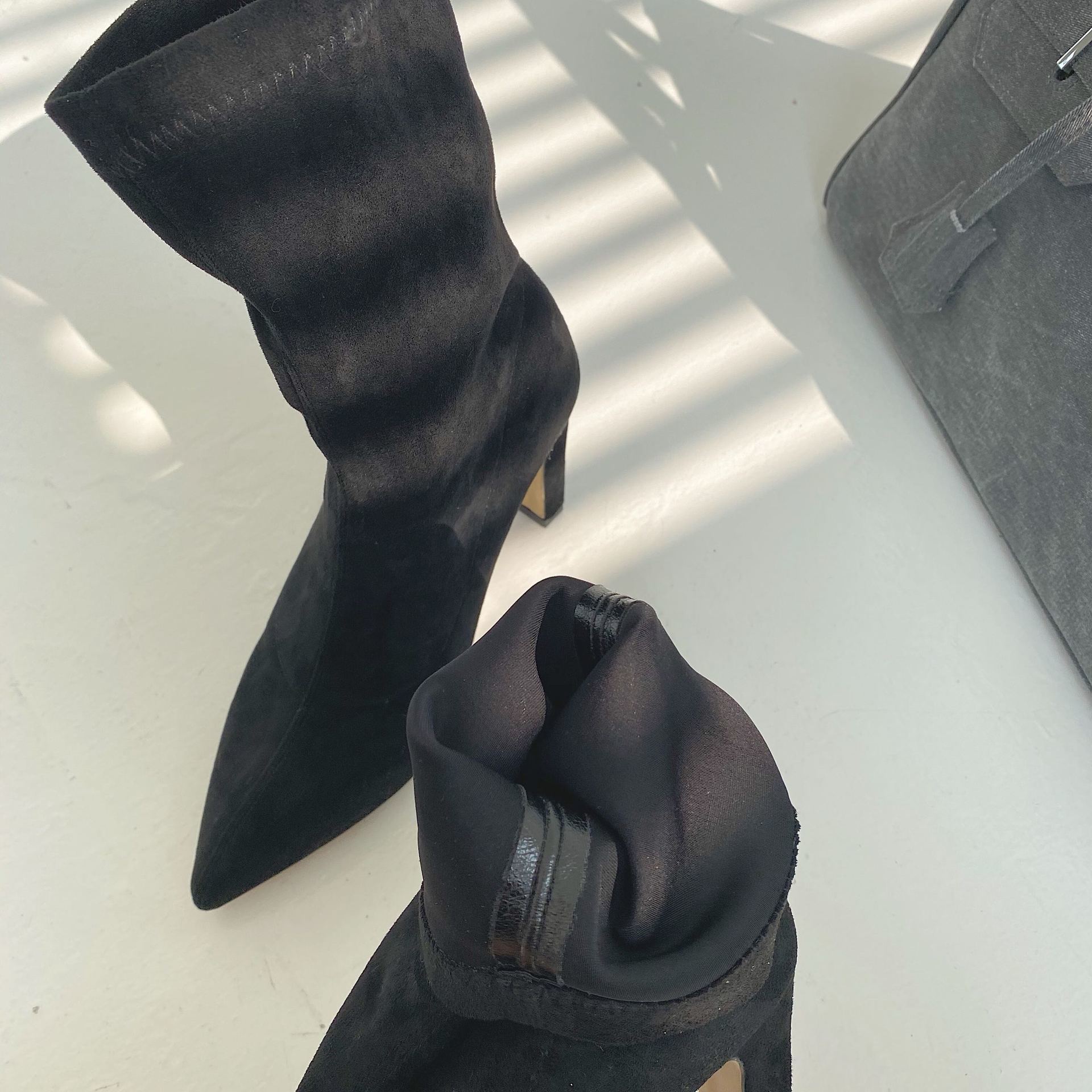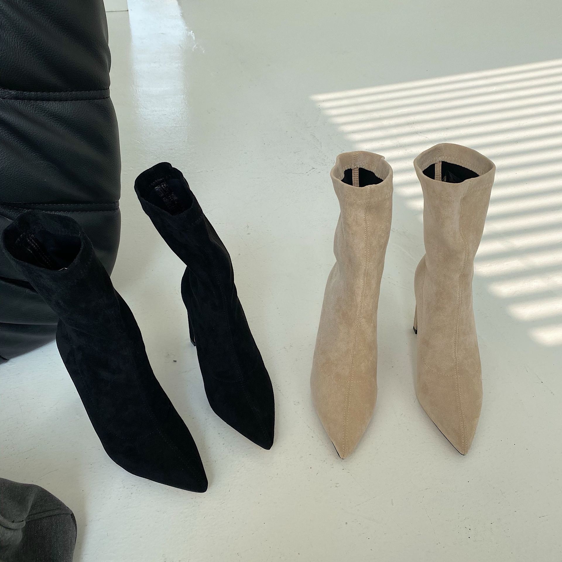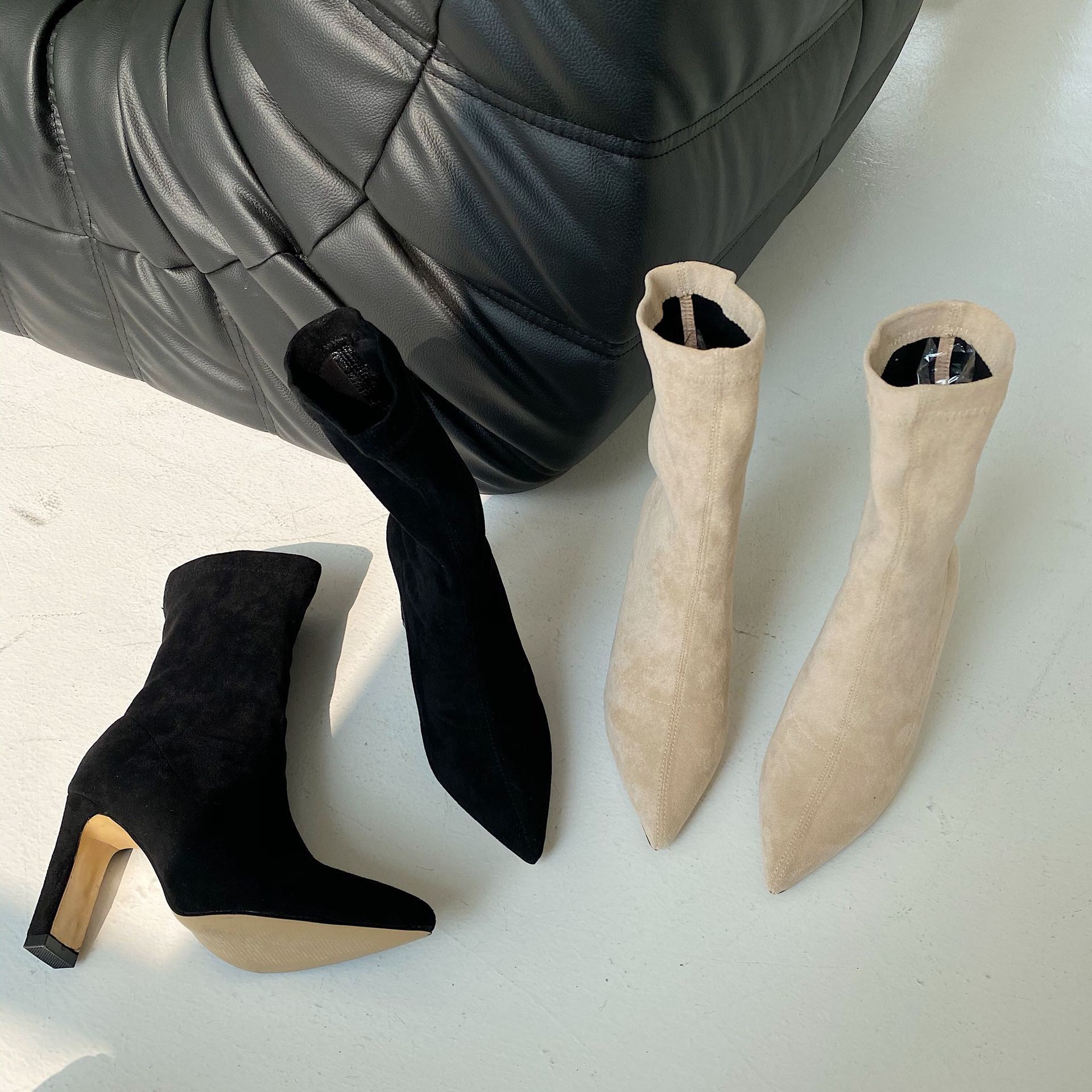 麂皮一字粗跟襪靴 (黑/杏) (34-40)