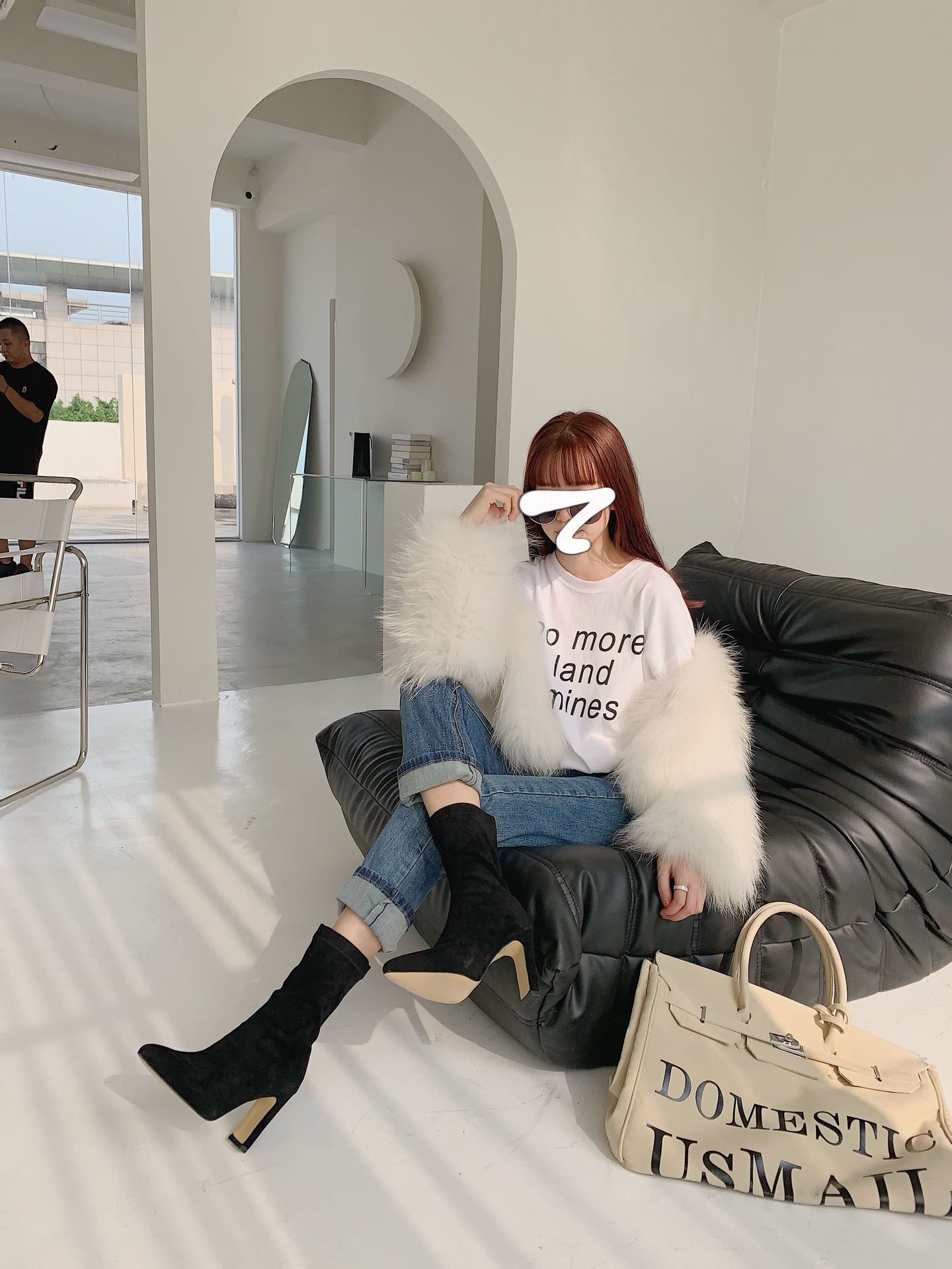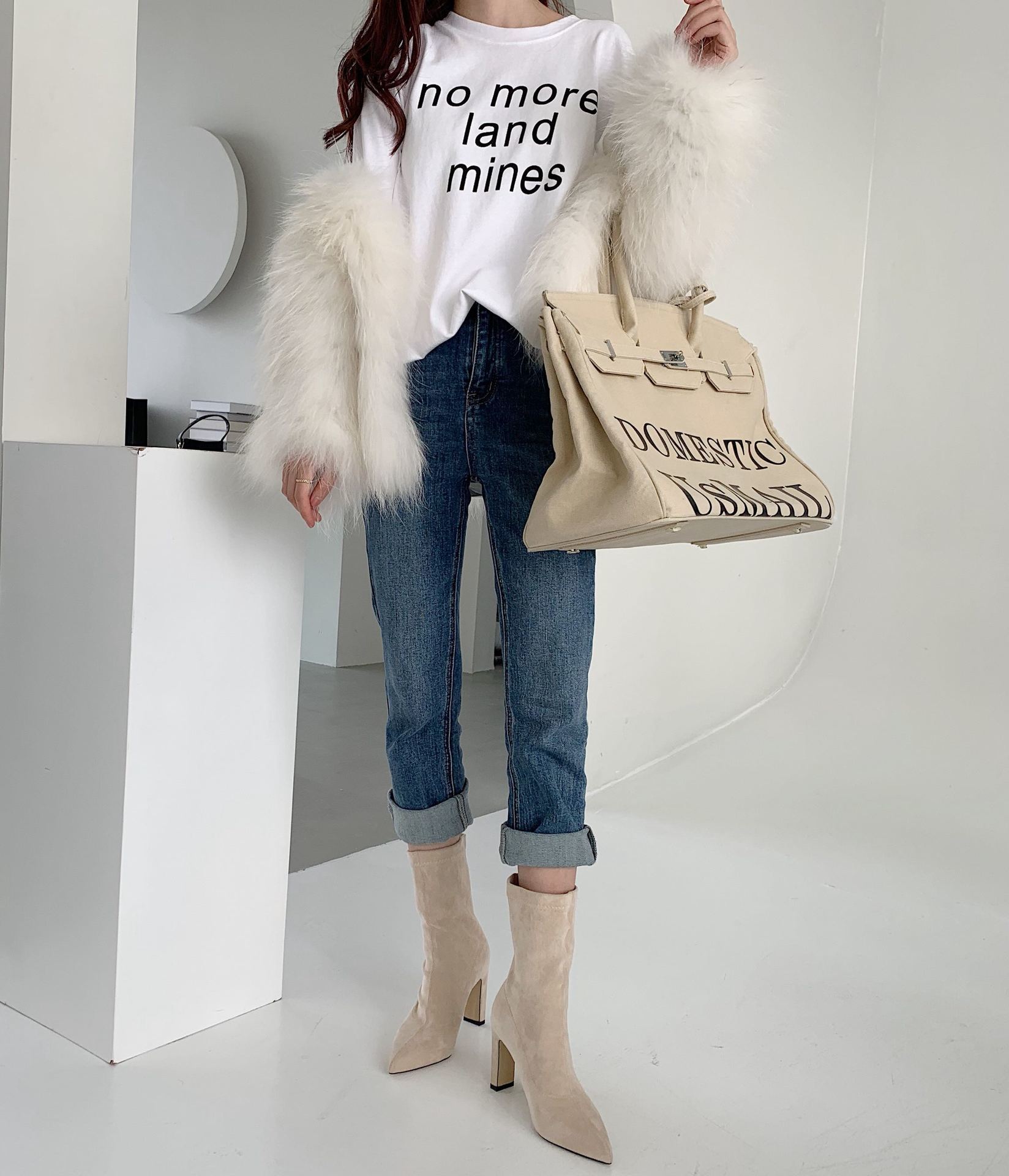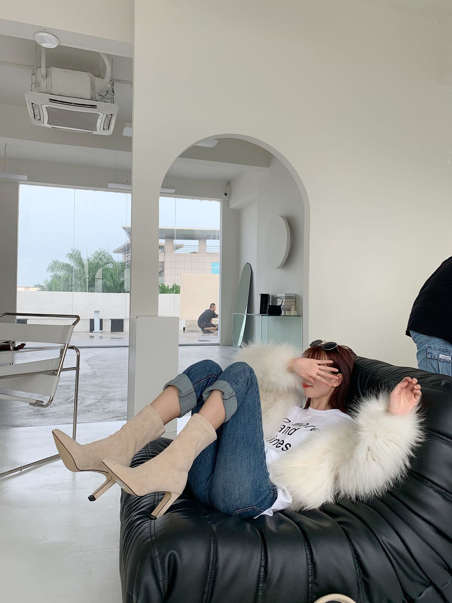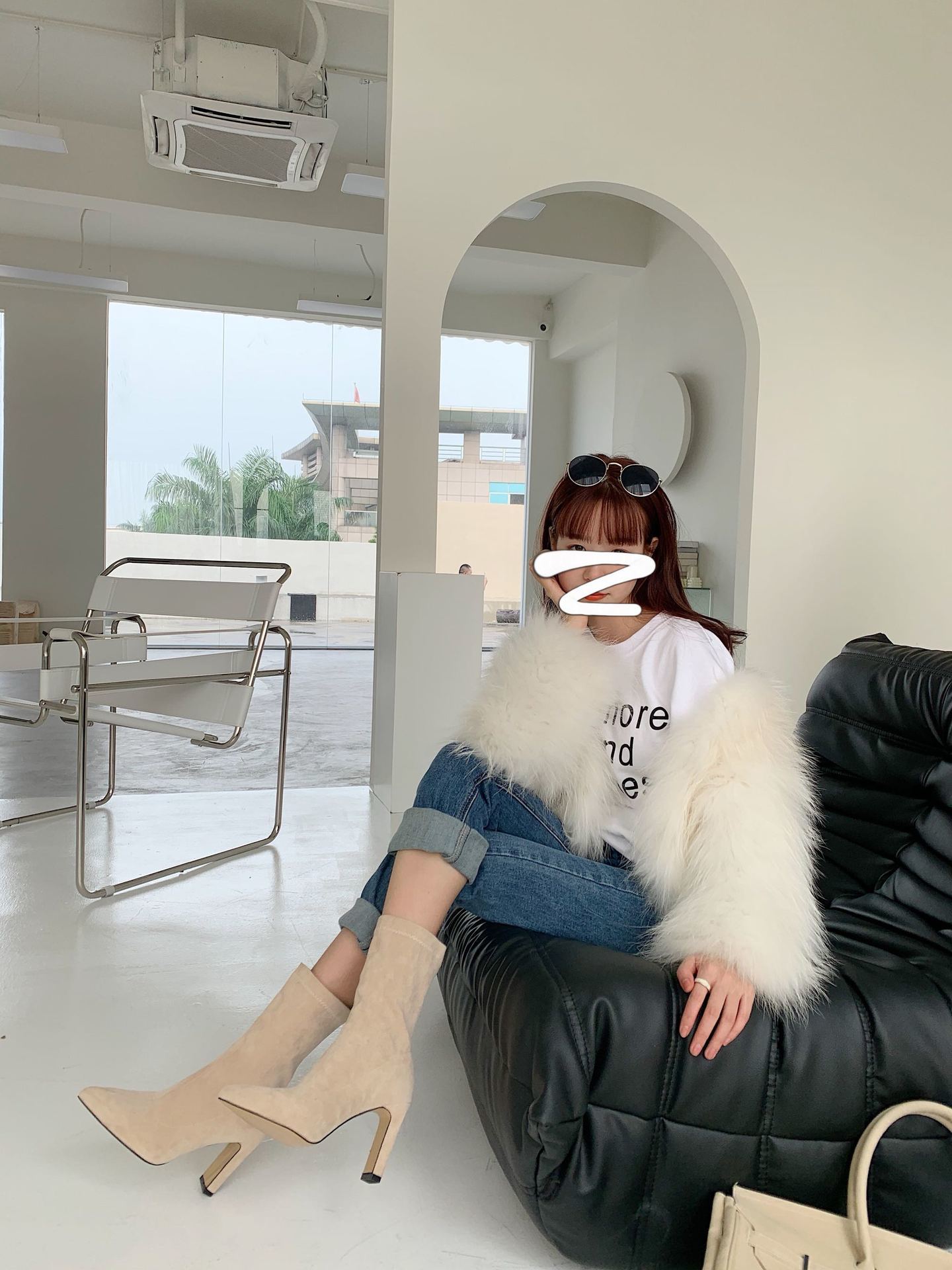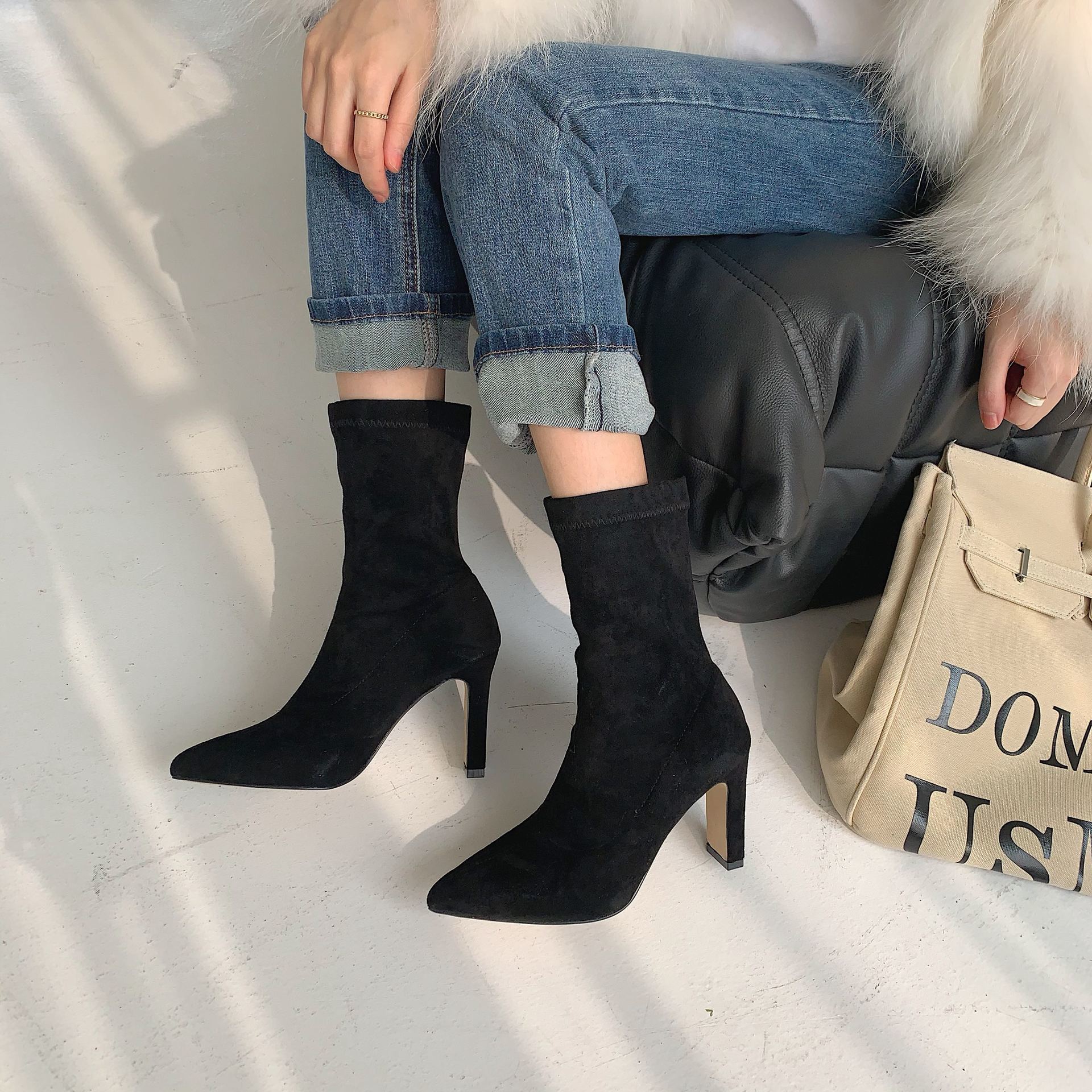麂皮一字粗跟襪靴 (黑/杏) (34-40)