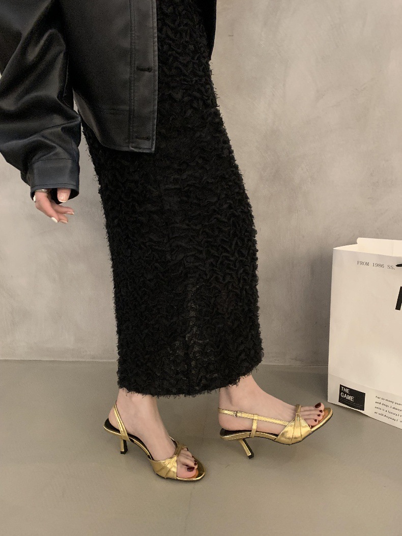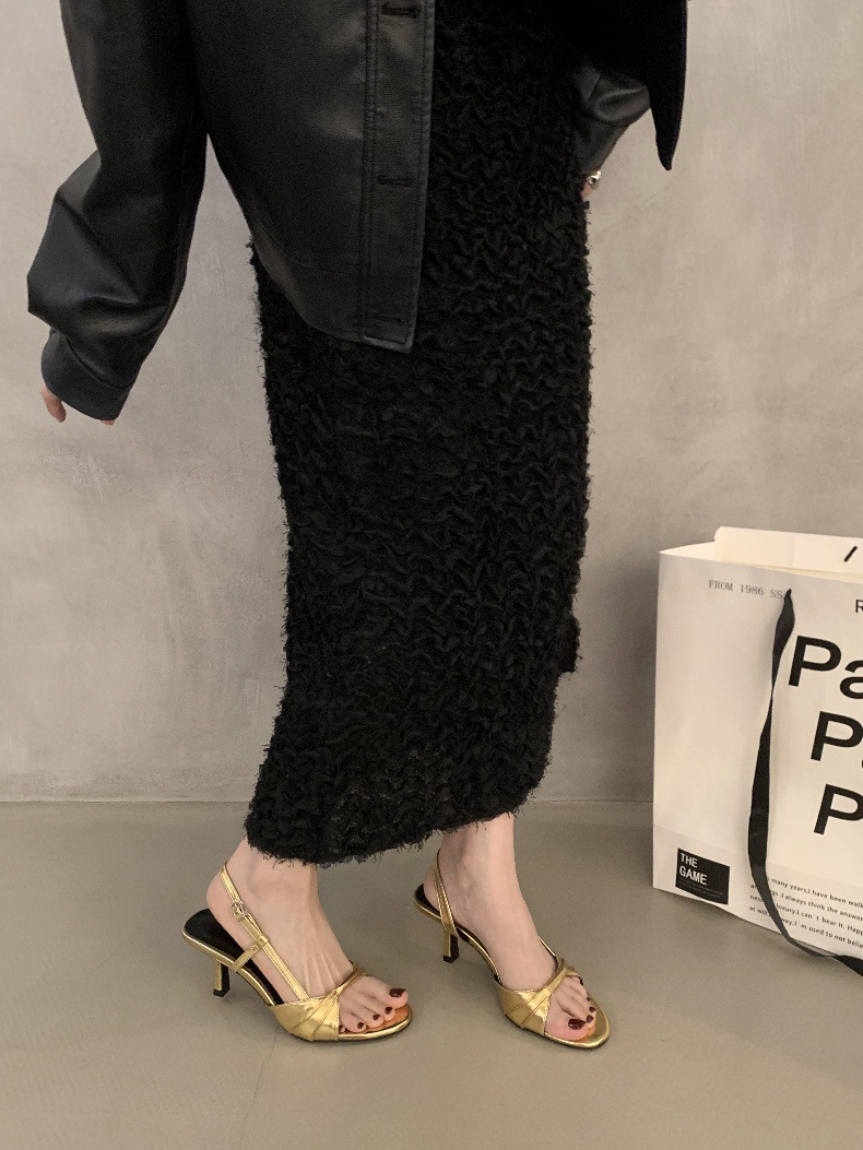 壓褶露趾 低跟鞋(35-39)(金/銀/黑)