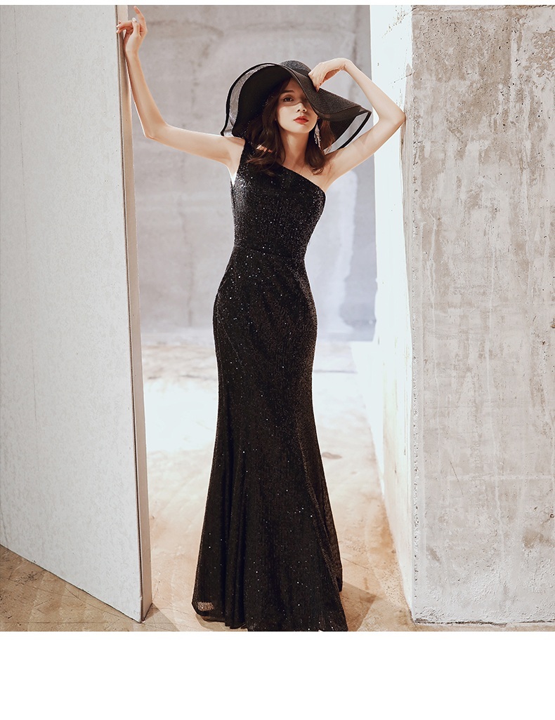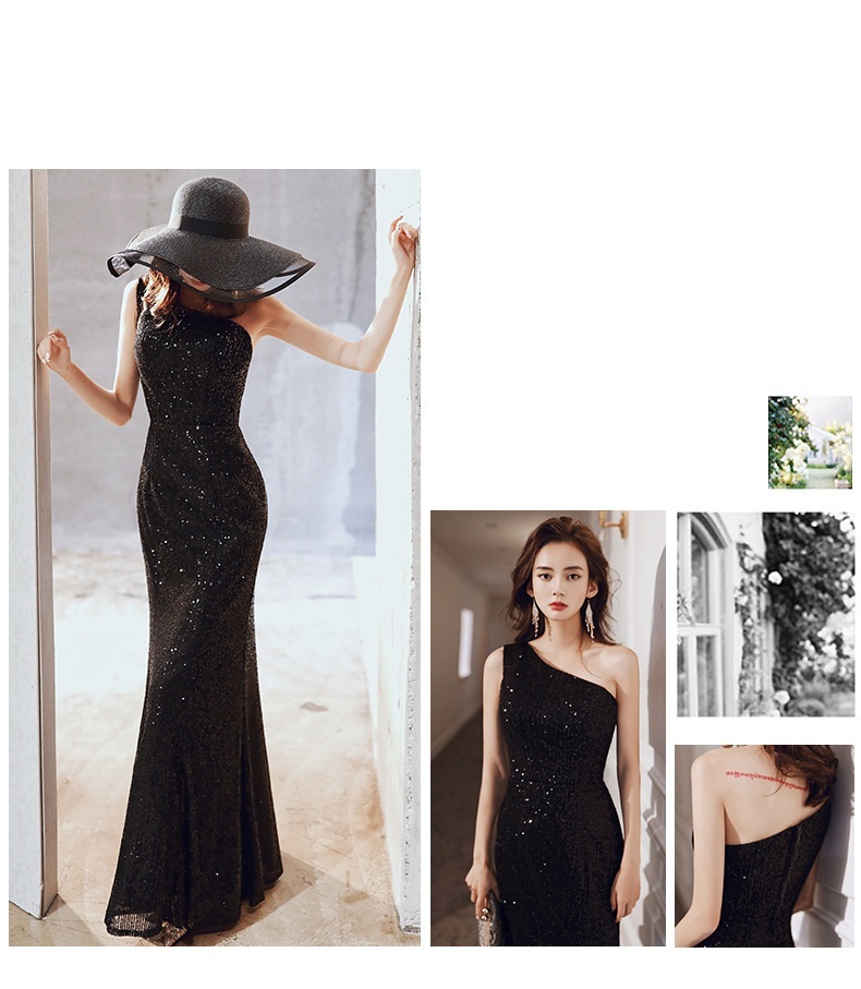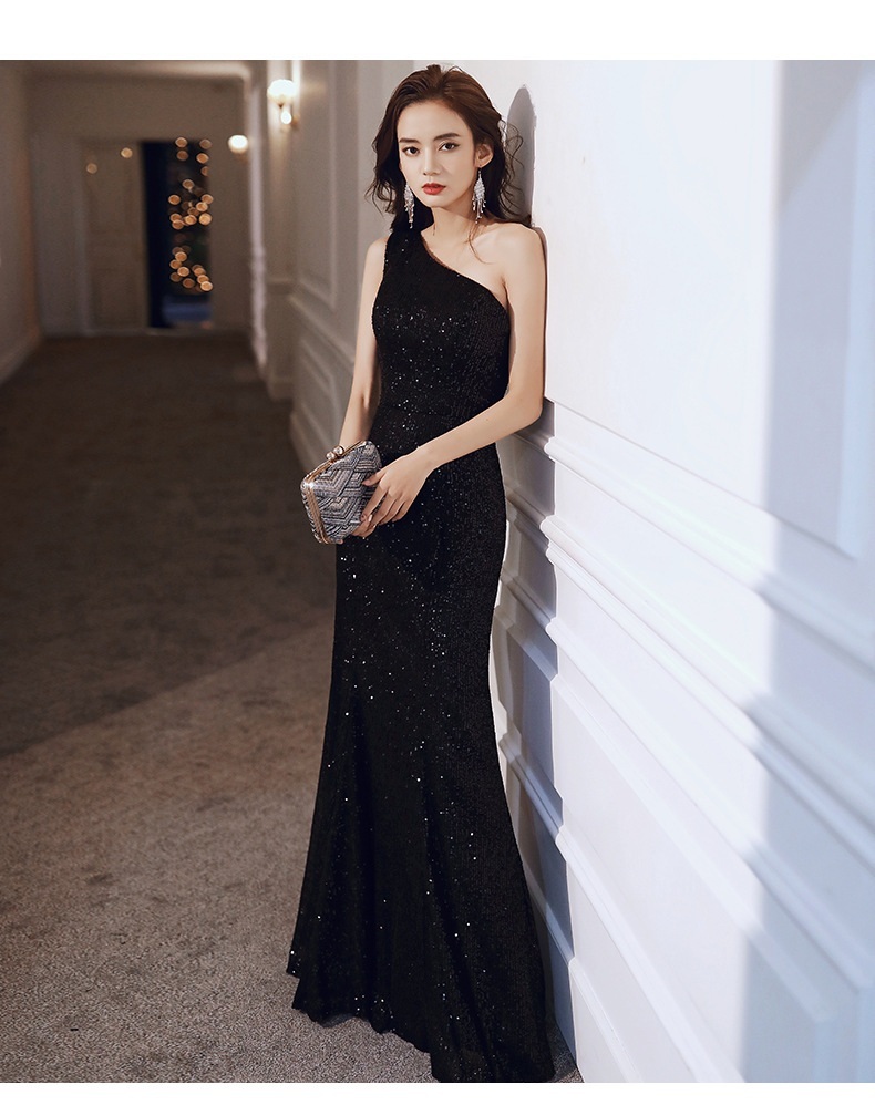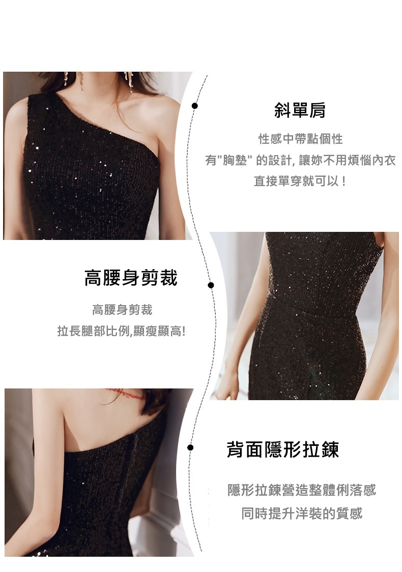 曲線剪裁突顯曼妙身形,單肩設計增添神秘感,亮片裝飾帶來高貴華麗的氣場。