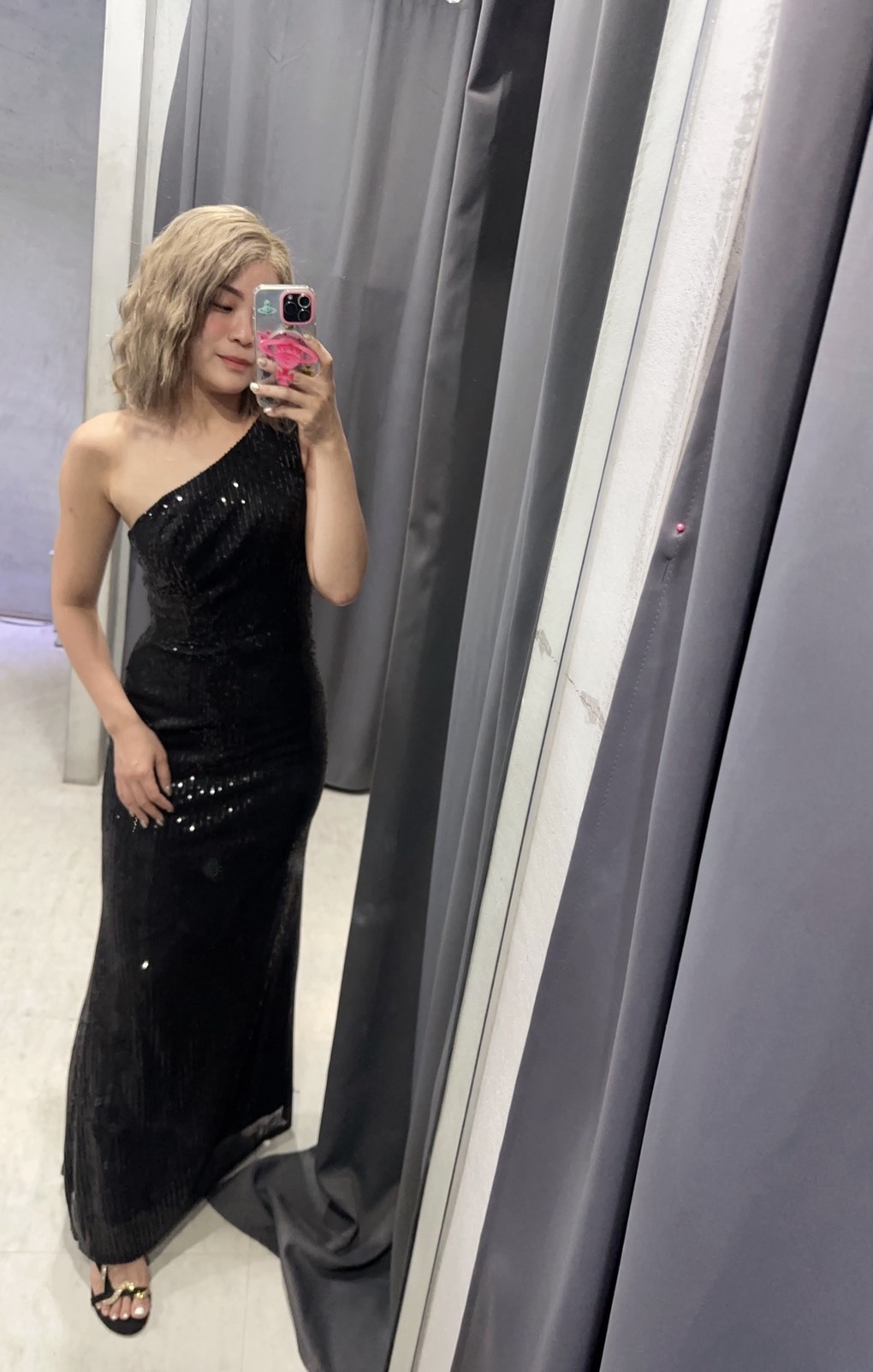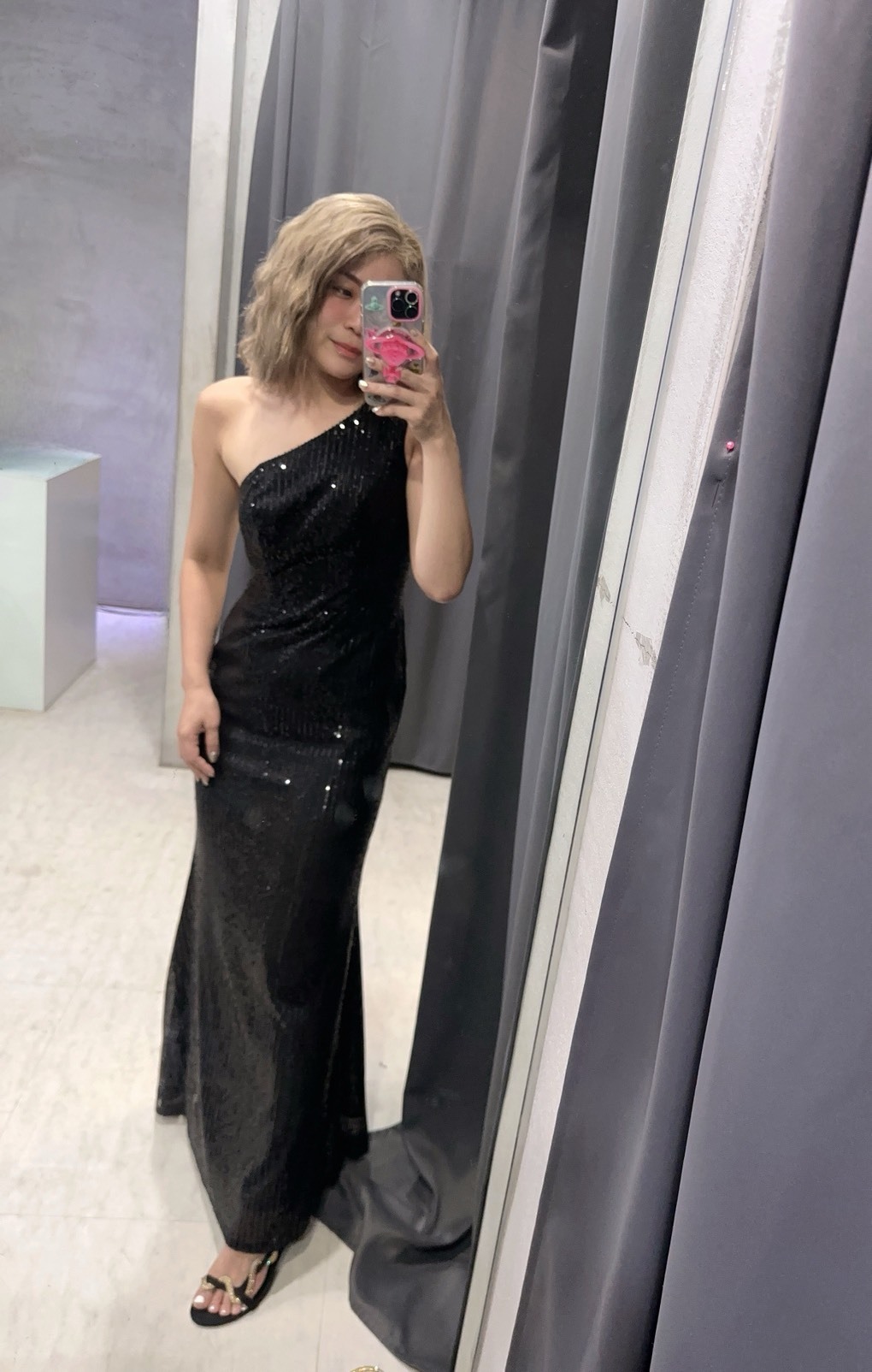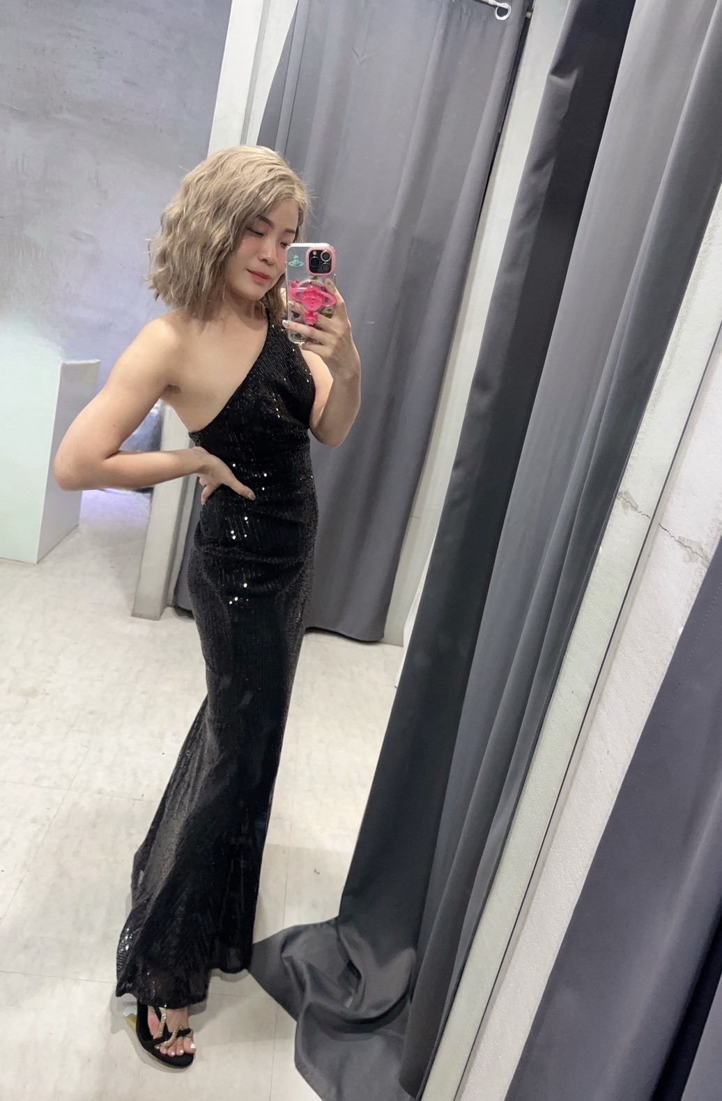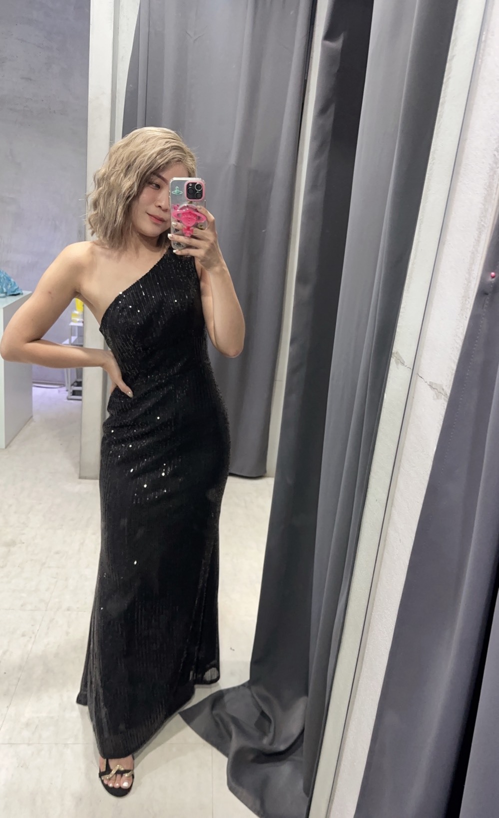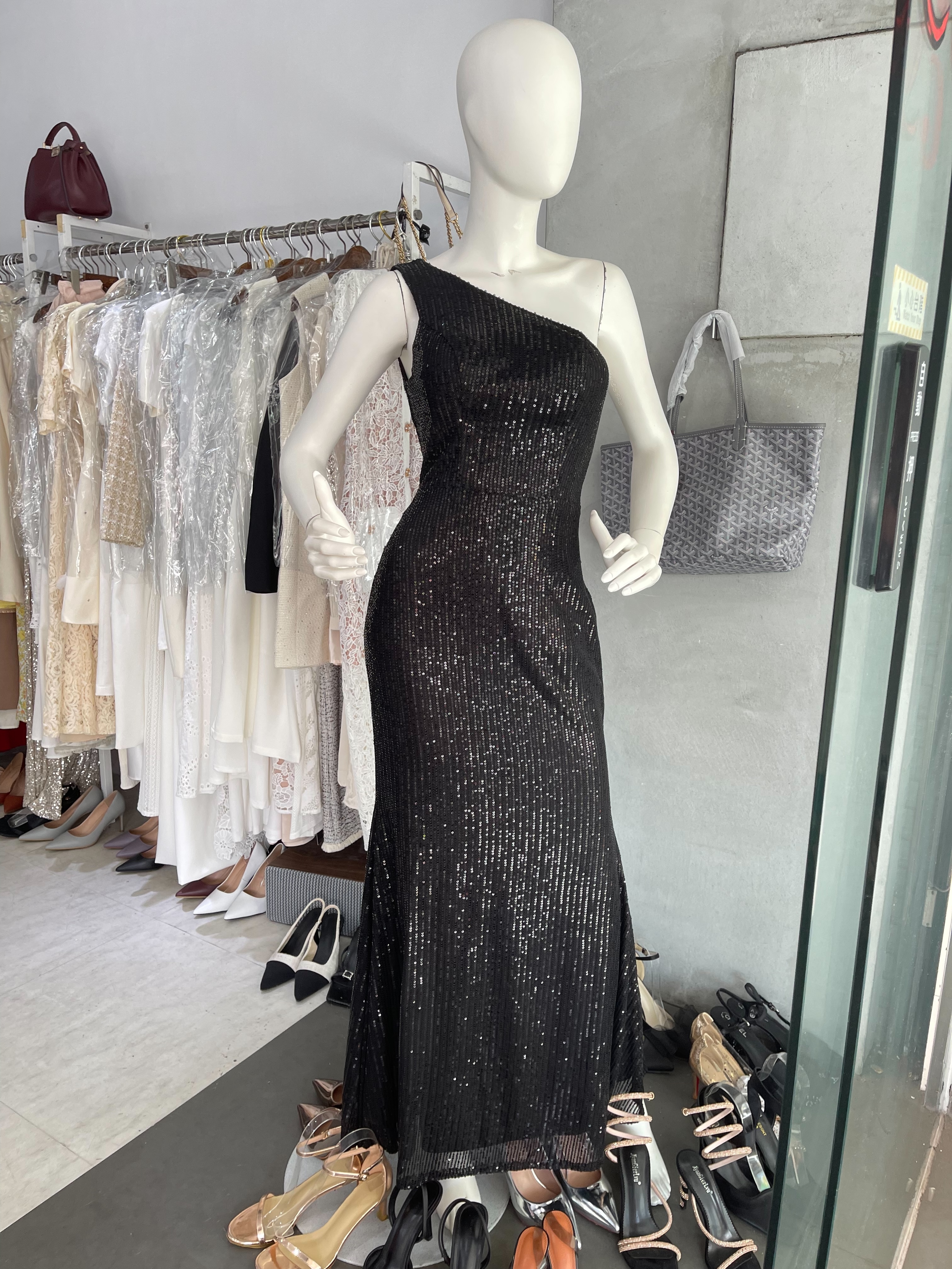 這件晚禮服採用優質亮片面料,搭配性感單肩設計,打造出迷人的魚尾剪裁,在華麗中透露出冷豔的氣質。