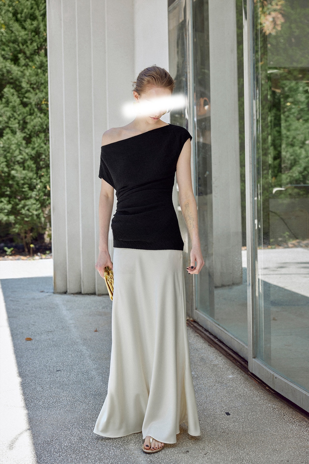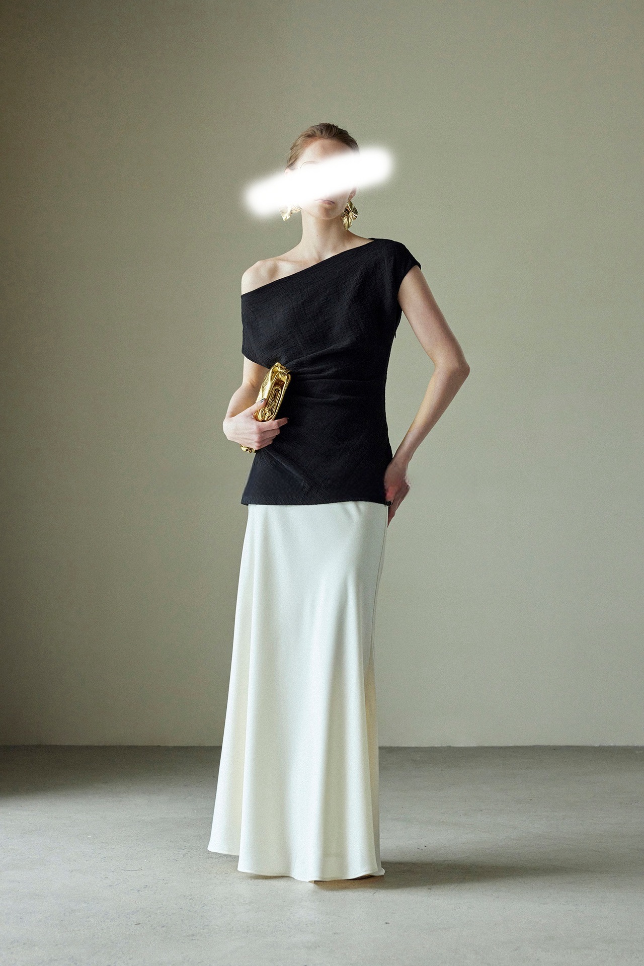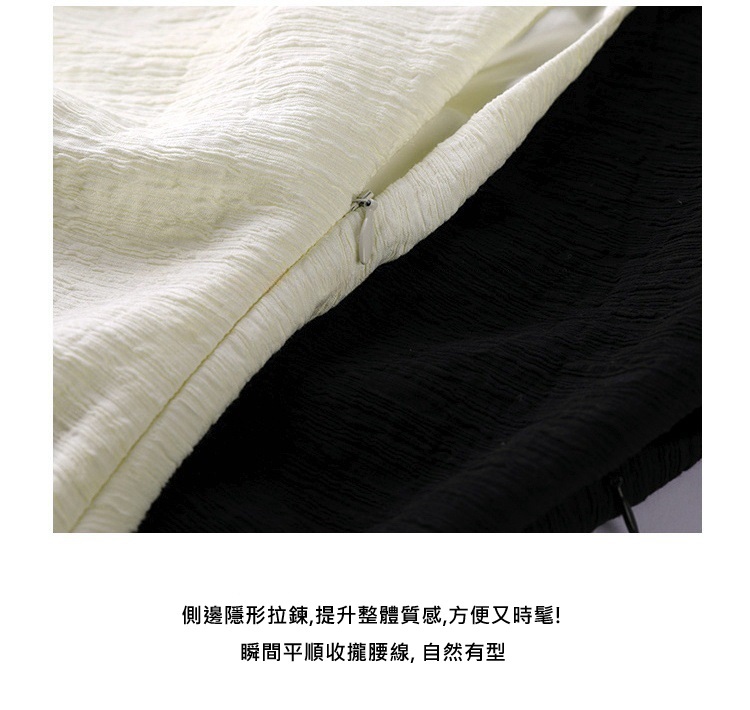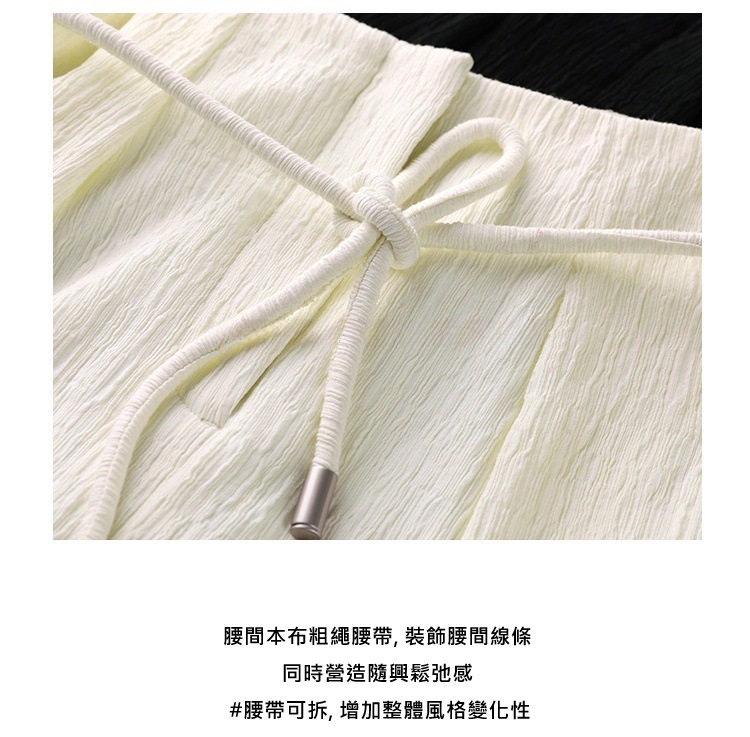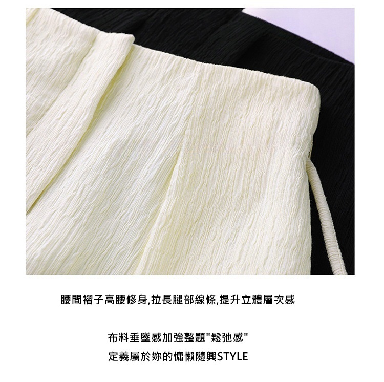 時髦精 皺皺布露肩上衣+高腰直筒褲(黑/白)(2件組)
