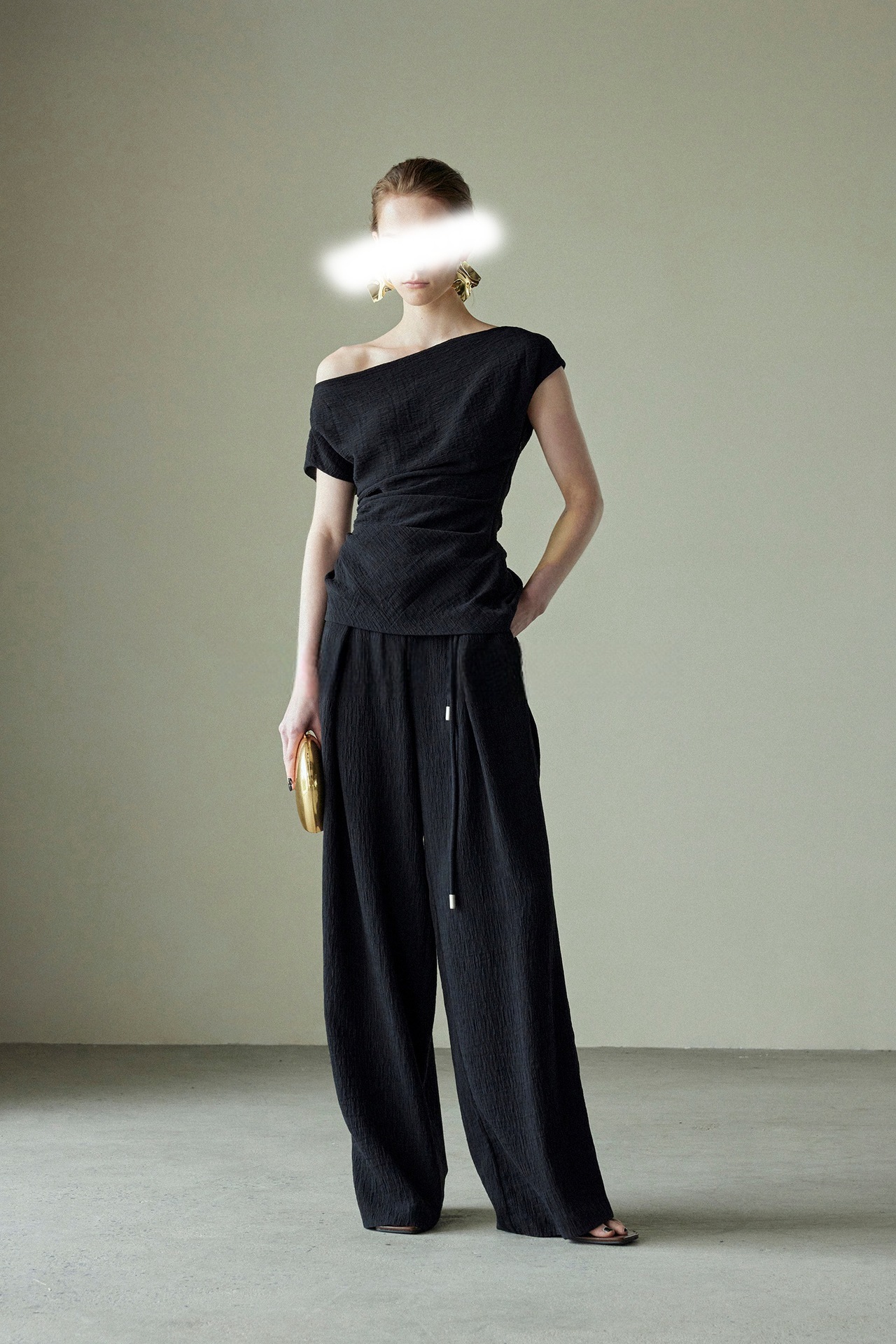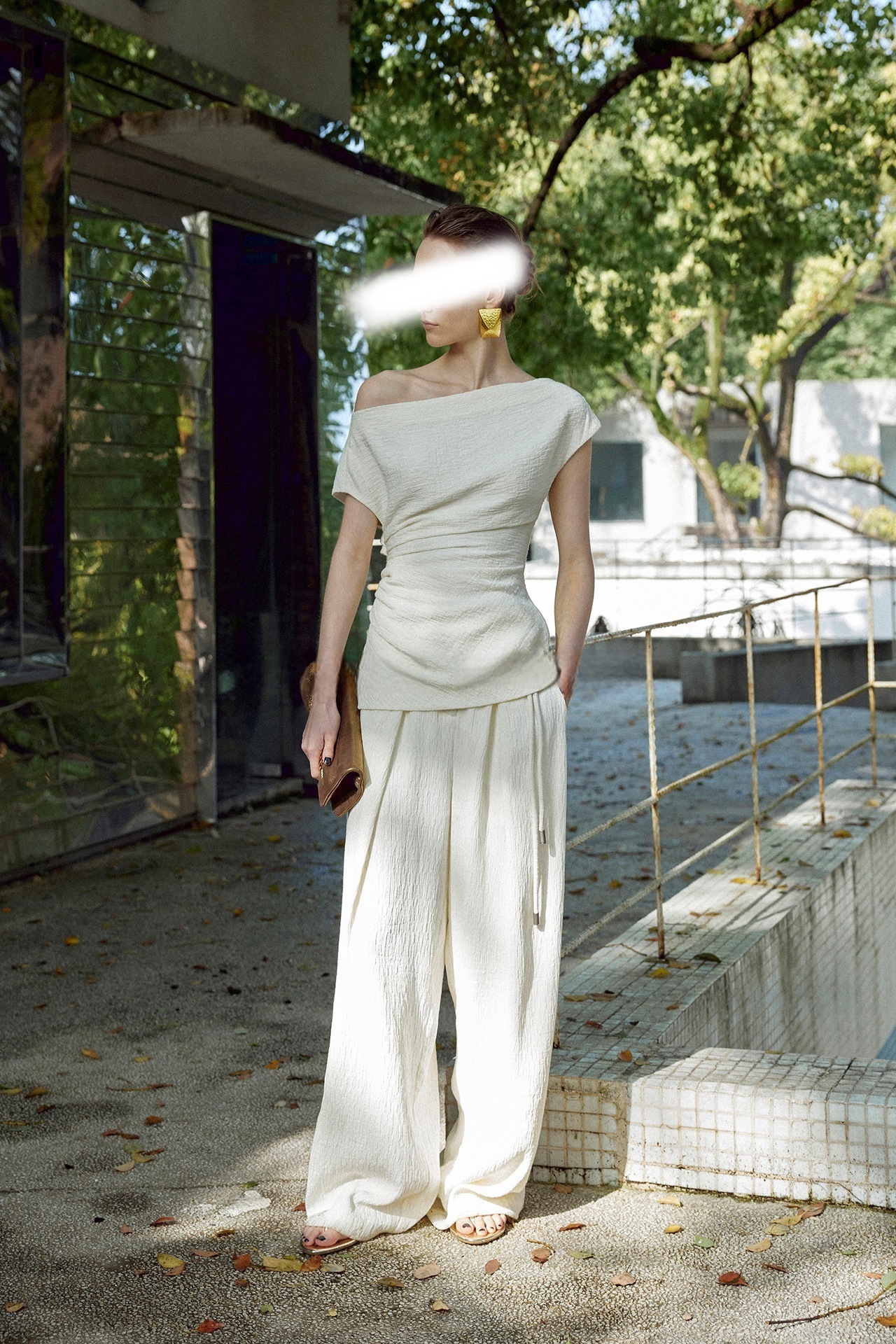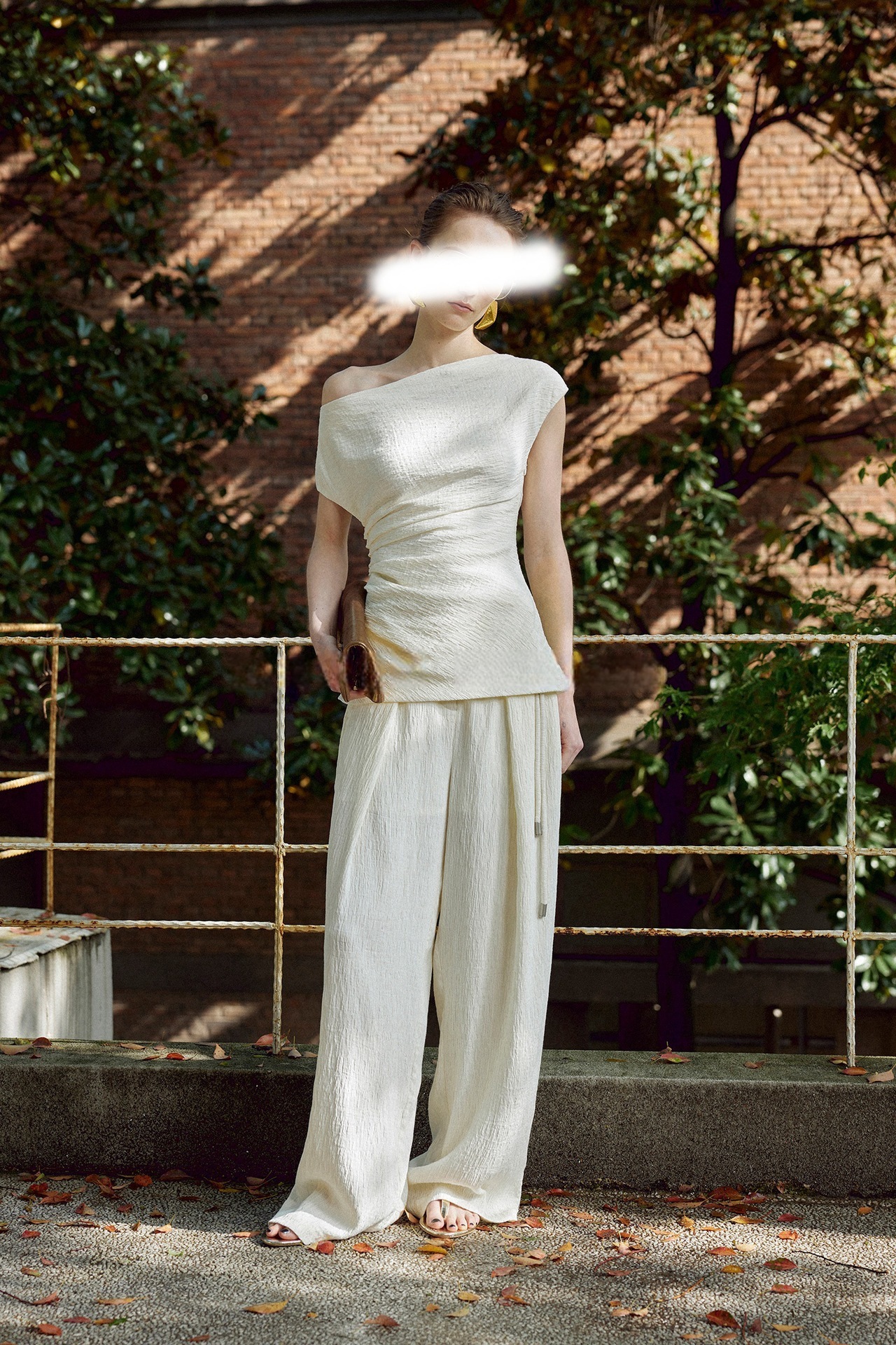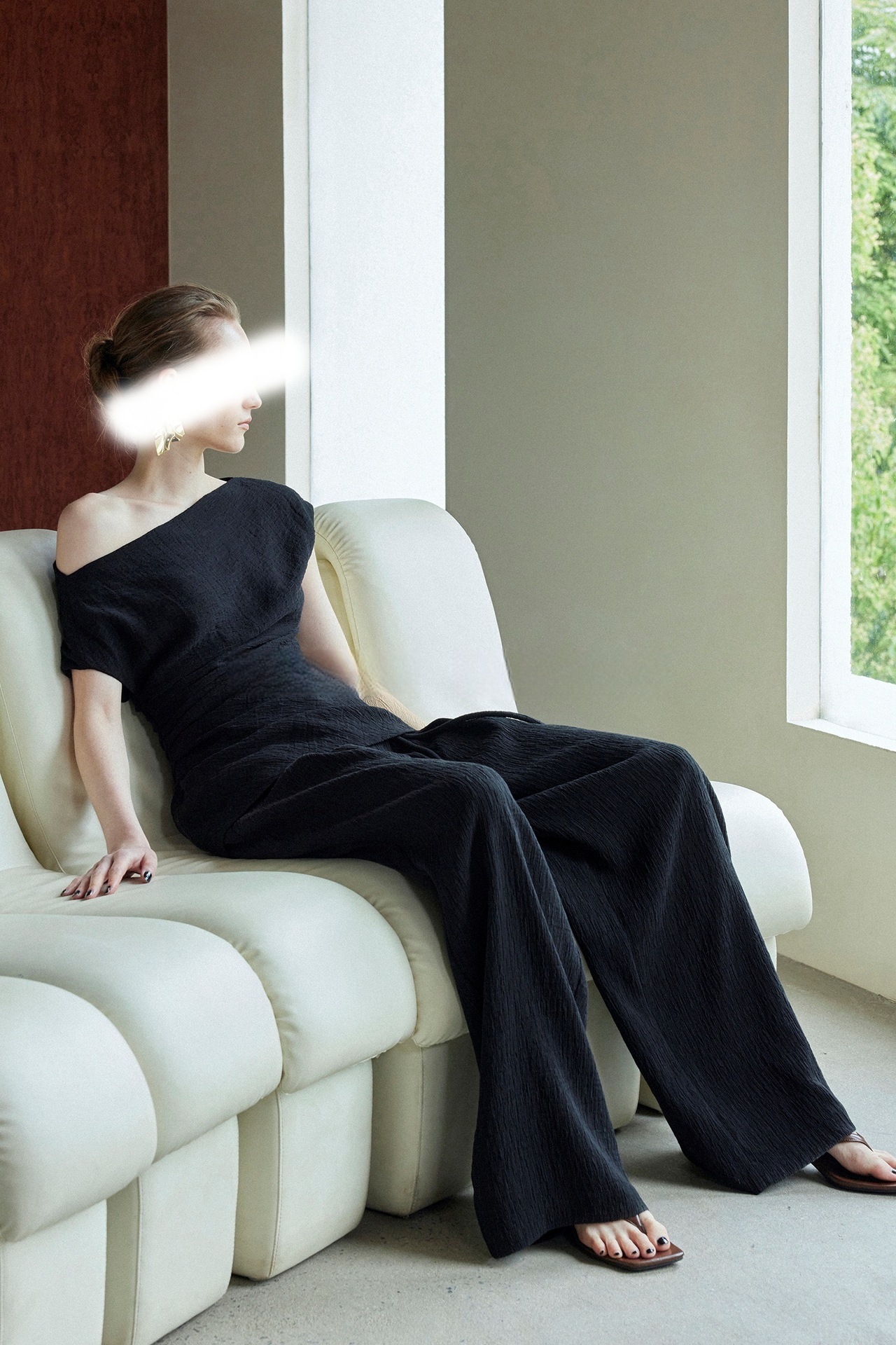 優雅的露肩剪裁為整體造型增添優雅氣質。細緻的皺褶紋理營造時尚洗鍊感。高腰設計修飾腰線比例,顯現修長比例。簡約流暢的直筒褲型,展現自在隨性的穿搭風格。 豐富質感的自然色系,適合多種場合搭配。
