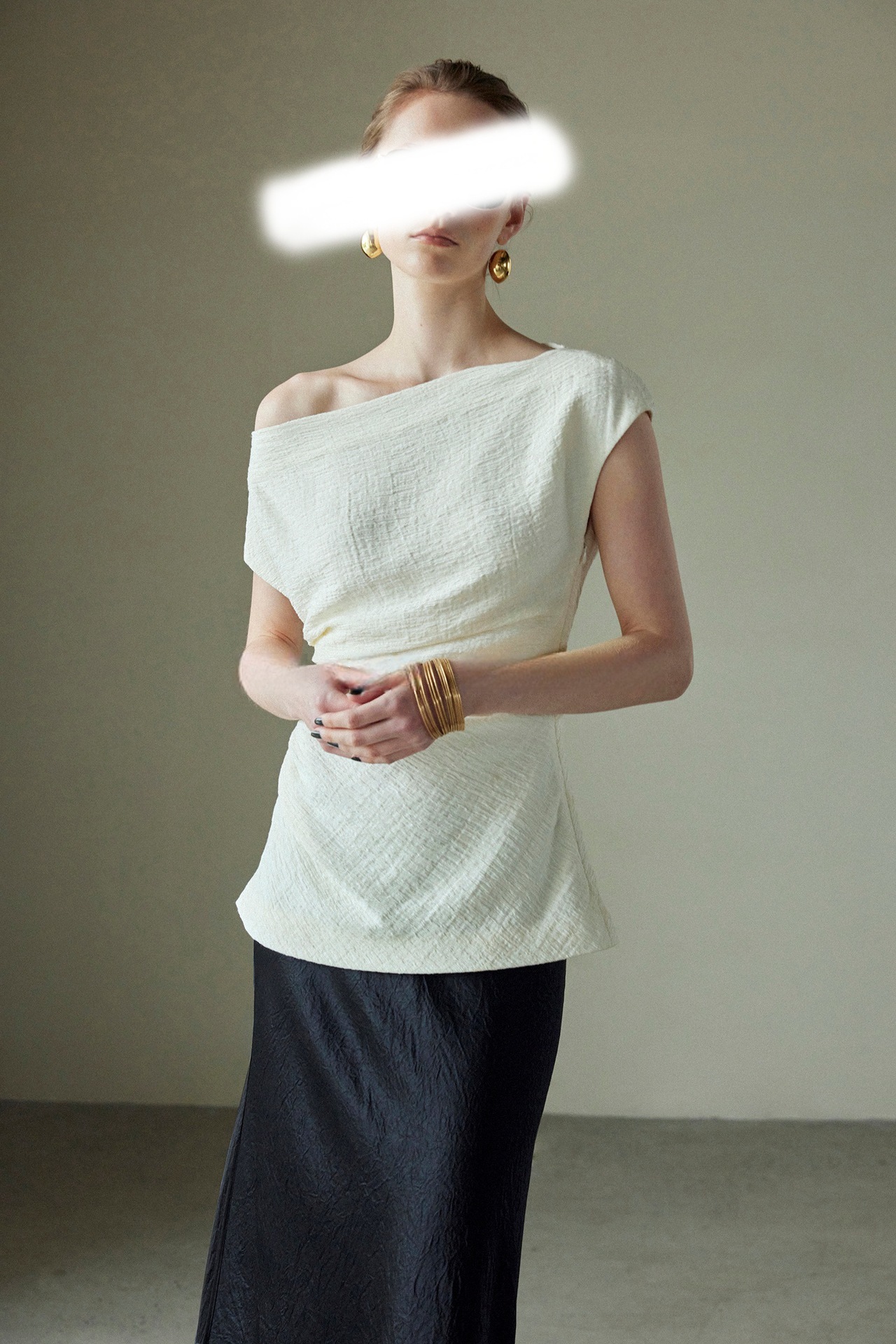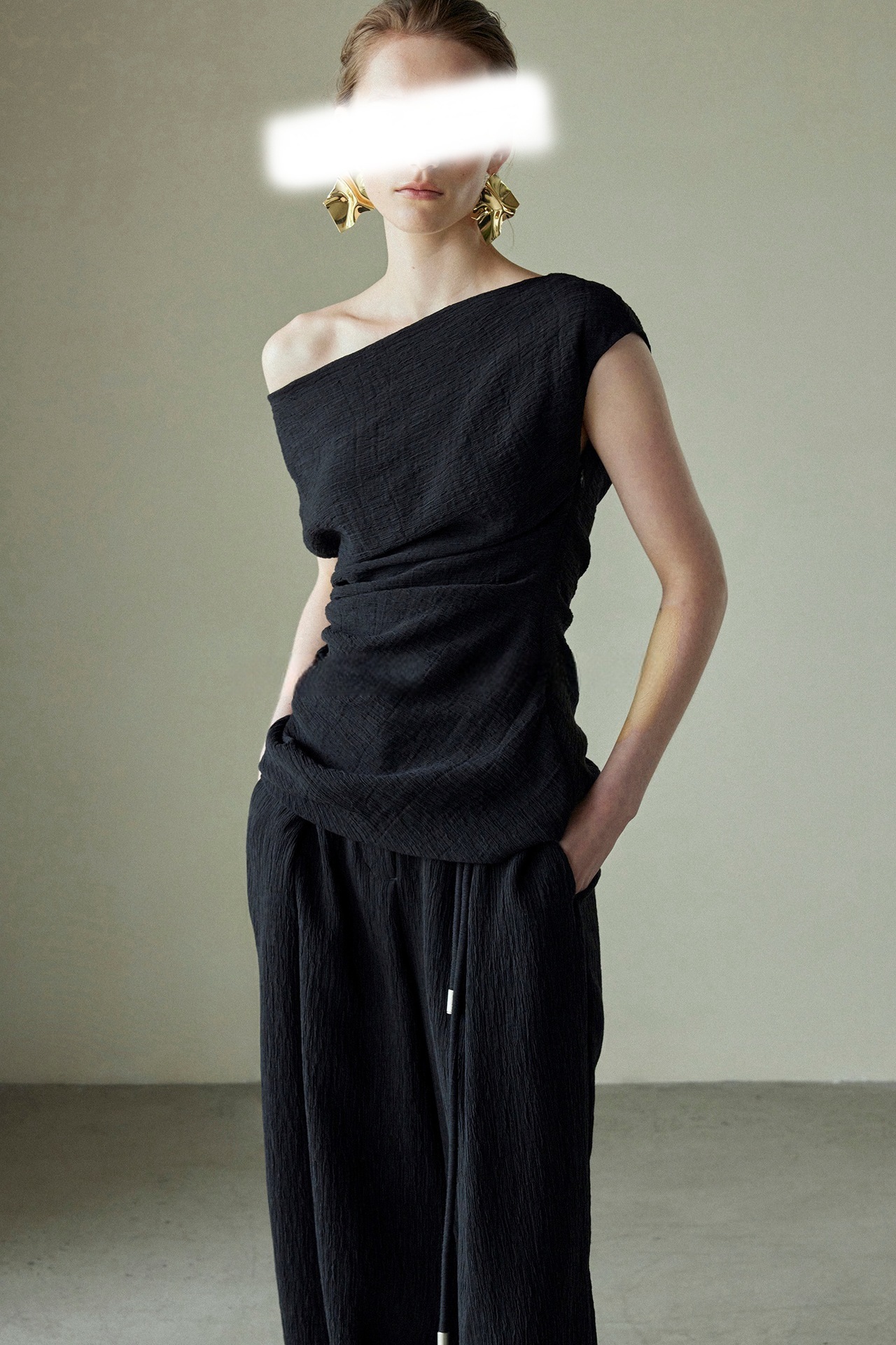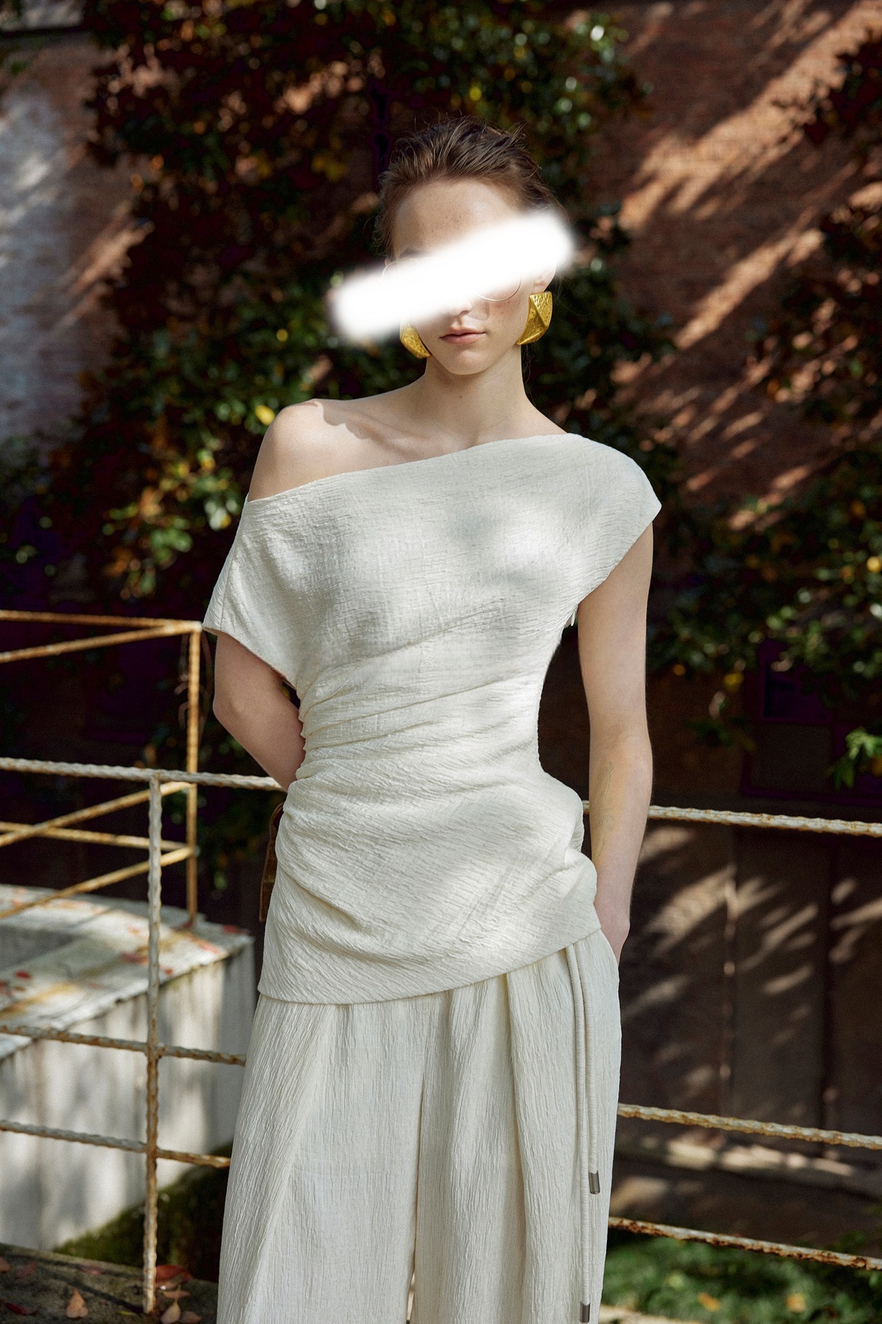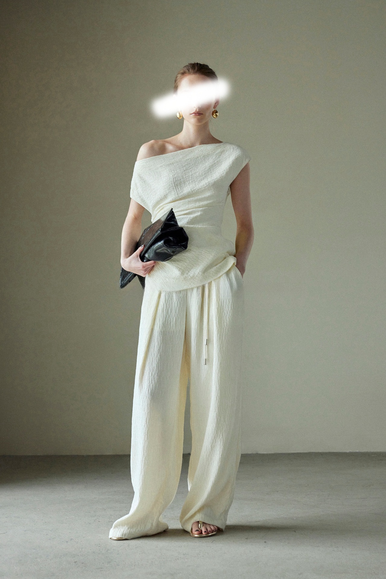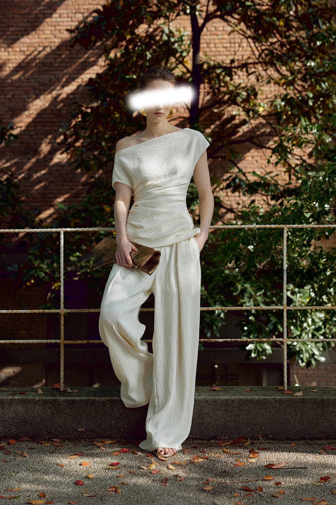 優雅的露肩剪裁為整體造型增添優雅氣質。細緻的皺褶紋理營造時尚洗鍊感。高腰設計修飾腰線比例,顯現修長比例。簡約流暢的直筒褲型,展現自在隨性的穿搭風格。 豐富質感的自然色系,適合多種場合搭配。