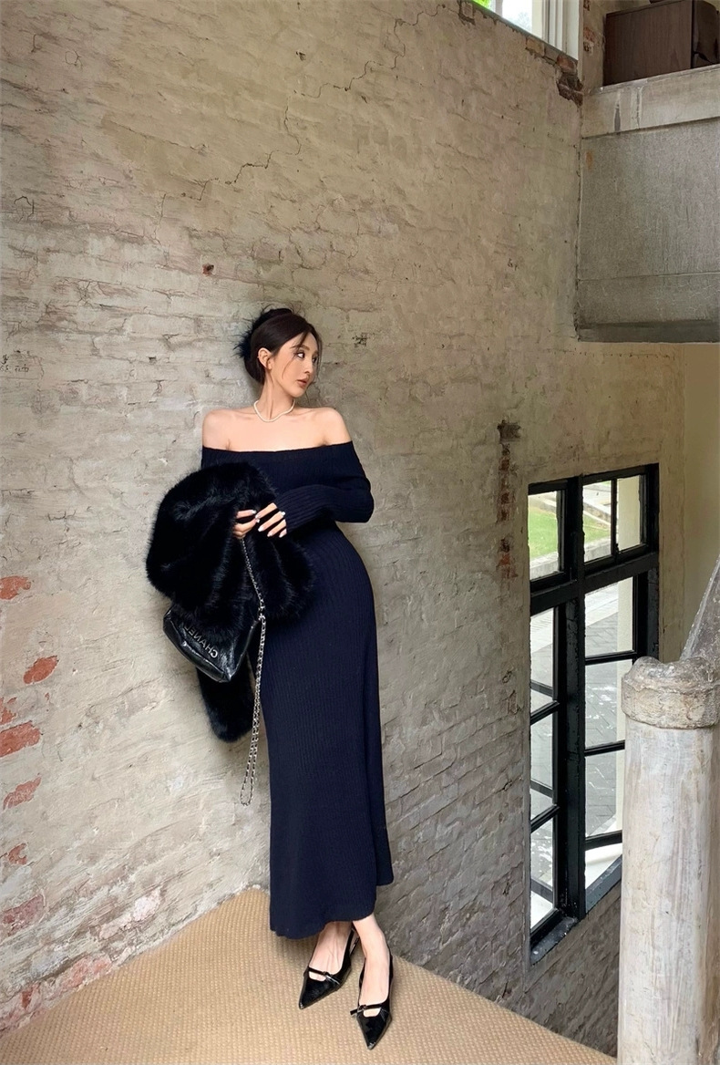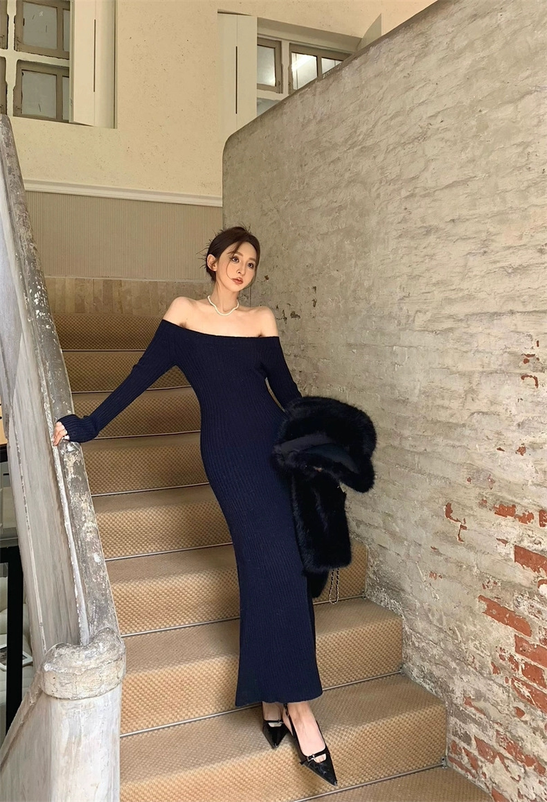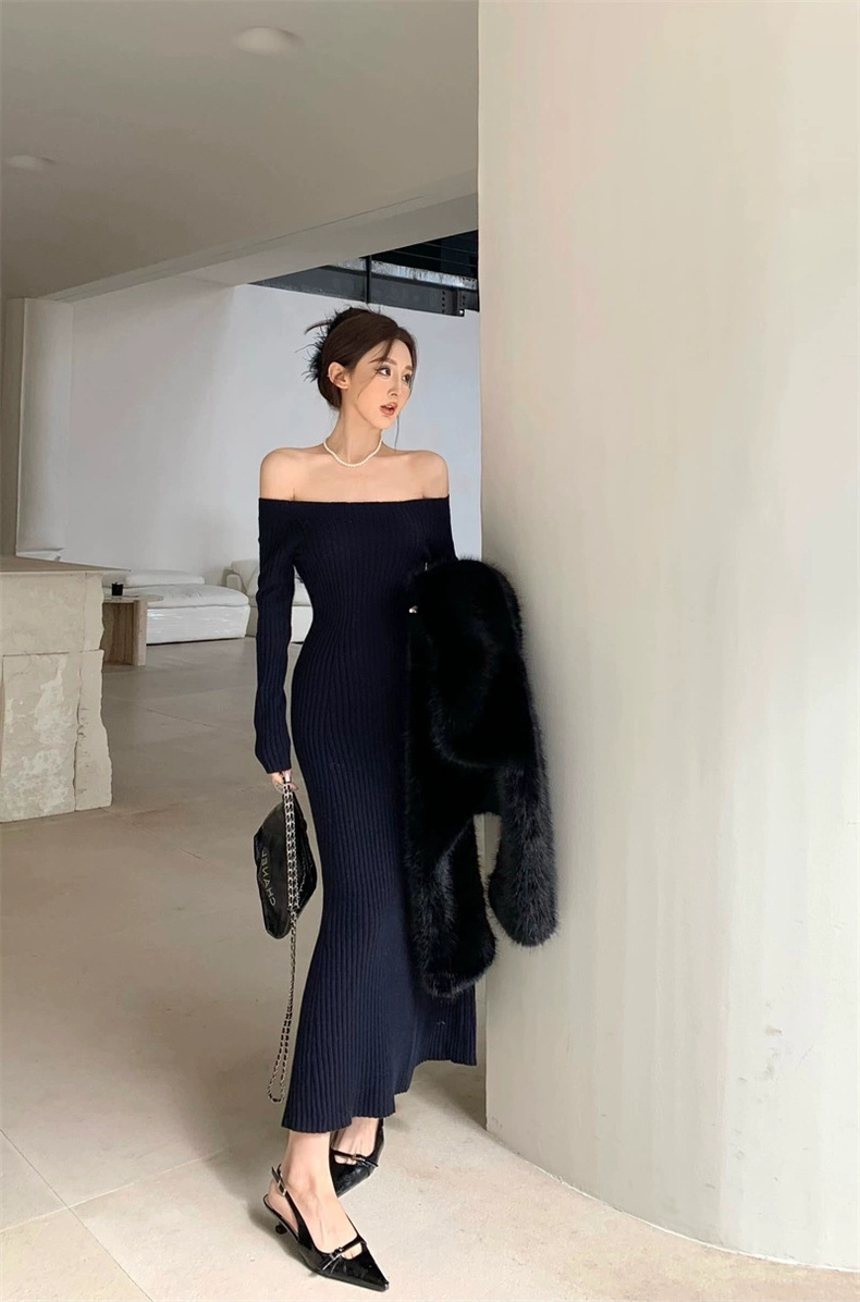 一字肩收腰長洋裝(深藍/黑/奶茶)