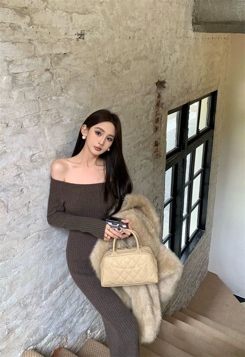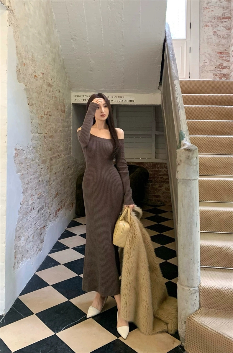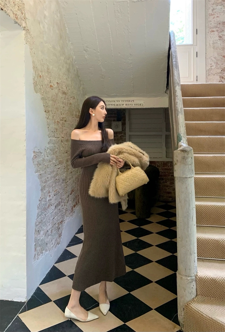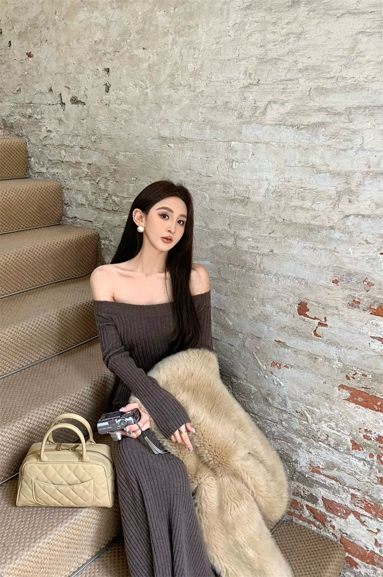 一字肩收腰長洋裝(深藍/黑/奶茶)