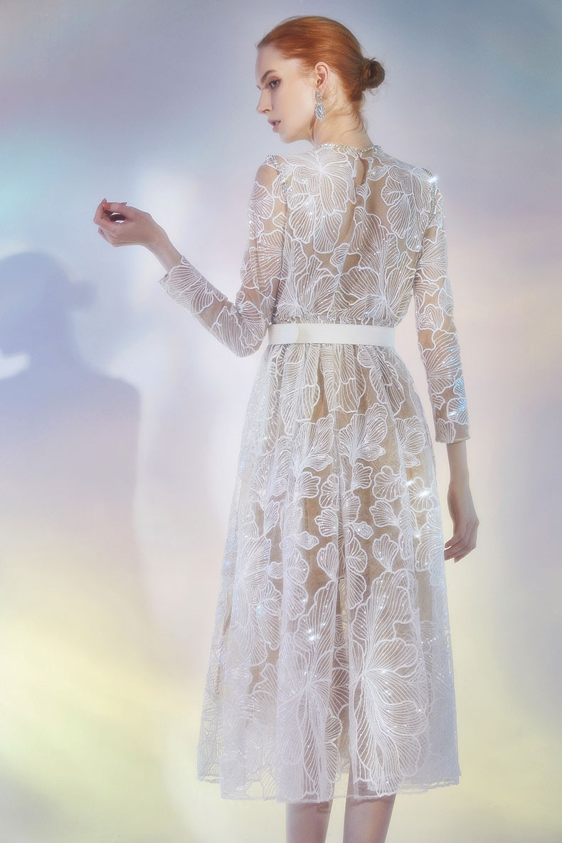 網紗刺繡 亮片鑲鑽透膚洋裝(附襯裙)