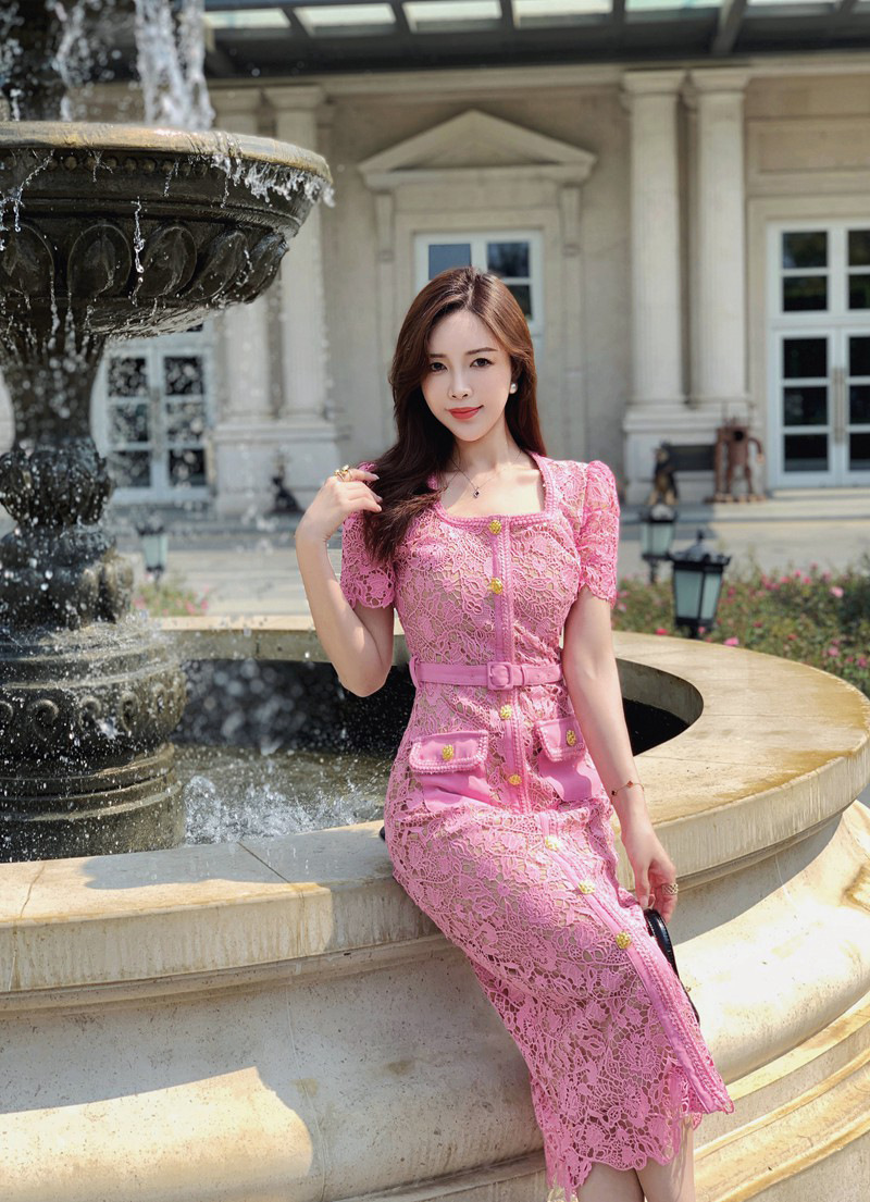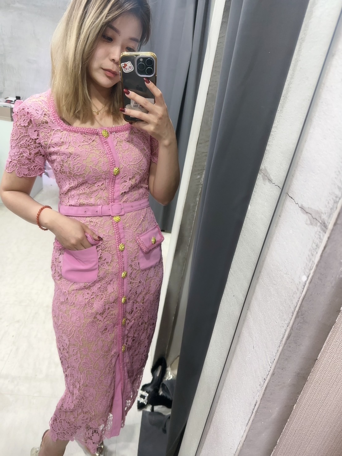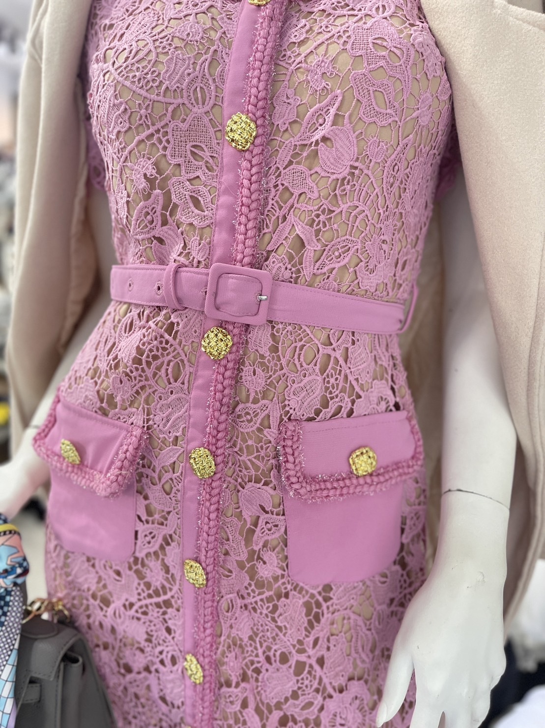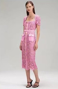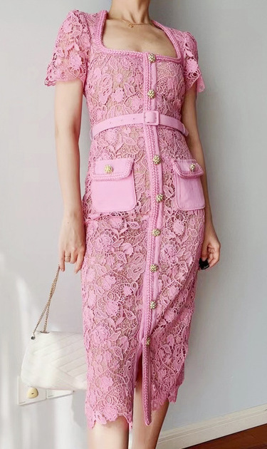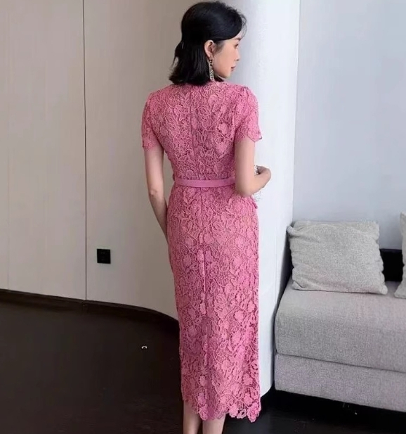 這件洋裝採用精緻水溶蕾絲材質,設計簡約優雅的方領剪裁,搭配飽滿飄逸的袖型,散發迷人女性魅力。貼身修身剪裁,展現纖細曲線。浪漫的粉色系配色,為妳的夏日穿搭注入甜美氛圍。適合多種場合佩戴,從日常休閒到正式場合都能完美駕馭。優雅時尚兼具,打造迷人氣質。