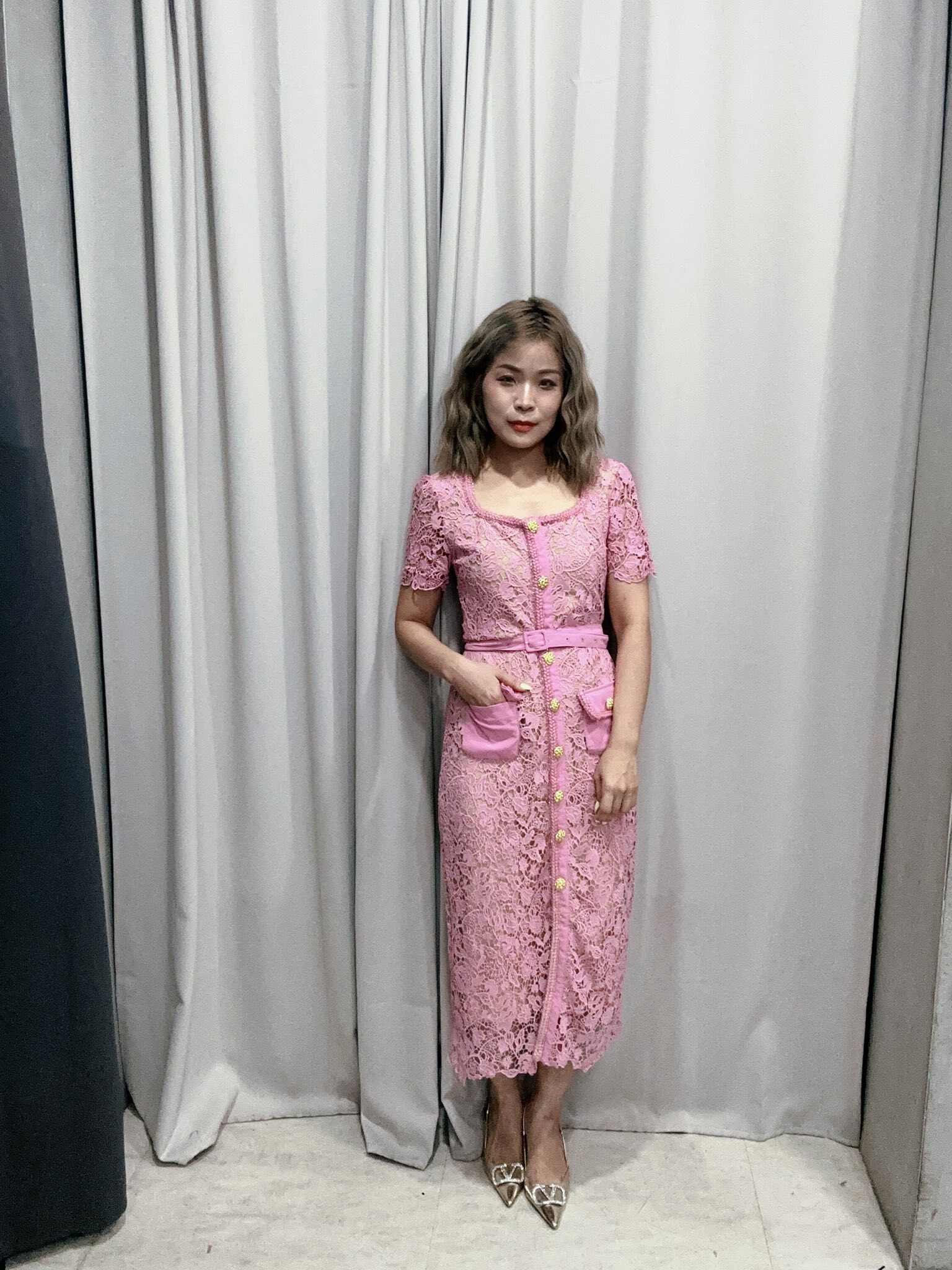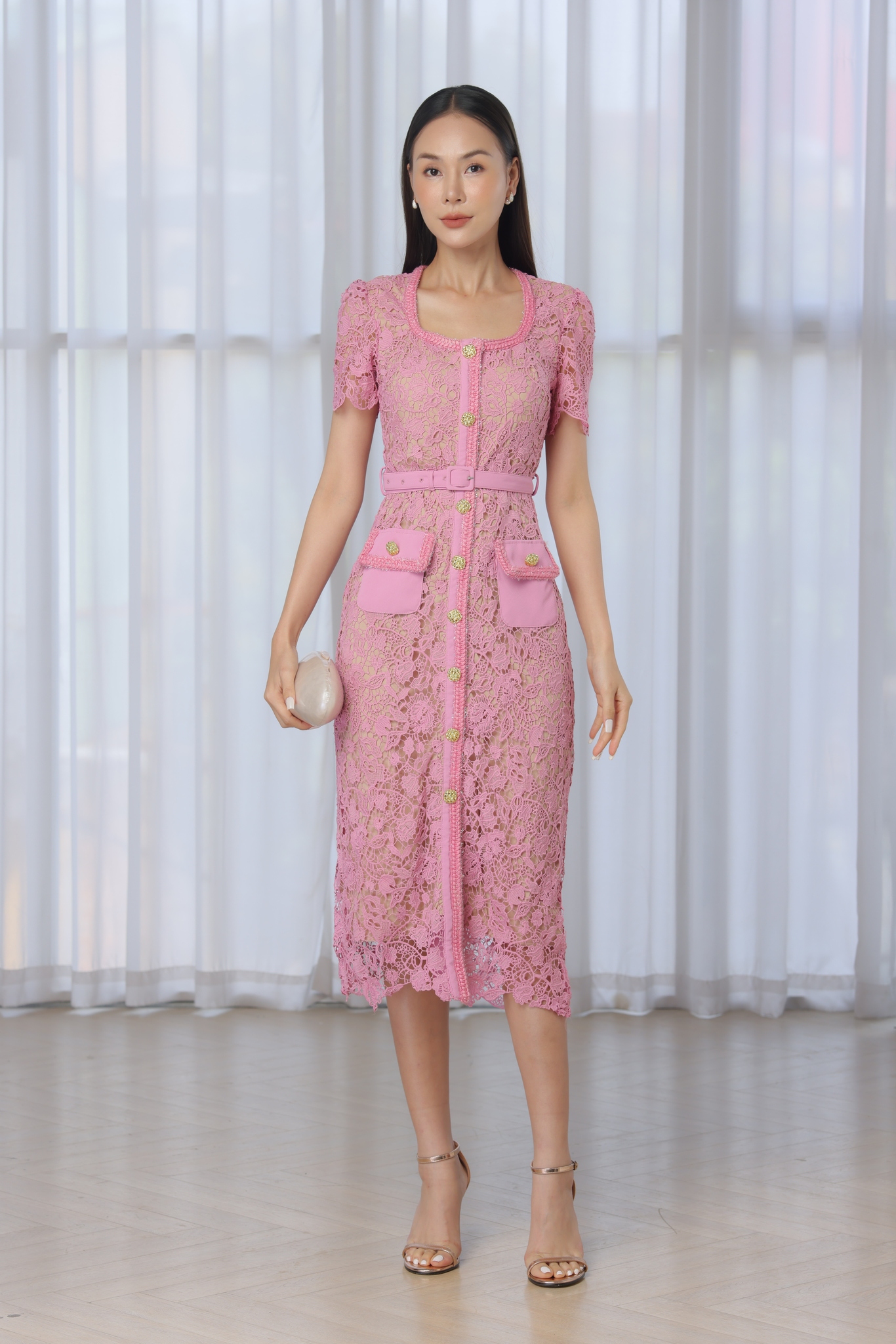 水溶蕾絲的浪漫氣息 這件洋裝採用精緻水溶蕾絲設計,營造出柔和迷人的氛圍。優雅方領線條修飾臉型,展現女性優雅氣質。