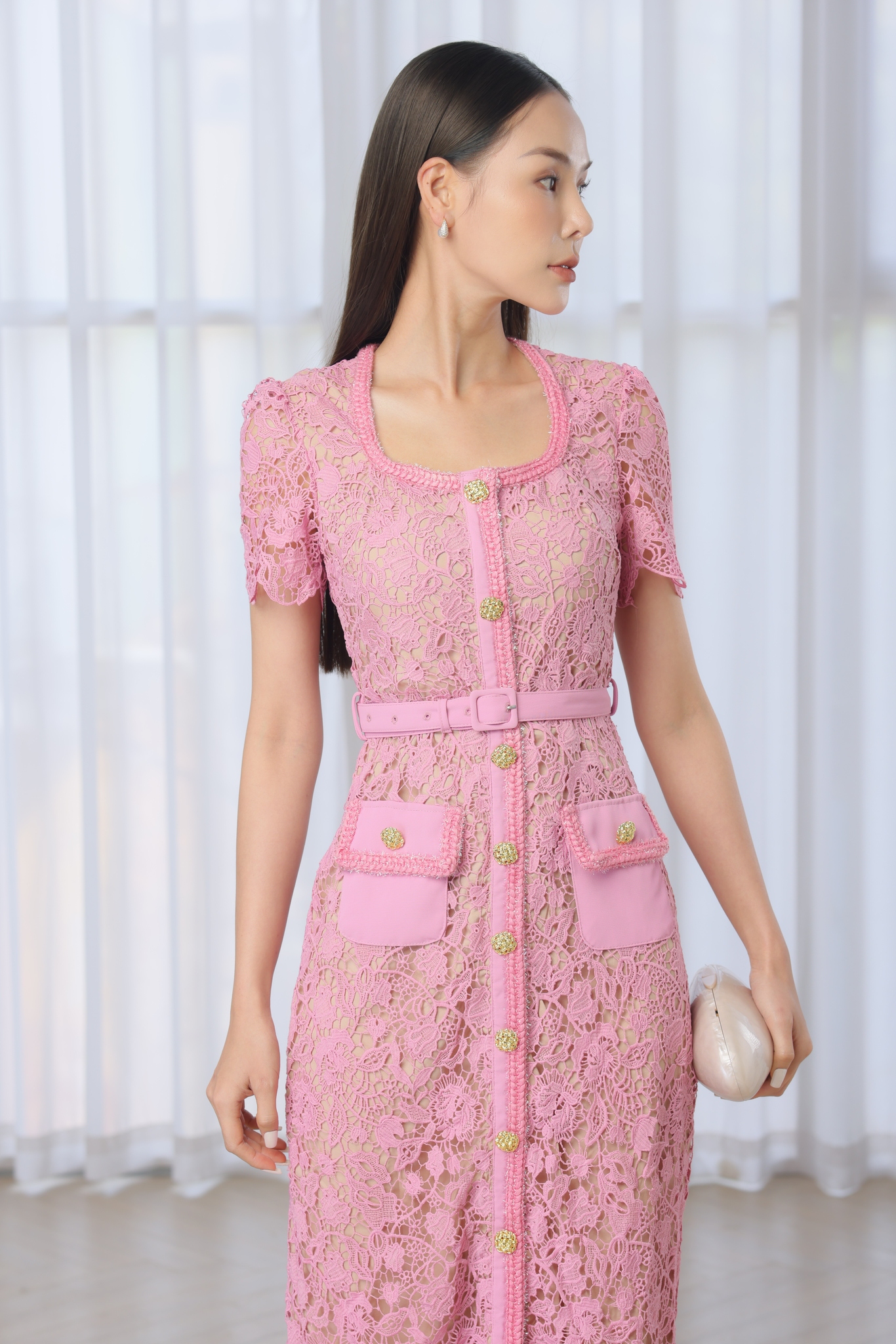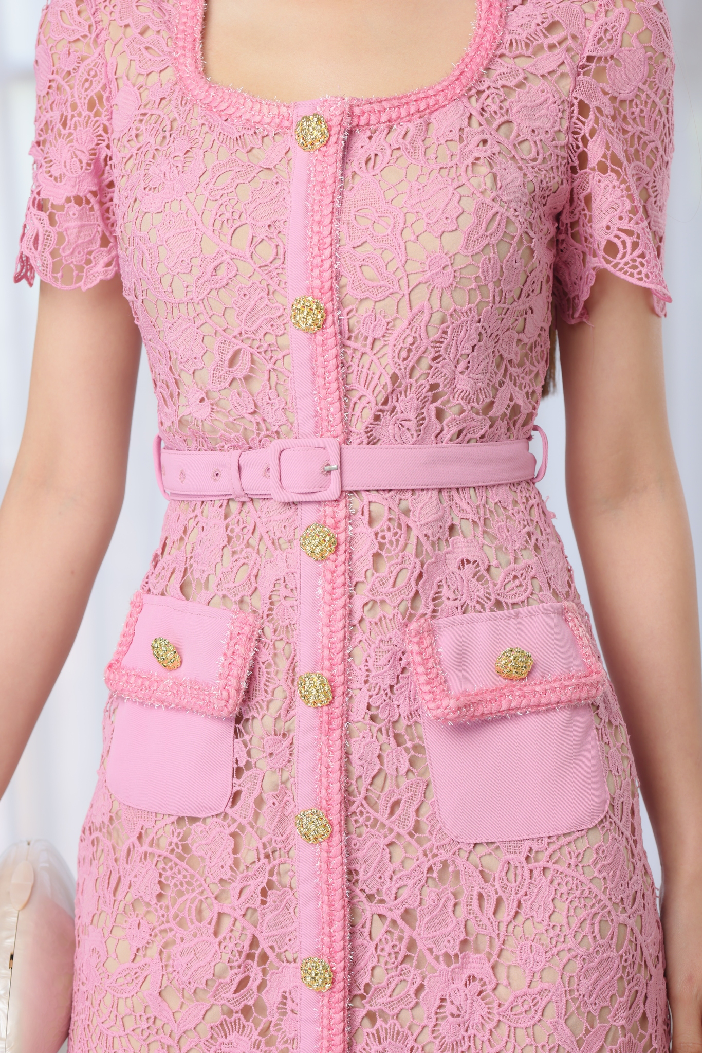 柔和水溶蕾絲打造優雅方領造型。