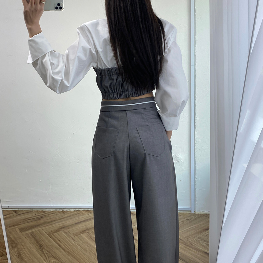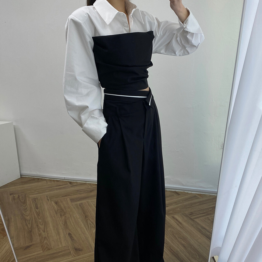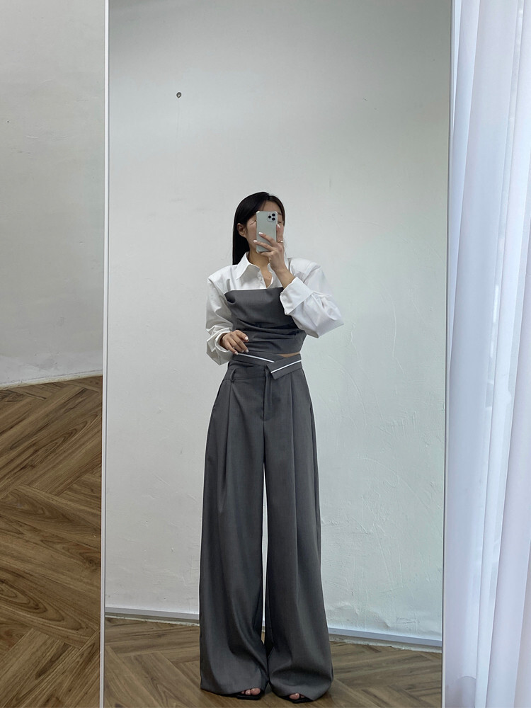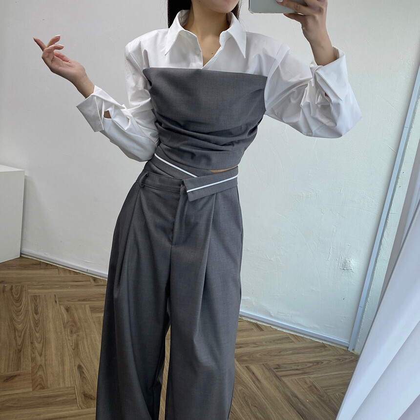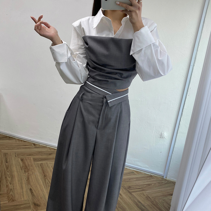 拼接假2件襯衫+ 高腰寬褲(2件組)(灰/黑)