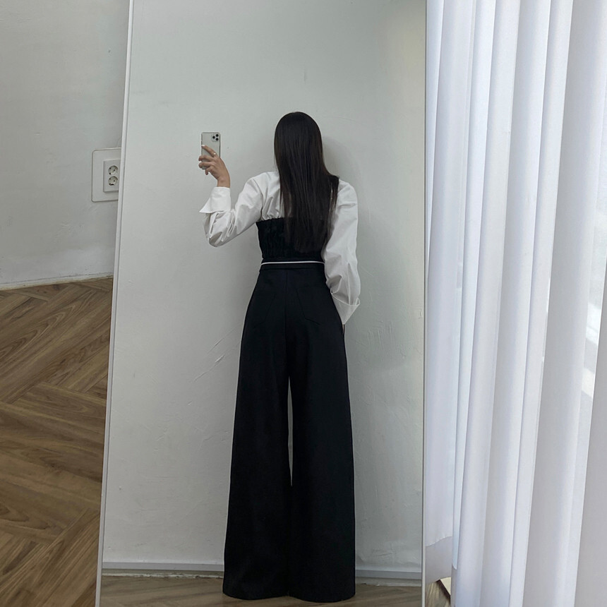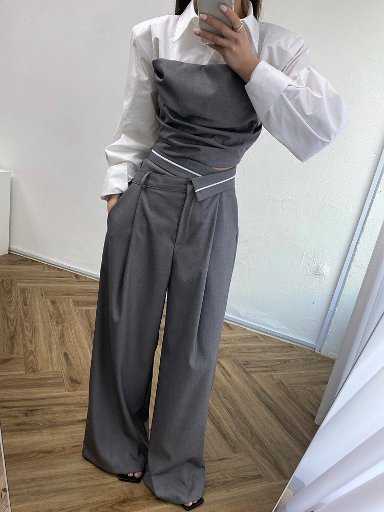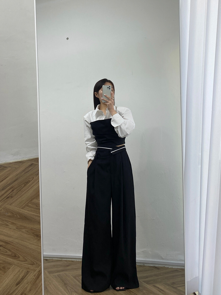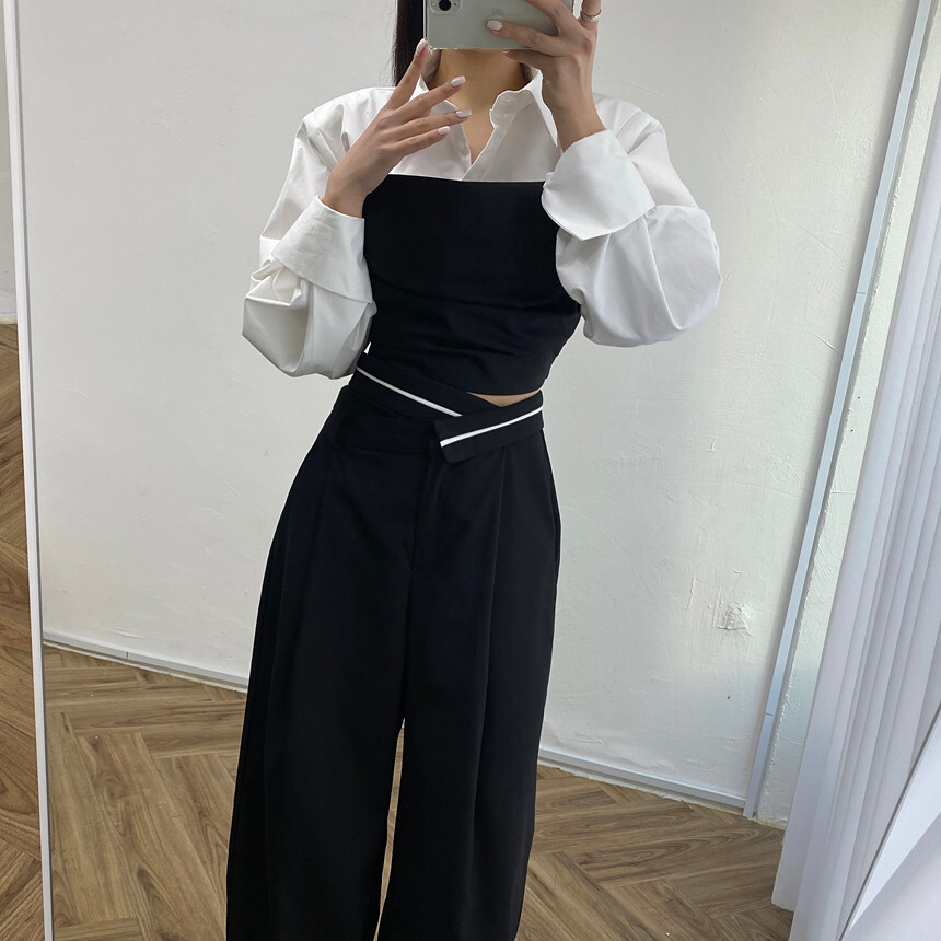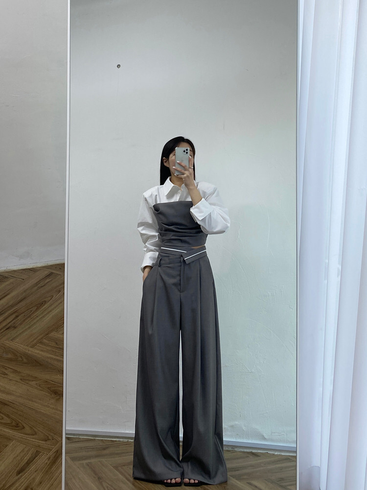 拼接假2件襯衫+ 高腰寬褲(2件組)(灰/黑)