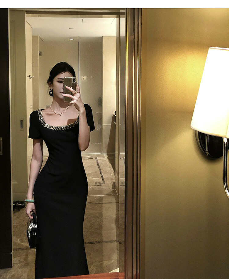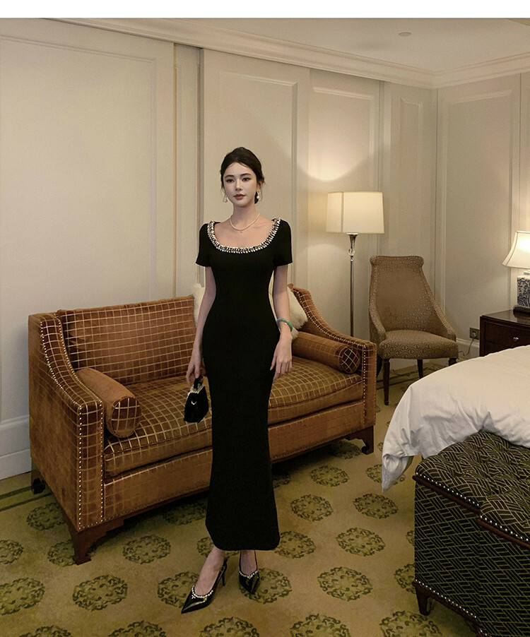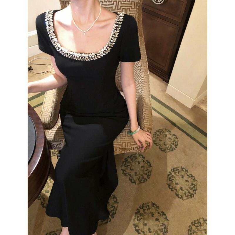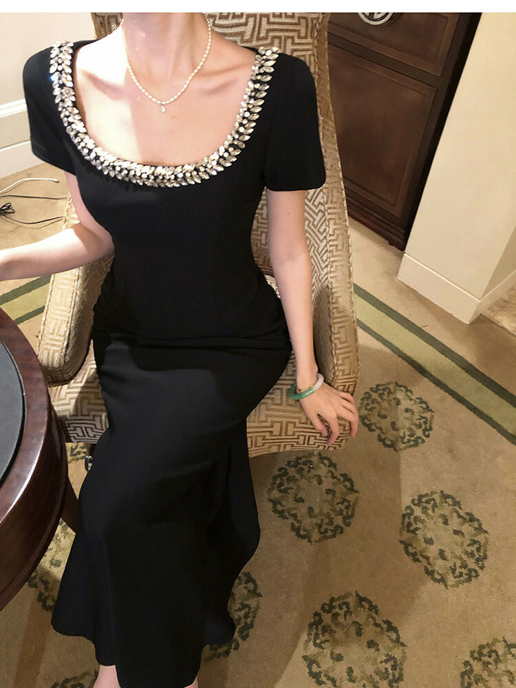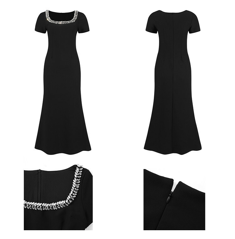 這件黑色洋裝擁有鑲嵌水鑽的U型領口,線條設計能延伸修飾鎖骨曲線。精心剪裁的版型包覆身形,在腰部收緊並略微展開至膝蓋,展現女性曲線之美。短袖設計透露優雅而不失時尚洗練。精緻優雅的整體風格,適合擔任各式正式場合的首選服飾。