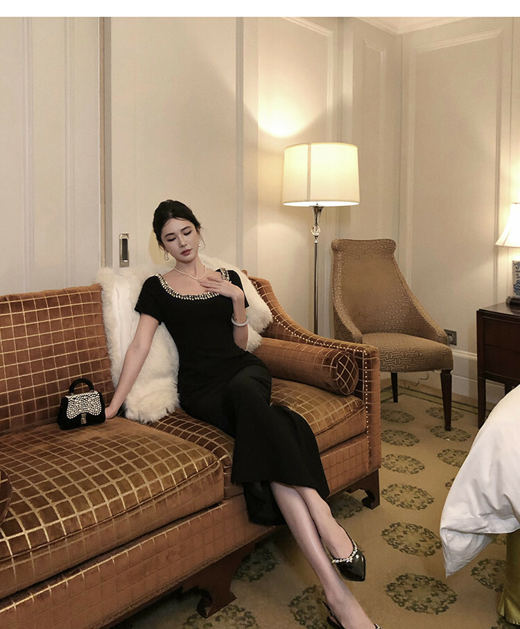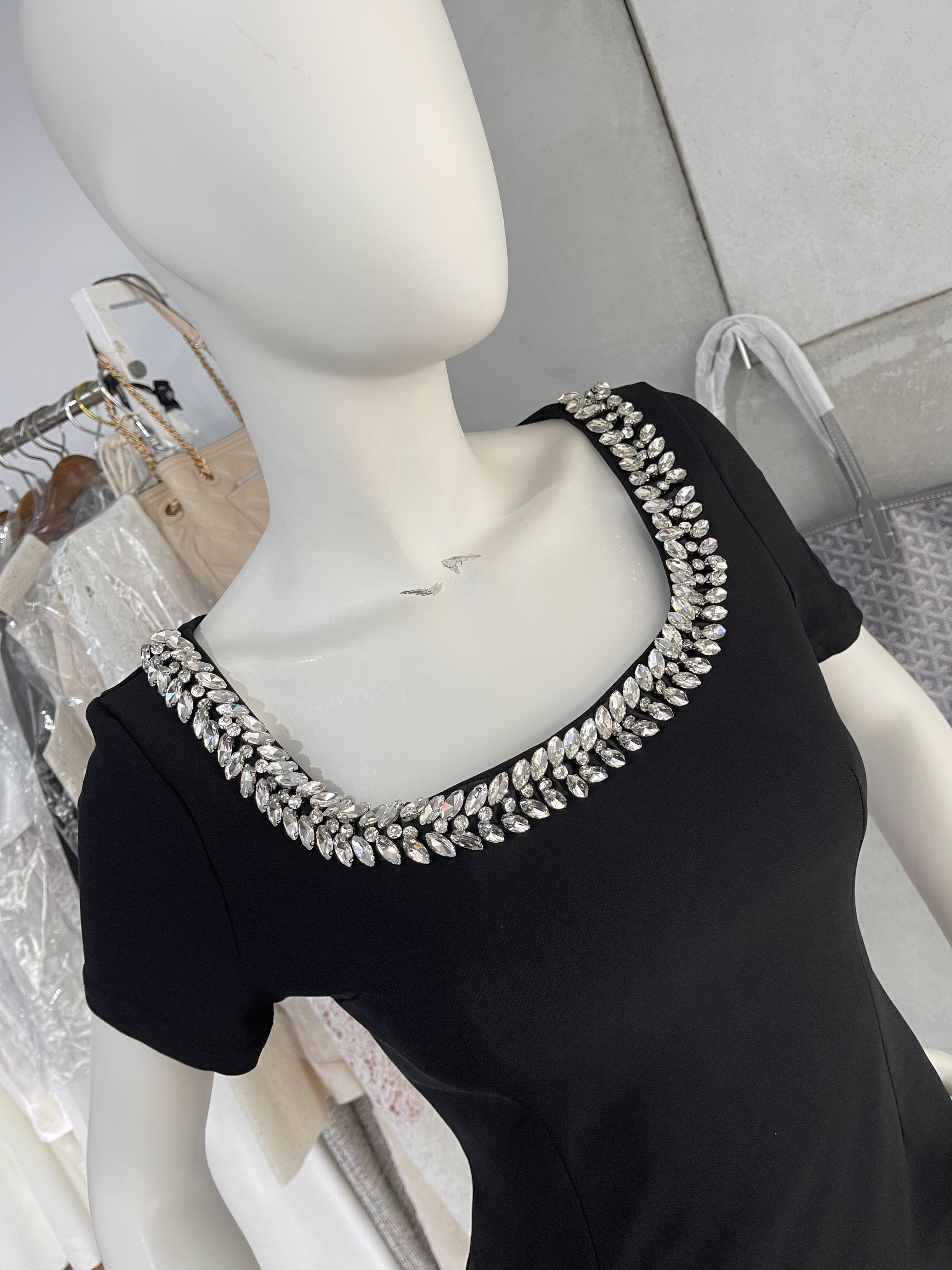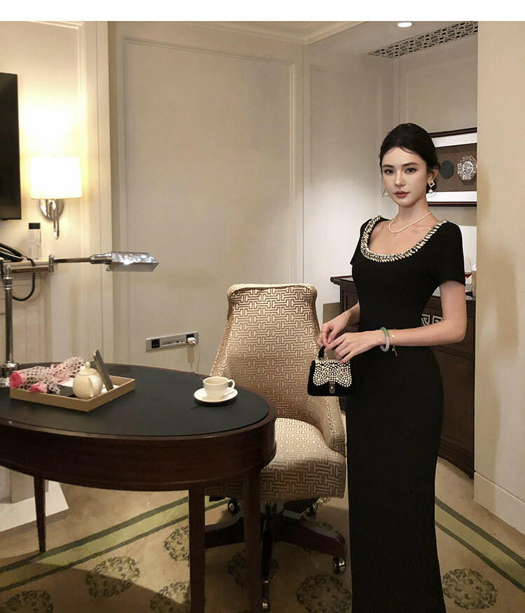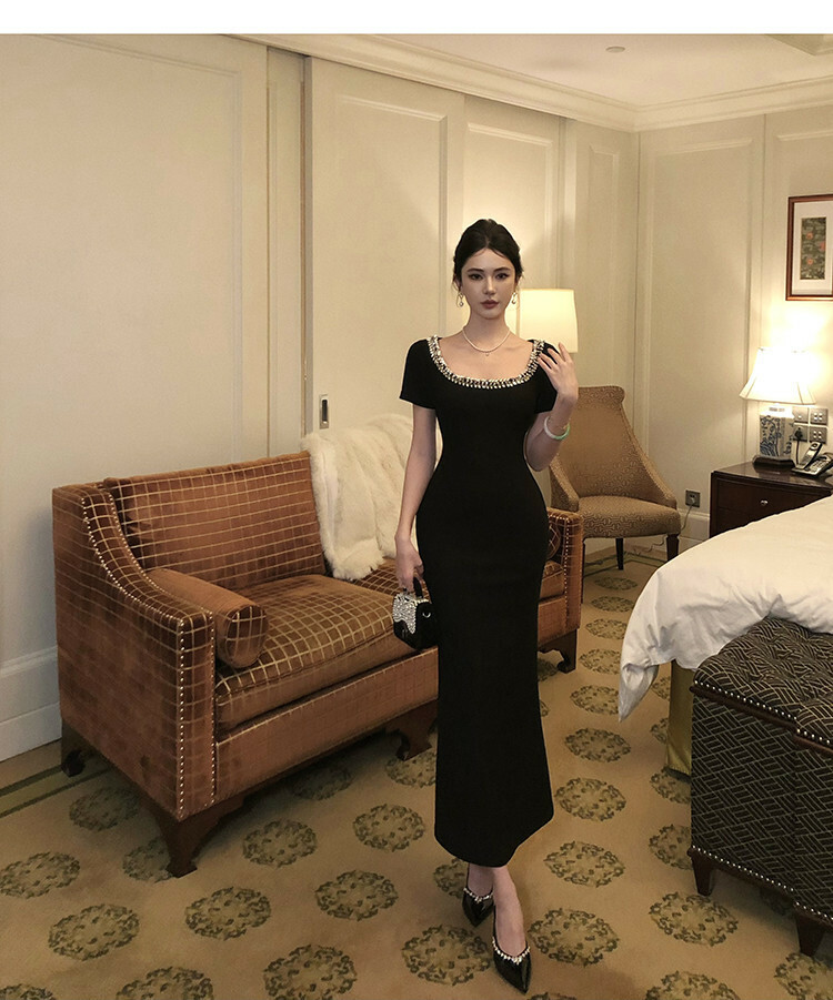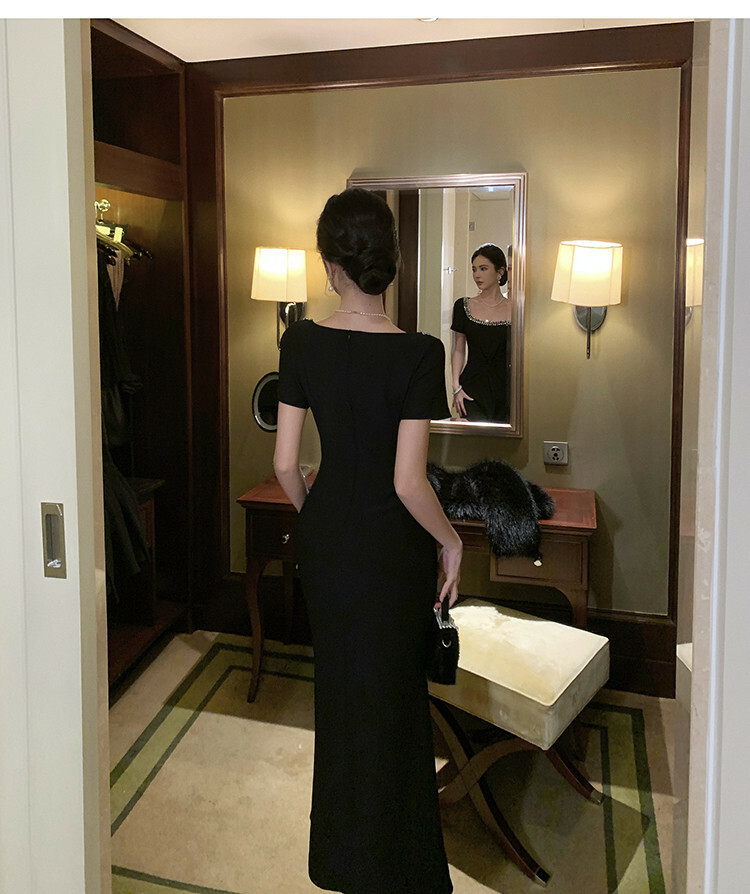 這件黑色洋裝擁有鑲嵌水鑽的U型領口,線條設計能延伸修飾鎖骨曲線。精心剪裁的版型包覆身形,在腰部收緊並略微展開至膝蓋,展現女性曲線之美。短袖設計透露優雅而不失時尚洗練。精緻優雅的整體風格,適合擔任各式正式場合的首選服飾。