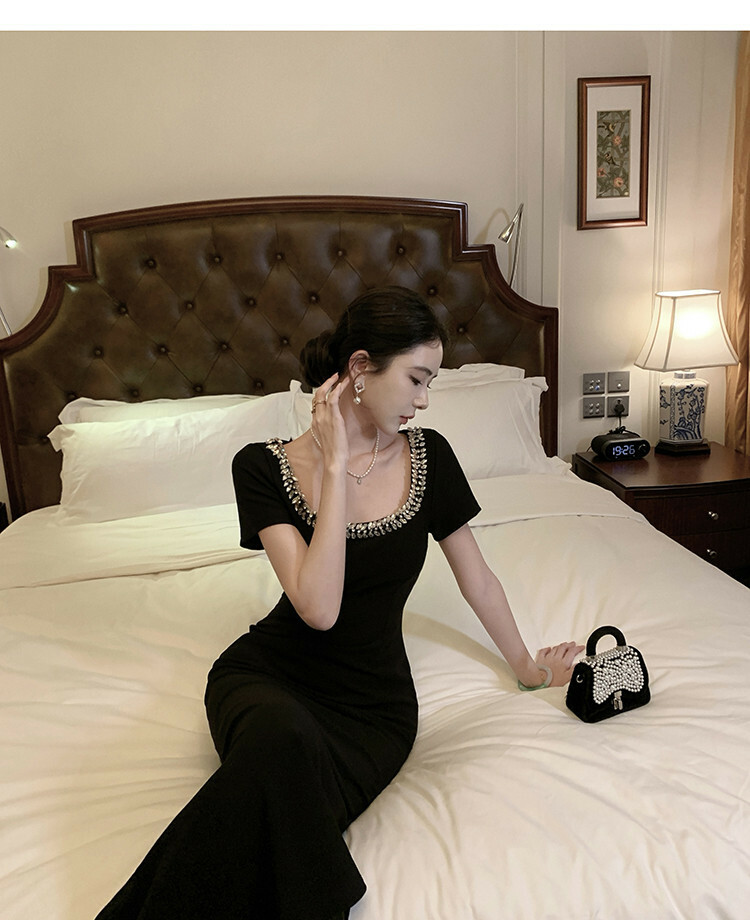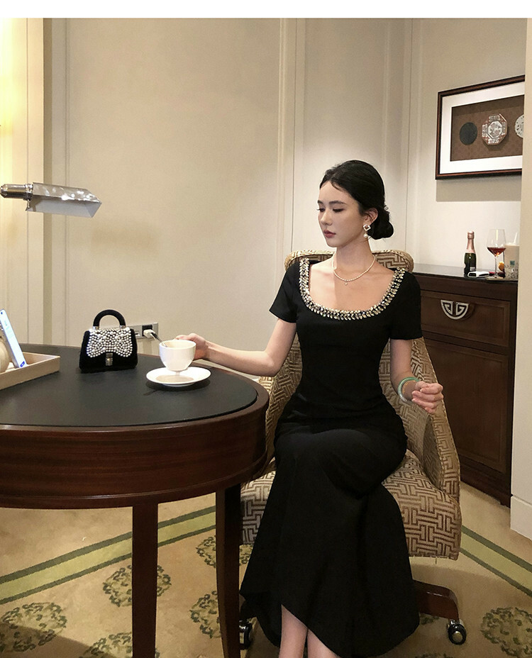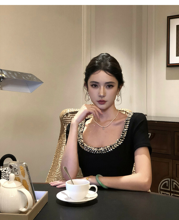鎖骨控! 杏仁眼水鑽U領收腰短袖洋裝