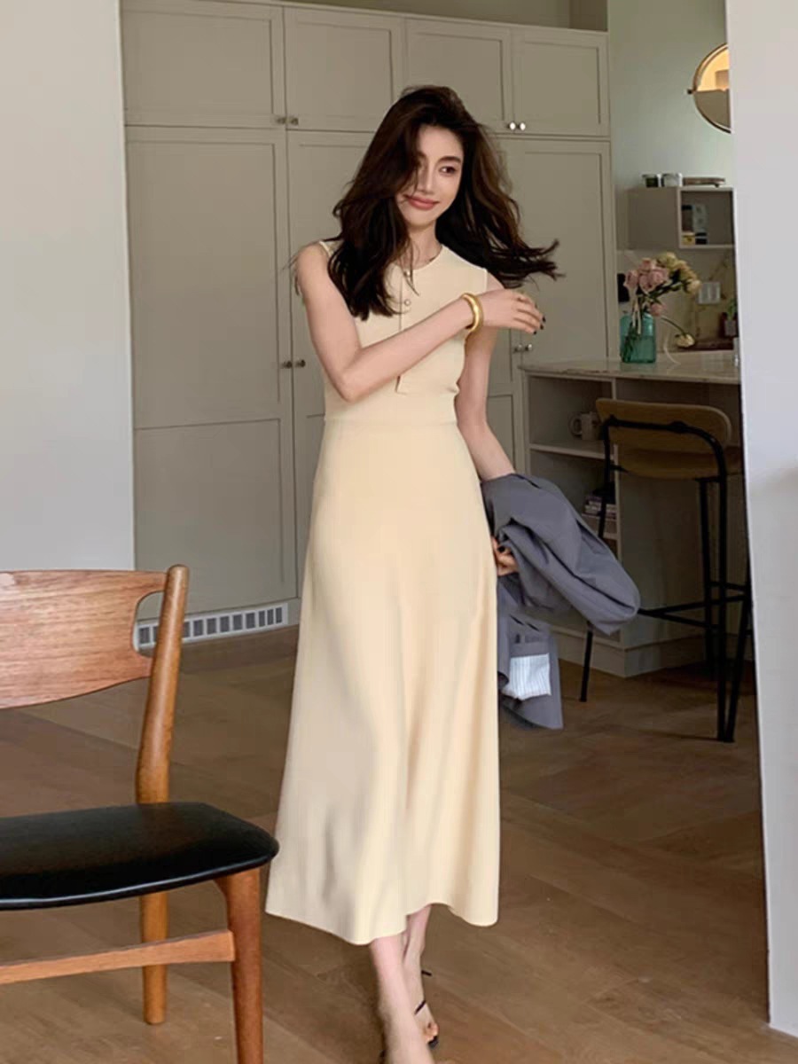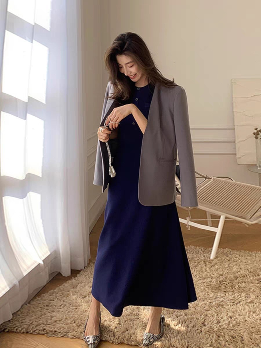 氣質簡約收腰長洋裝(杏/深藍)