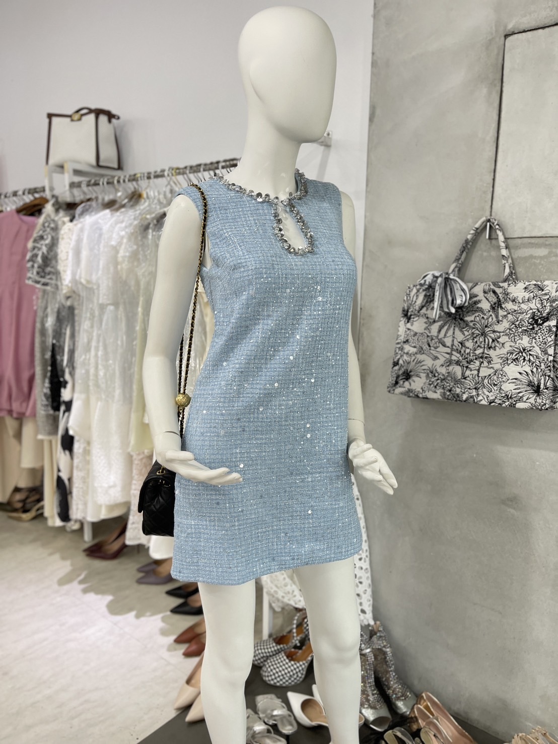 水滴領 亮片薄毛尼洋裝(白/藍)