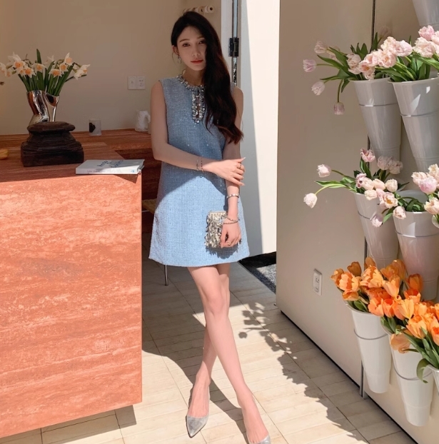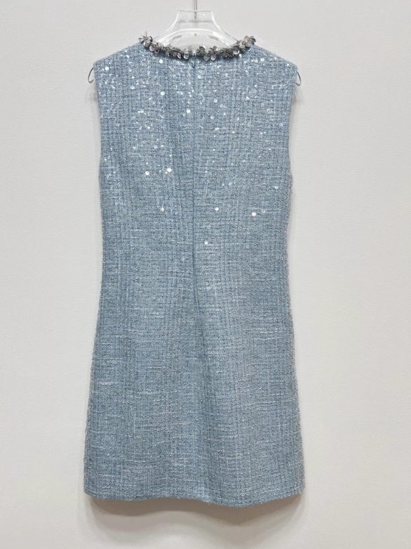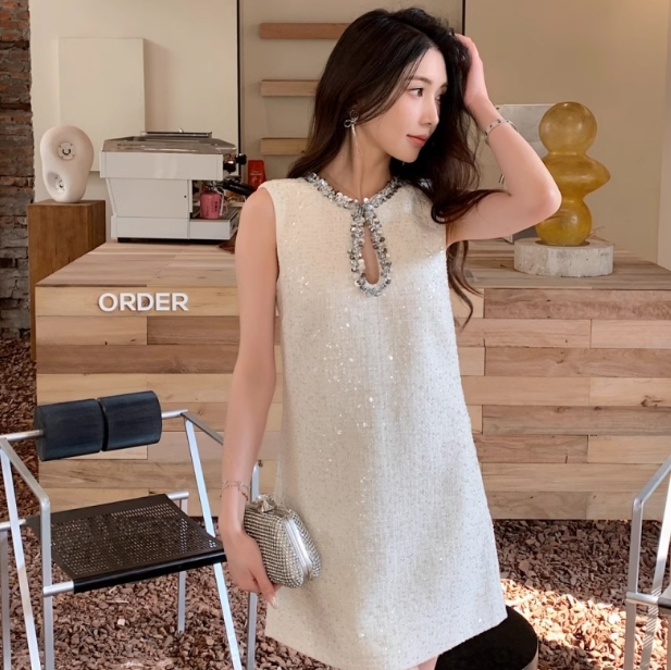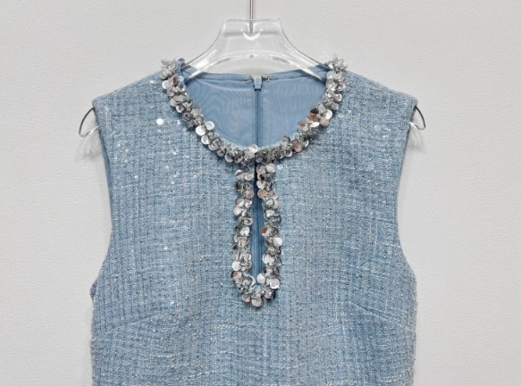 滿帶有時尚感的水滴領設計,讓整體造型更為典雅動人。亮片點綴帶來華麗迷人的視覺效果,搭配柔軟舒適的薄毛尼面料,穿著舒適又有型。白色和藍色兩款讓妳有更多選擇,無論是甜美歡愉或是優雅高貴的場合,都能完美展現個人風采。