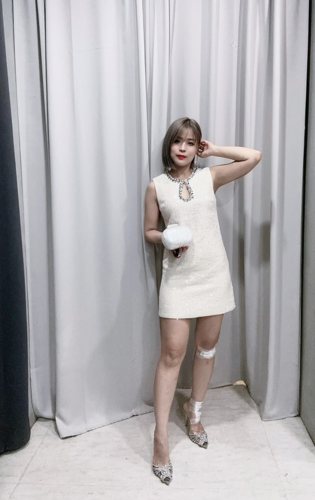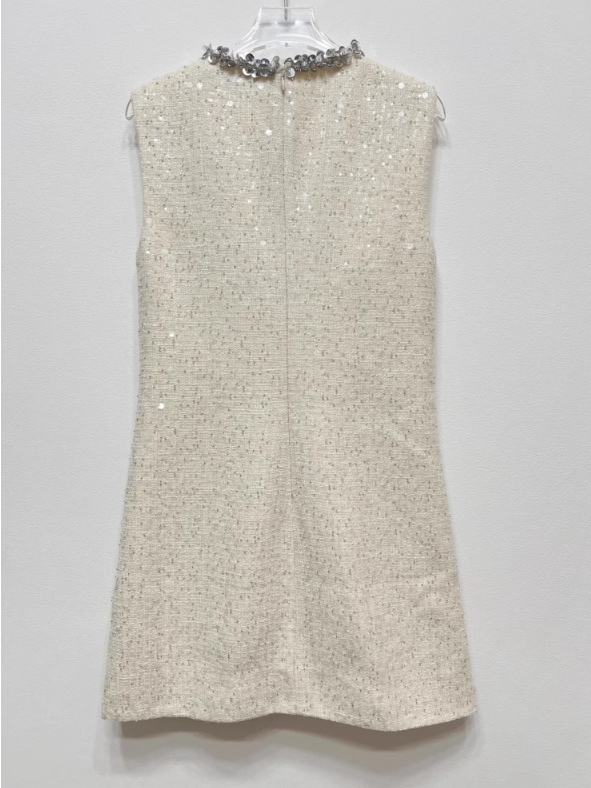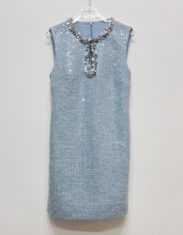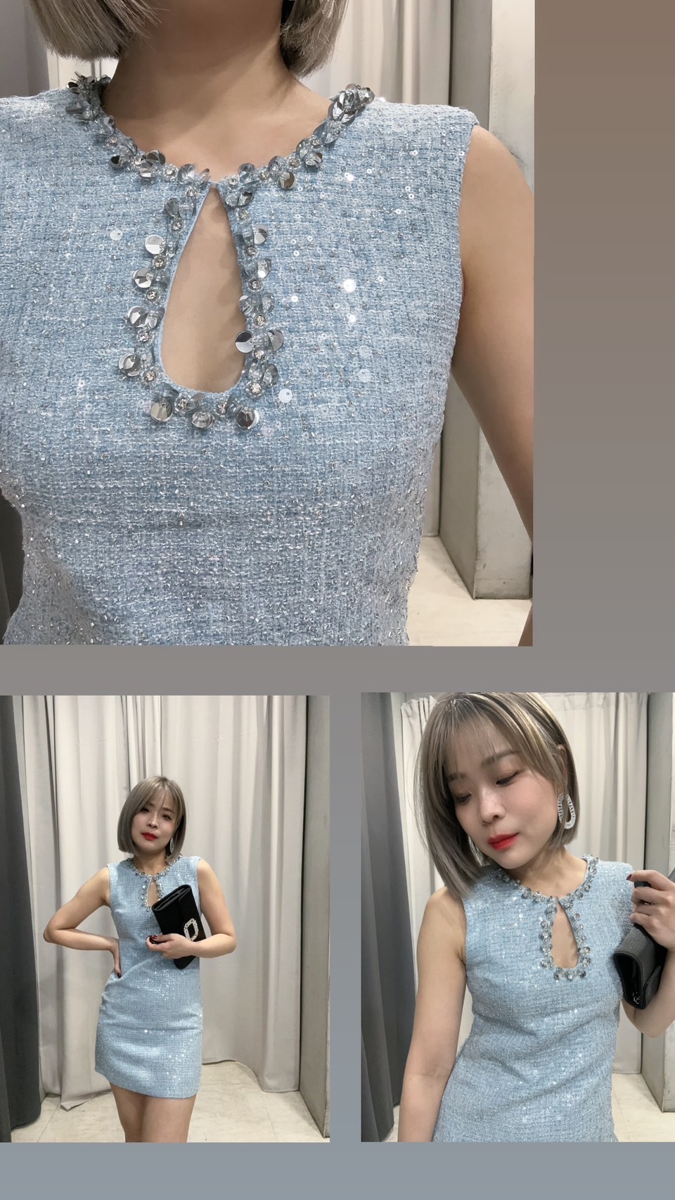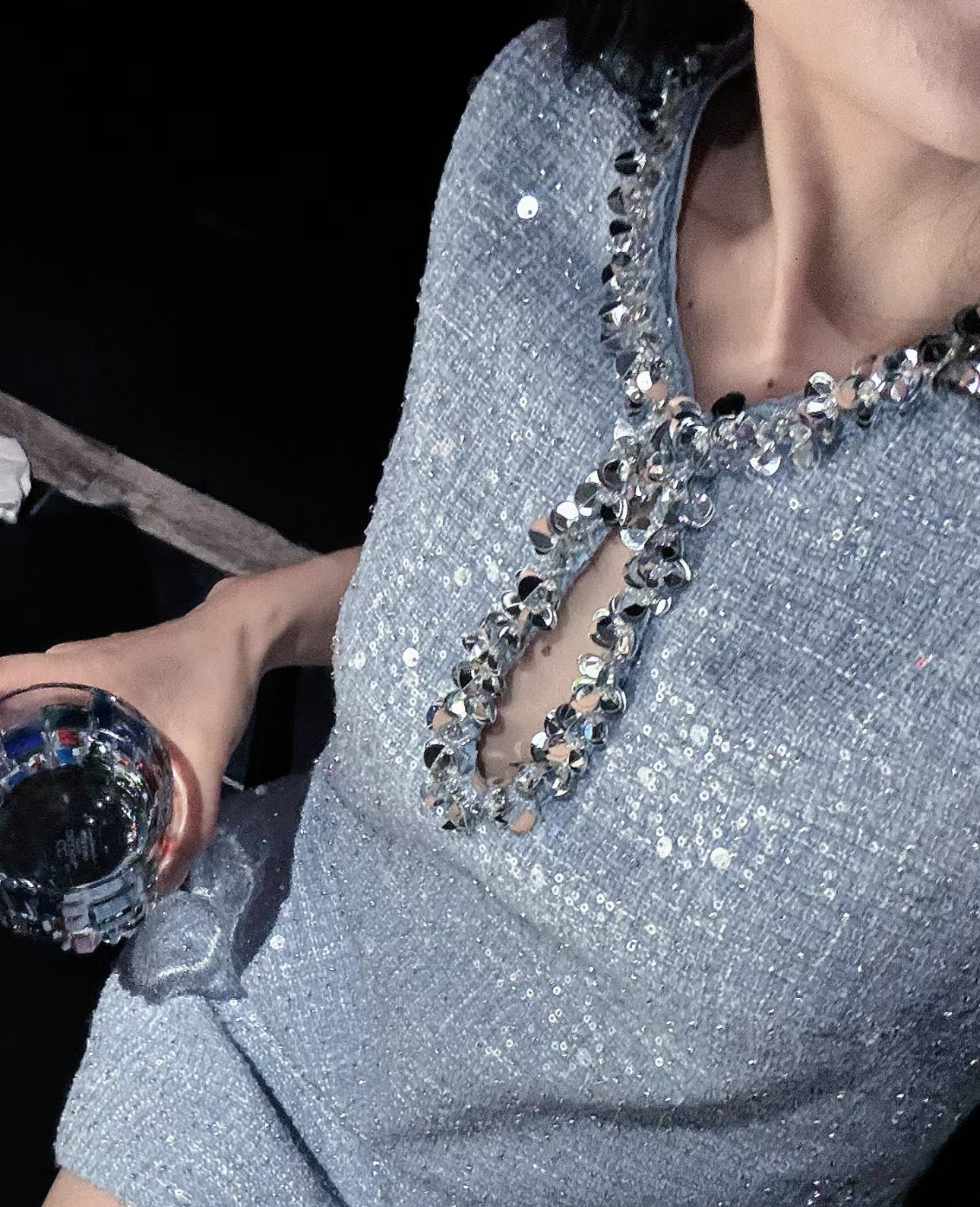 華麗閃耀的亮片細節,為整件洋裝增添華貴奢華的氣質。輕盈柔軟的薄毛尼面料,貼身剪裁展現修飾身型,優雅大方。前領為獨特水滴造型,別具巧思。適合多種場合,從正式場合到日常時尚都能輕鬆駕馭。