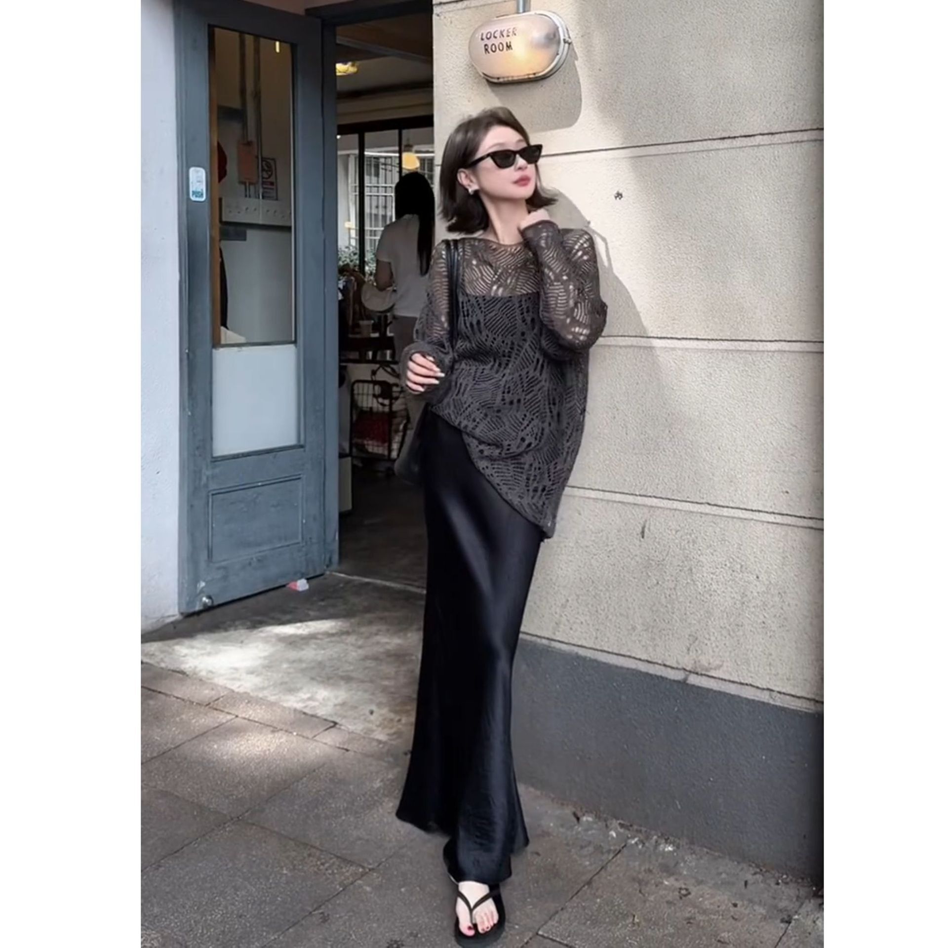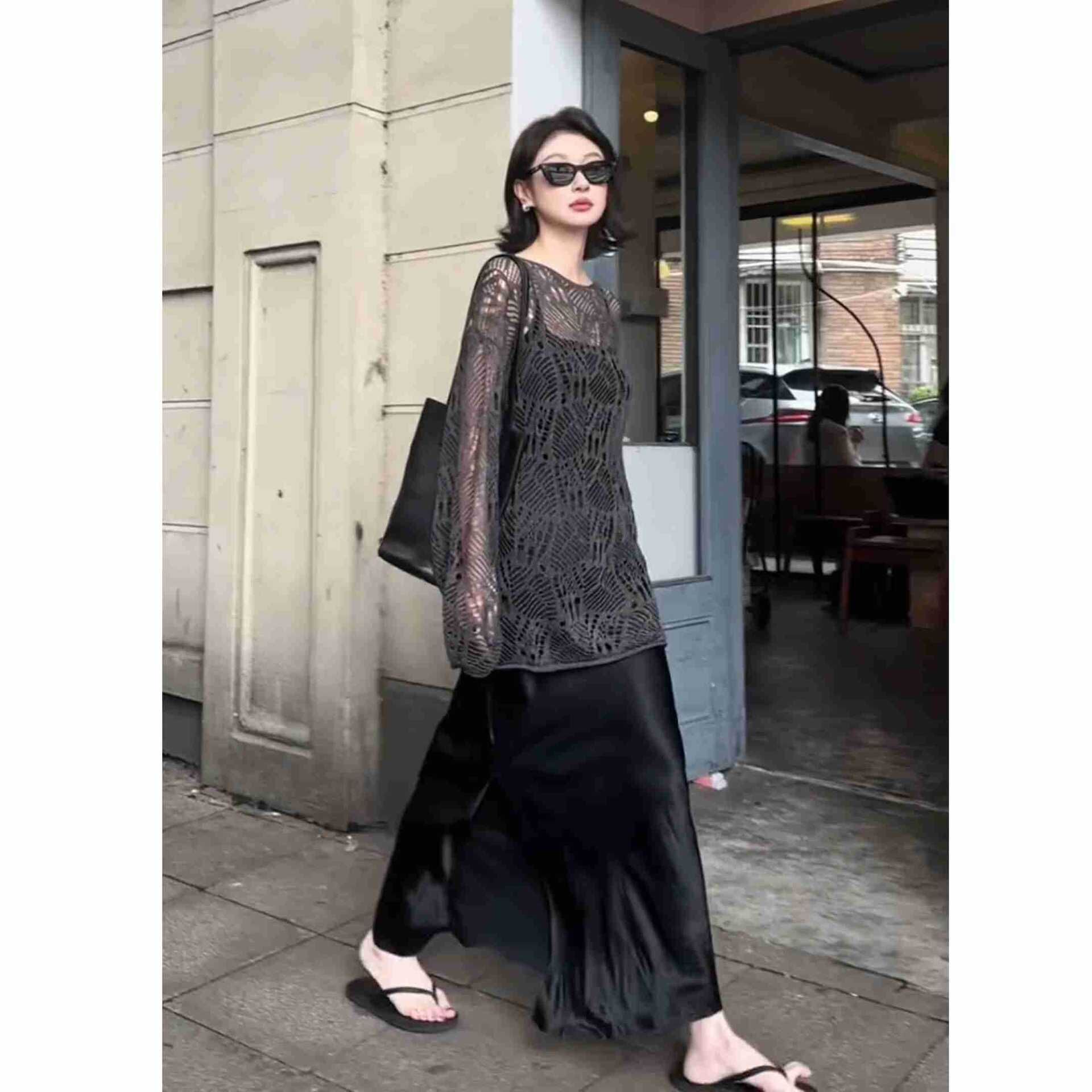 慵懶性感 簍空罩衫+綢緞魚尾裙