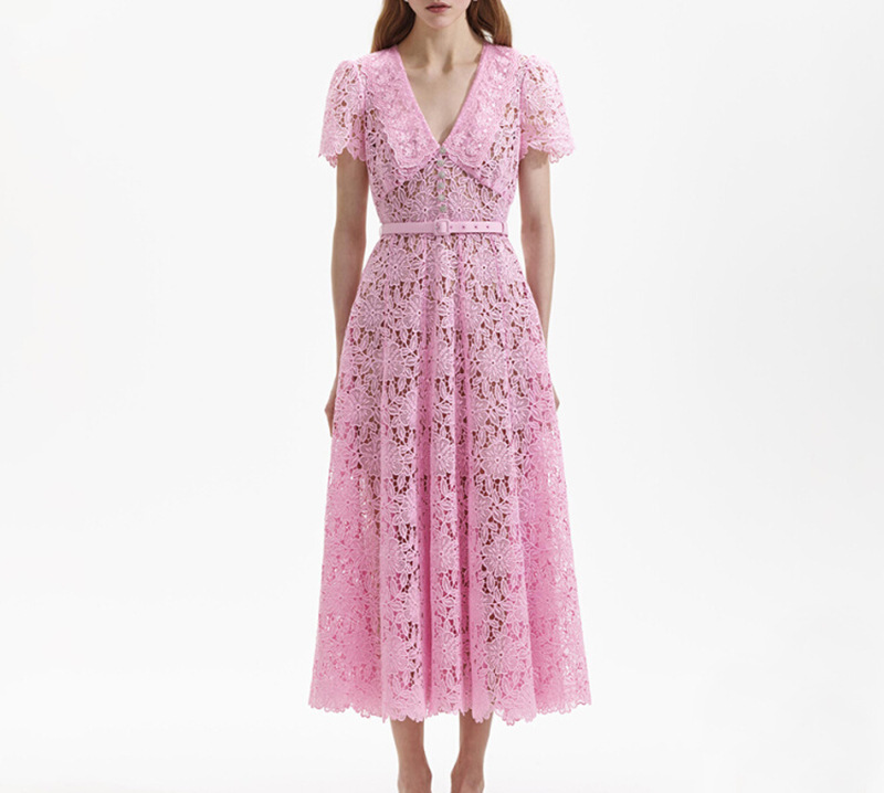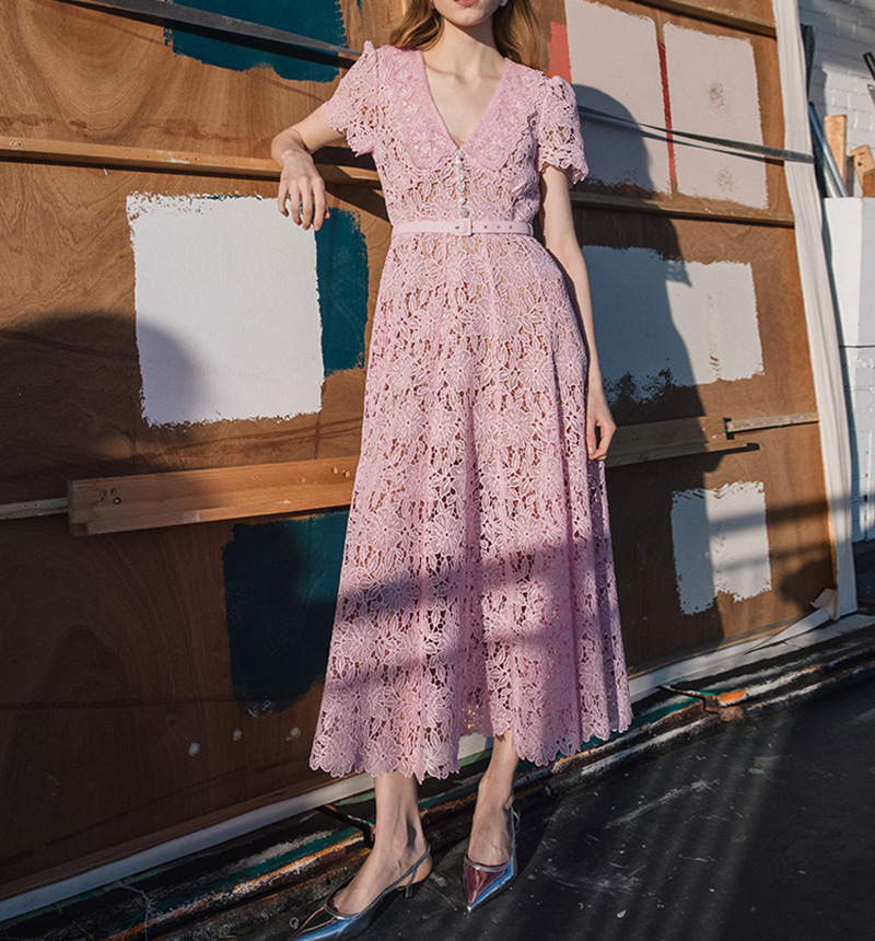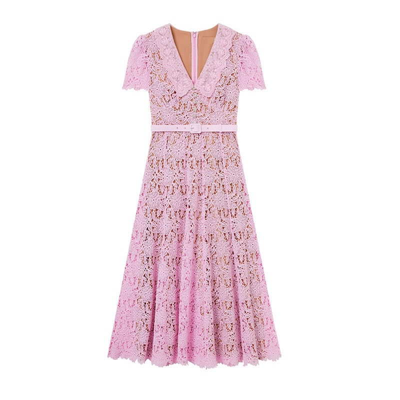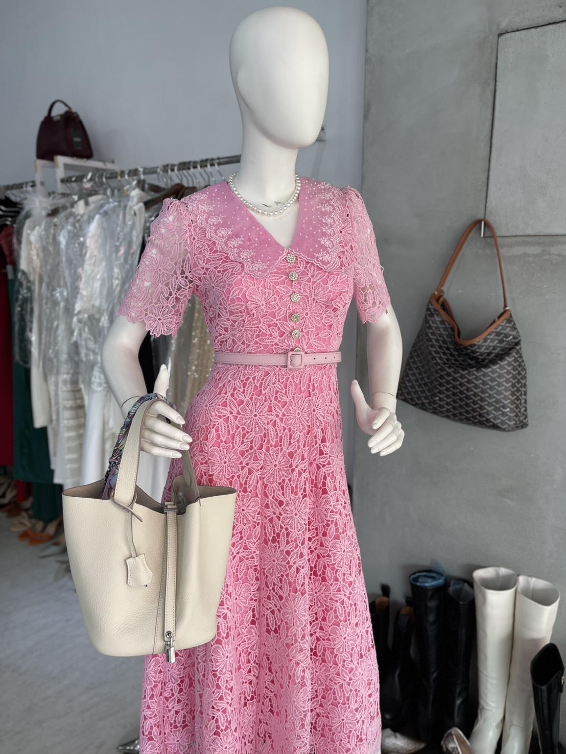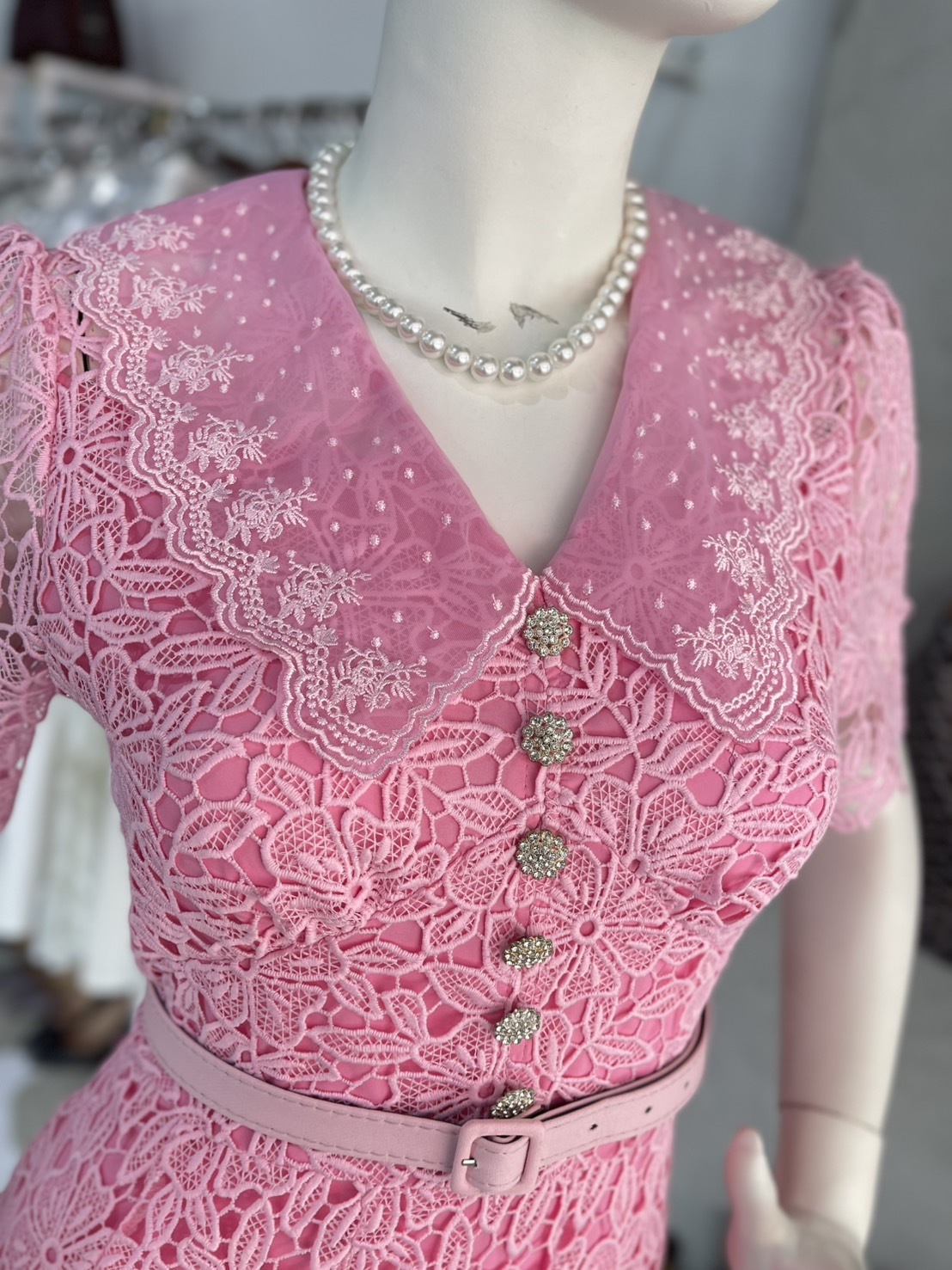 這款水溶蕾絲長洋裝從上至下盡顯淡雅優雅氛圍。精緻蕾絲設計在襯托出優雅垂墜感的同時,也展現輕盈自然的氣質。嫩粉色調更增添了春天的清新韻味,適合各式場合佩戴。此洋裝剪裁合身,亦能完美展現甜美曲線。無論是約會、聚會或是日常穿搭,都能為妳增添迷人魅力。