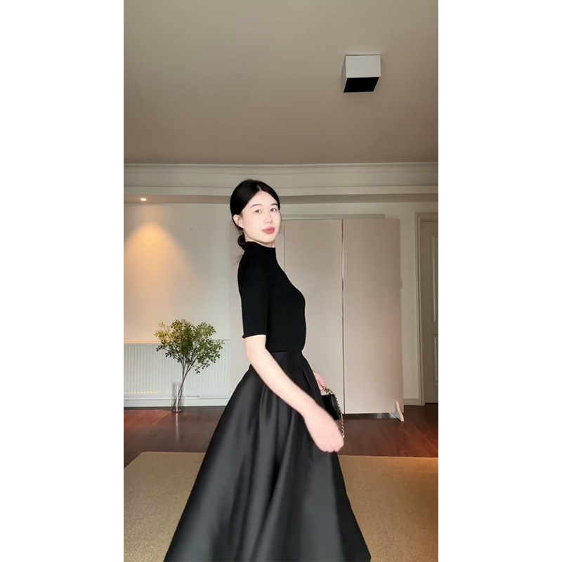 赫本優雅 五分袖+收腰綢緞圓裙(2件組)