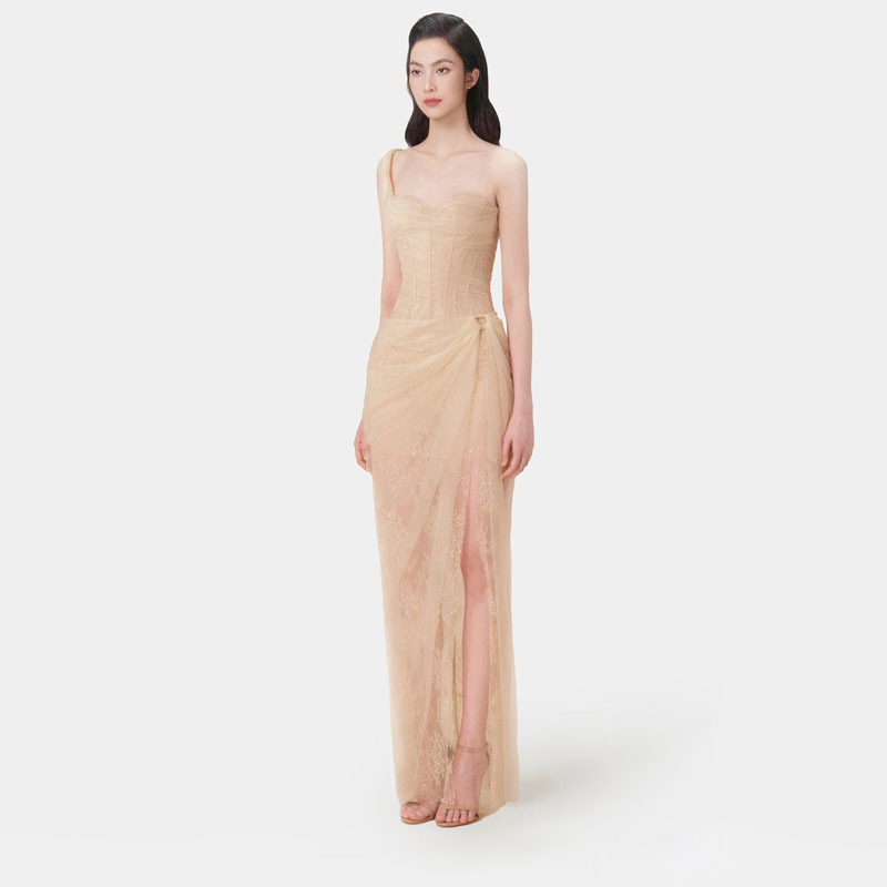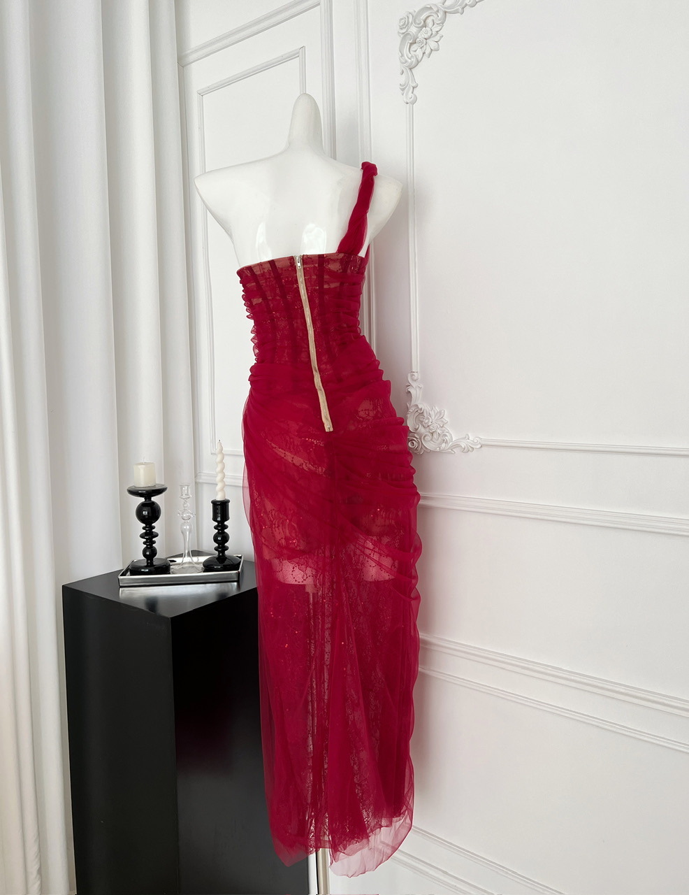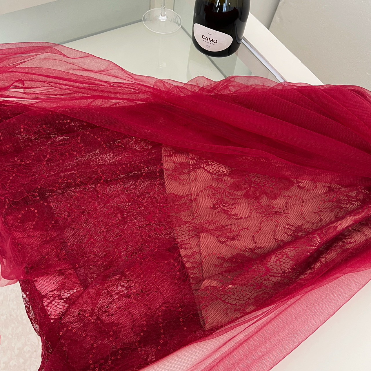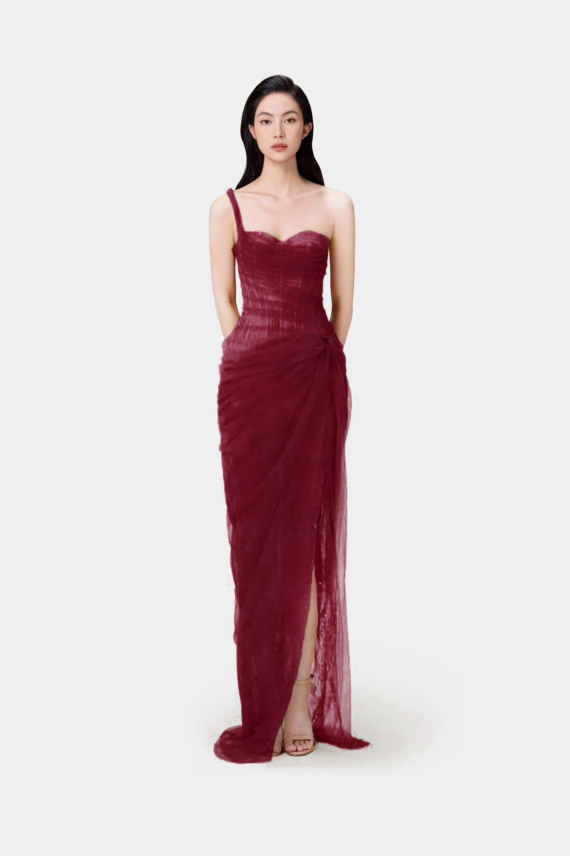 迷人的酒紅色調,搭配綻放立體蕾絲細節的設計,展現出優雅拘謹又不失時尚風格。魚骨束腰的剪裁修飾曲線,令身形顯得纖細修長。垂墜感十足的網紗材質,營造夢幻迷人的氛圍。無論是正式場合或是特別的約會,這款長禮服定能成為矚目焦點。