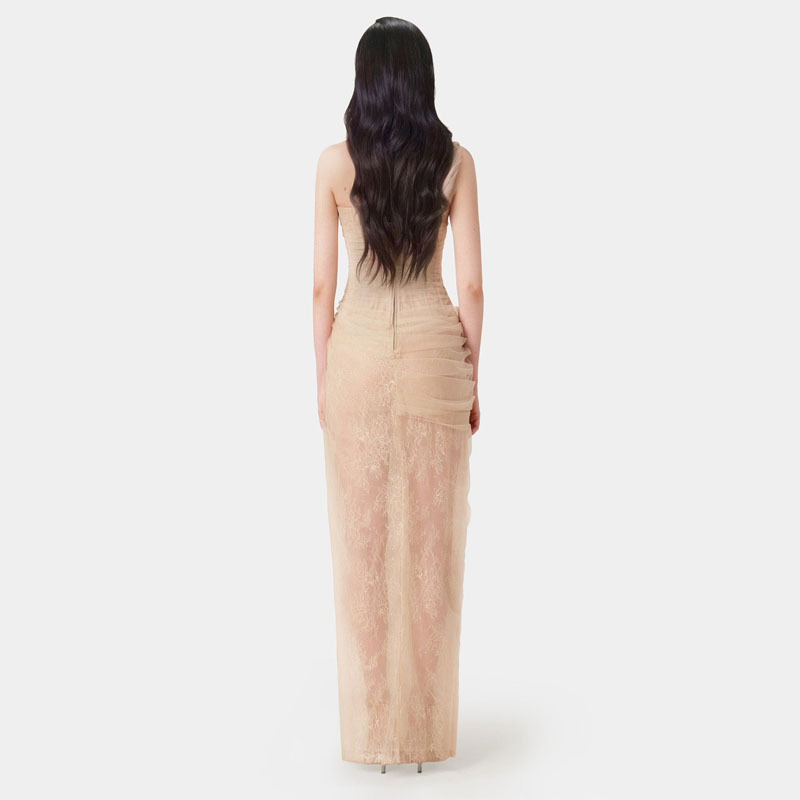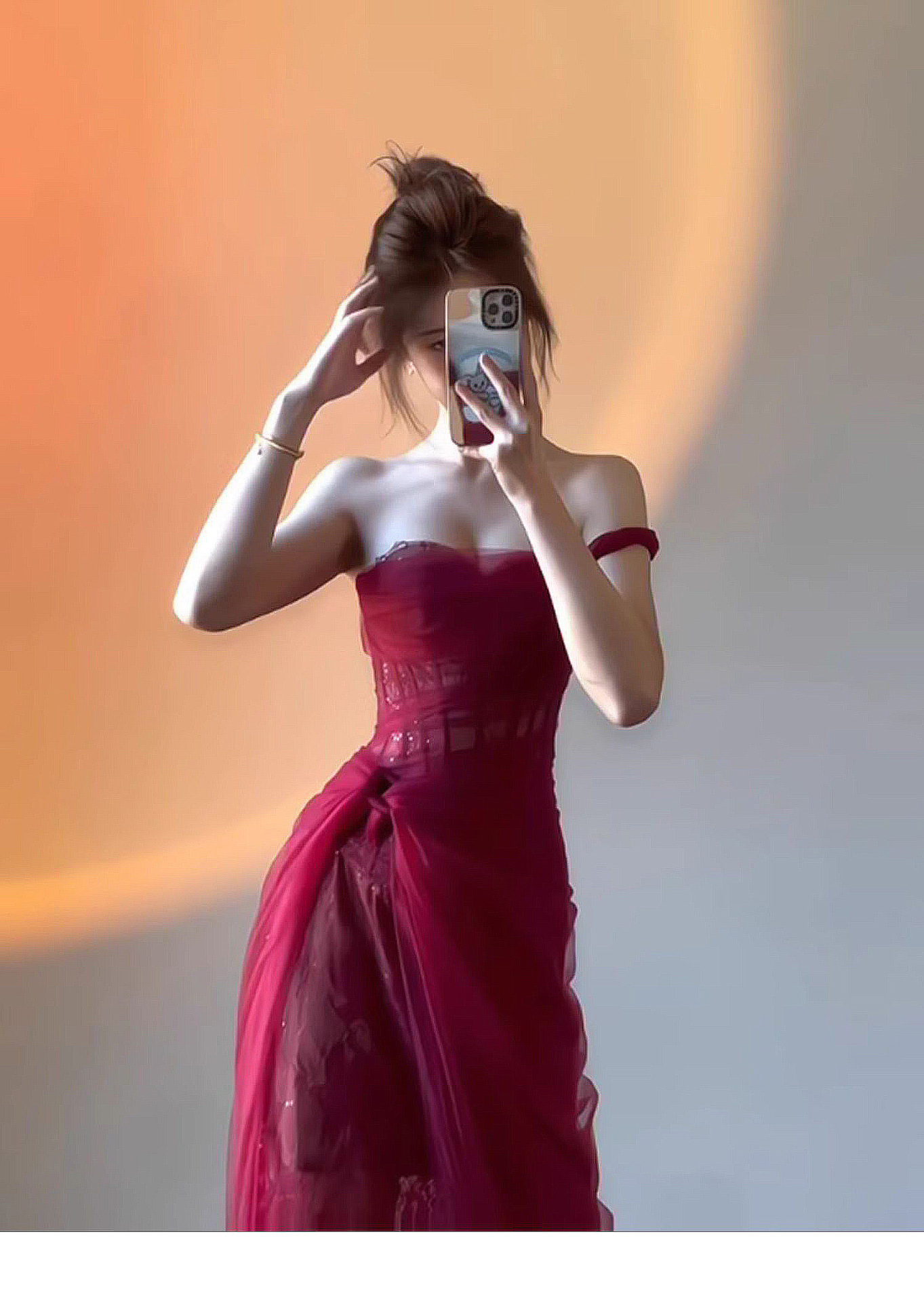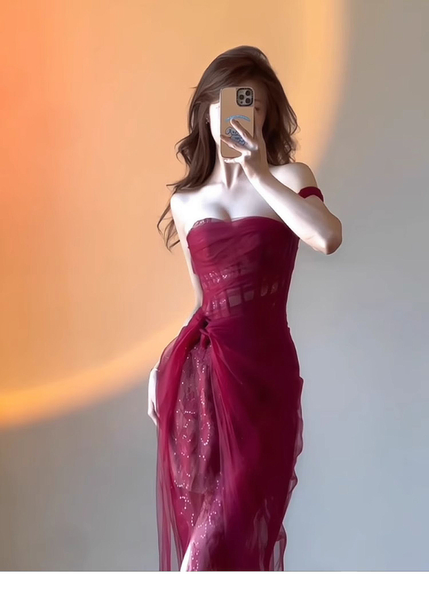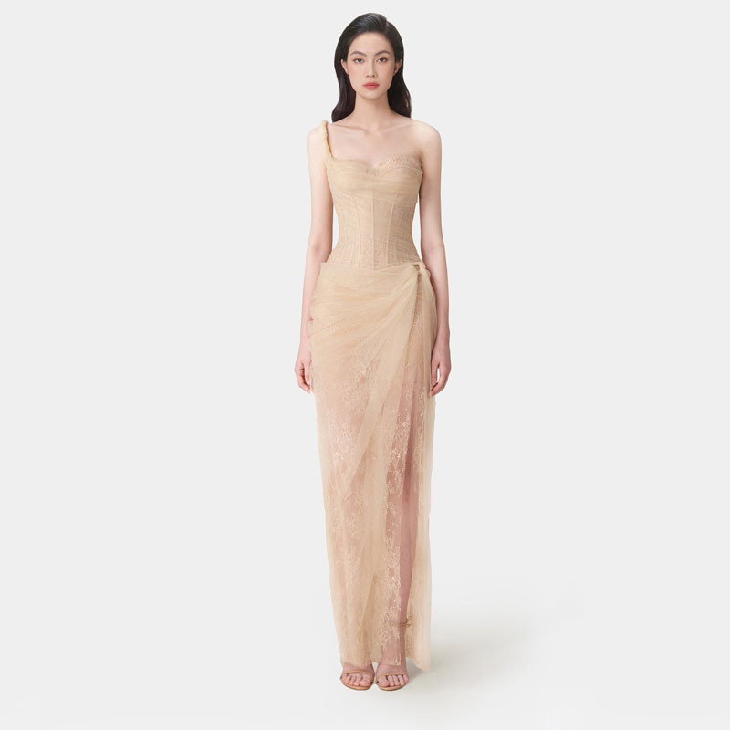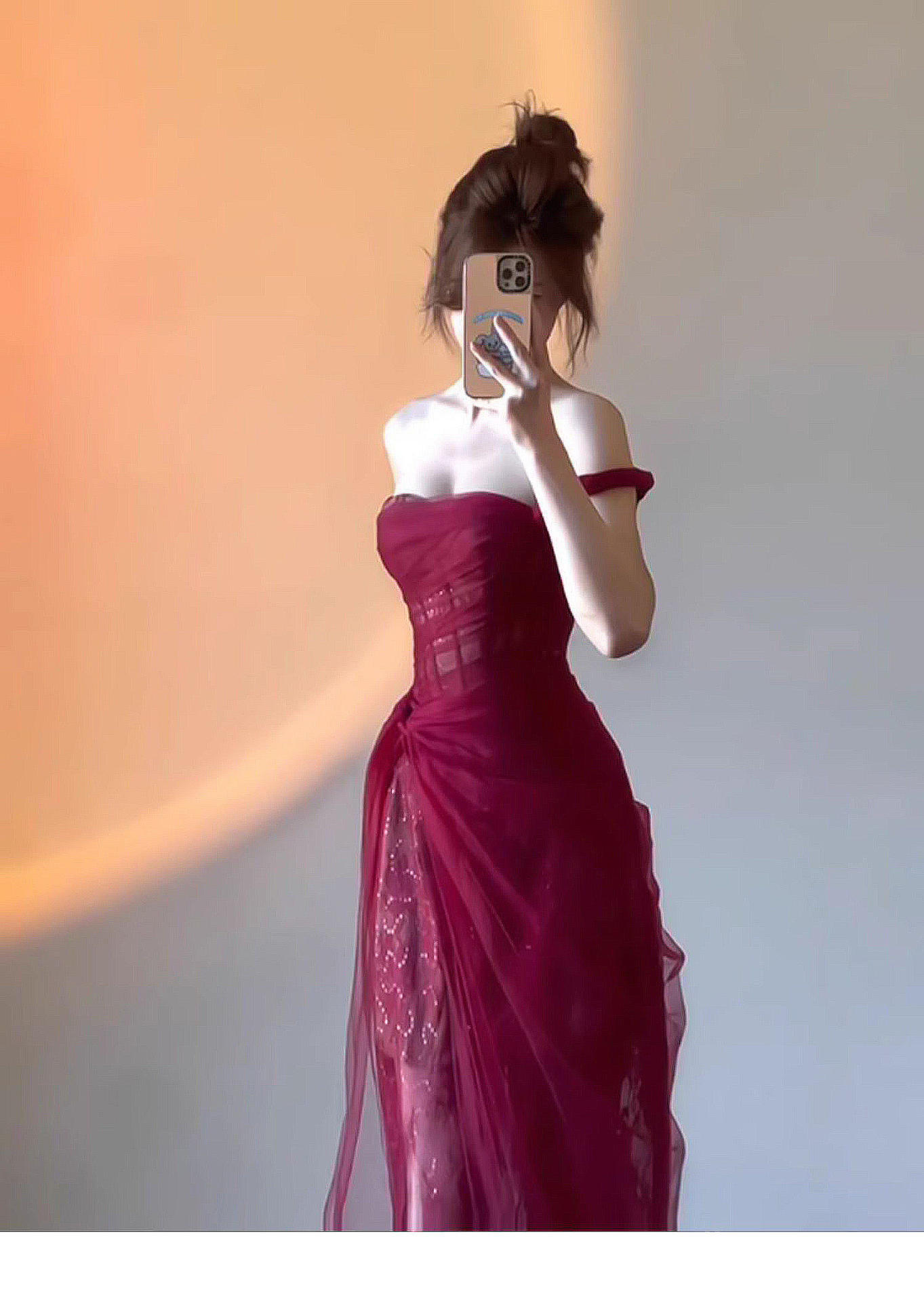 迷人的酒紅色調,搭配綻放立體蕾絲細節的設計,展現出優雅拘謹又不失時尚風格。魚骨束腰的剪裁修飾曲線,令身形顯得纖細修長。垂墜感十足的網紗材質,營造夢幻迷人的氛圍。無論是正式場合或是特別的約會,這款長禮服定能成為矚目焦點。