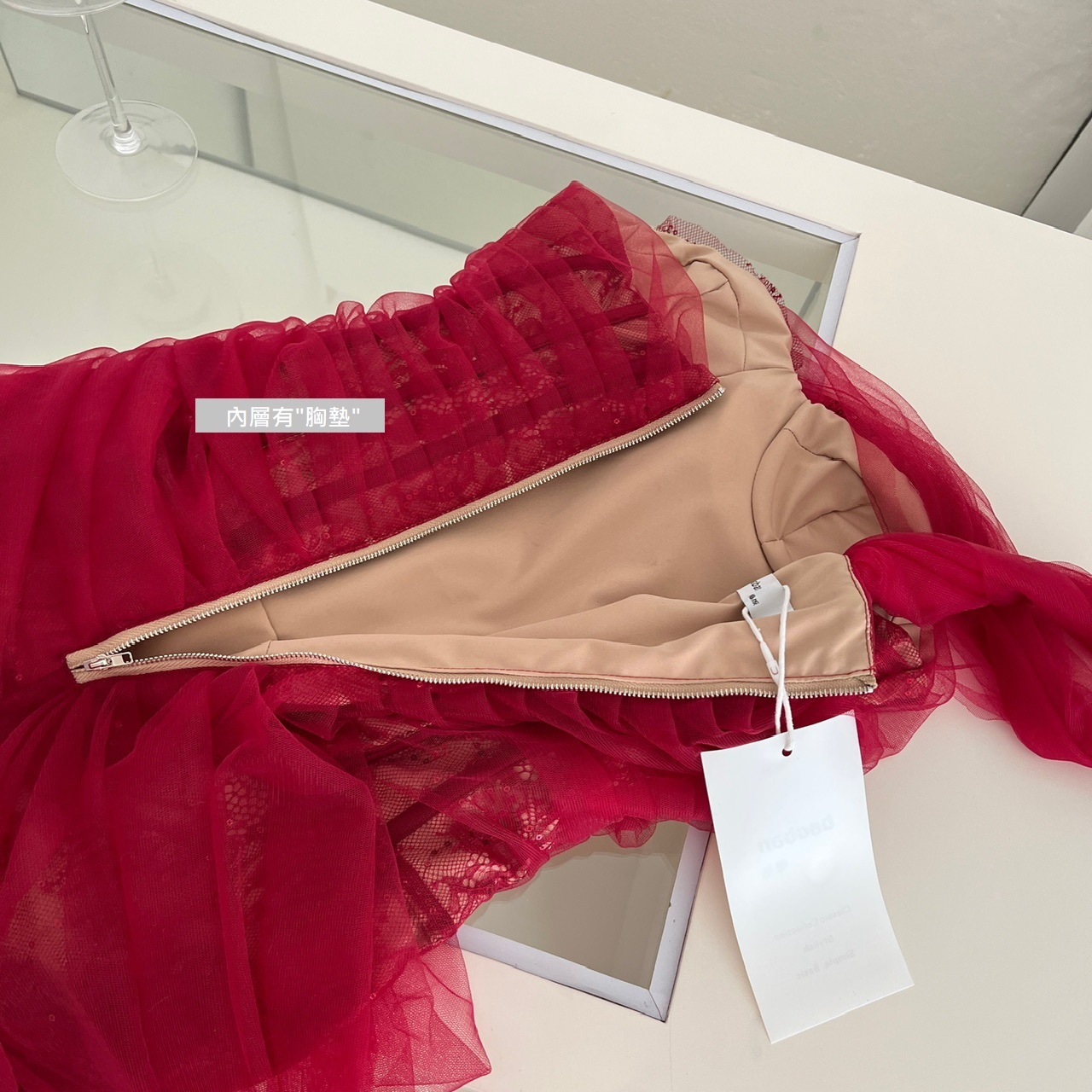 魚骨束腰 網紗堆疊蕾絲長禮服(酒紅/黑/杏)