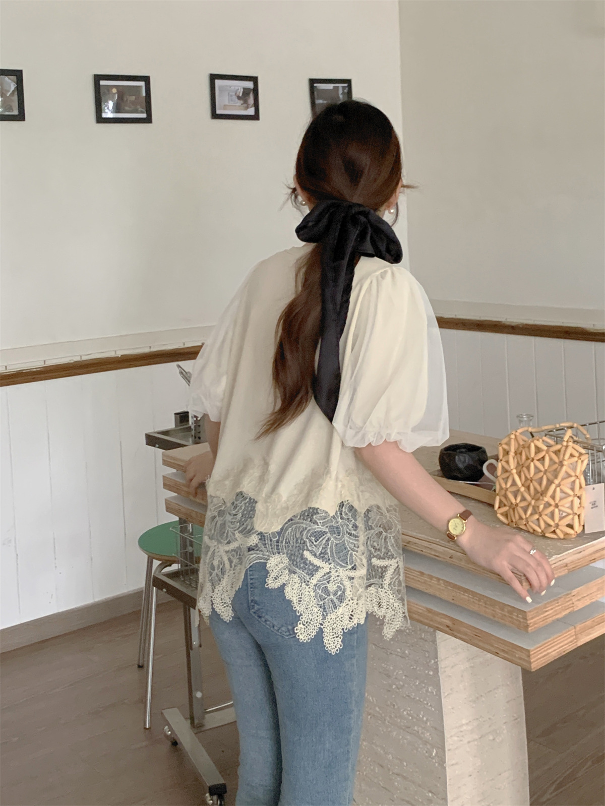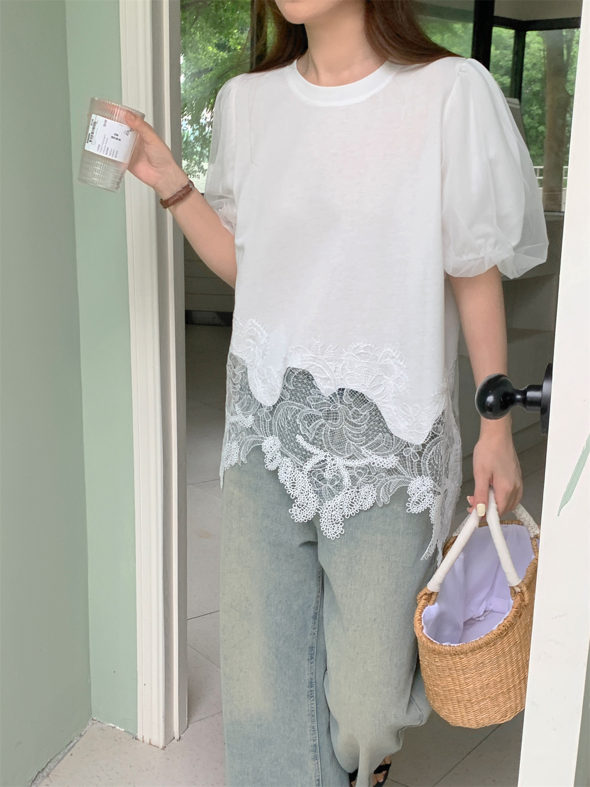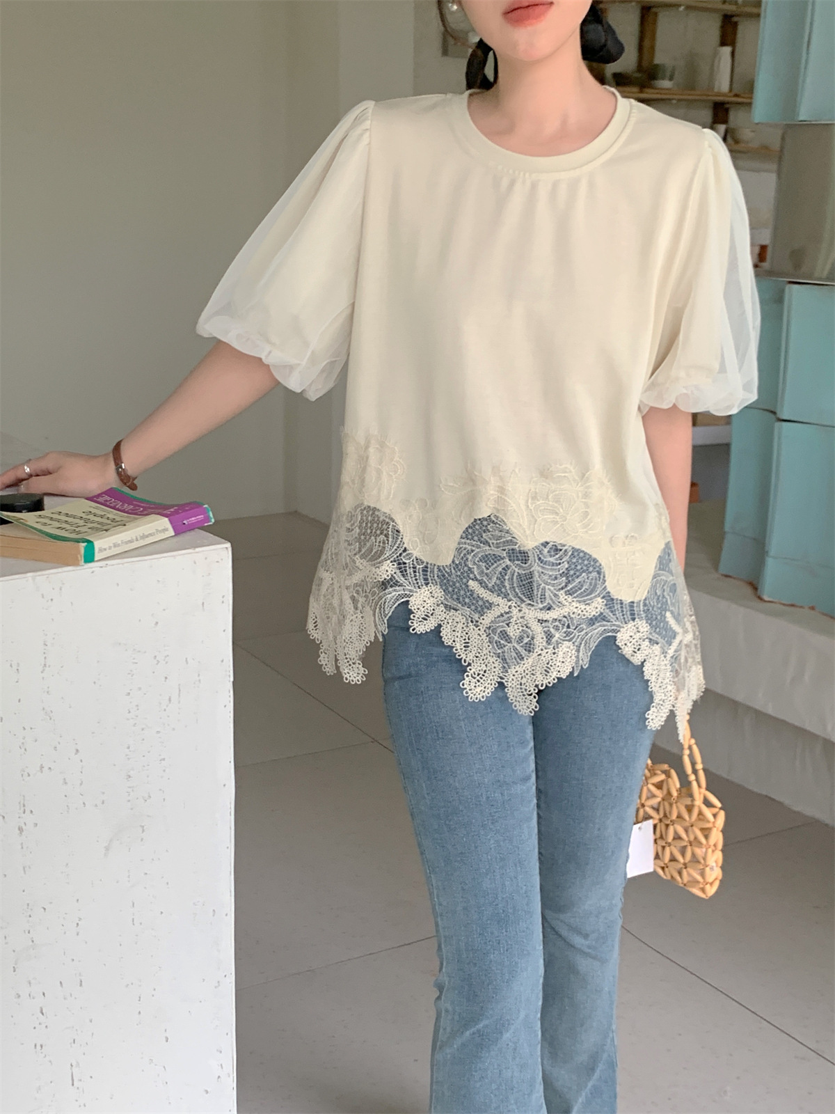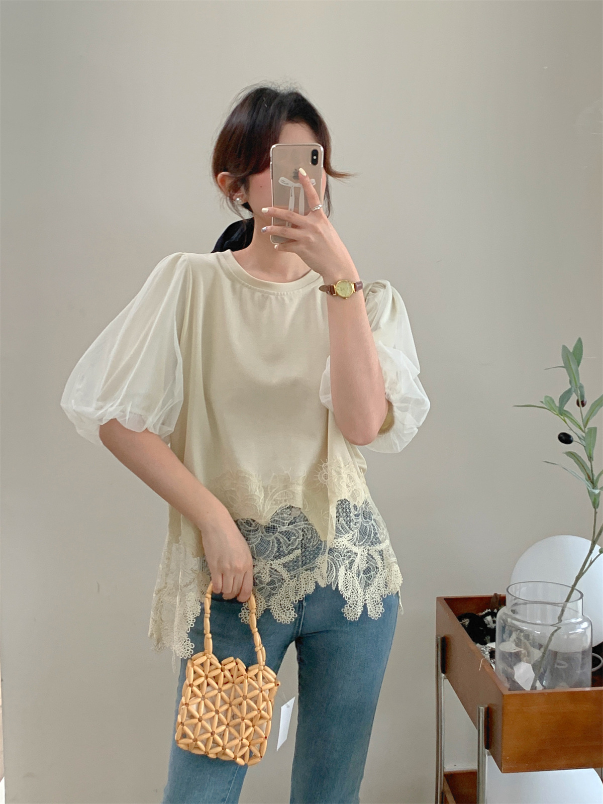 蕾絲花邊拼接 網紗泡泡袖上衣(杏/白)