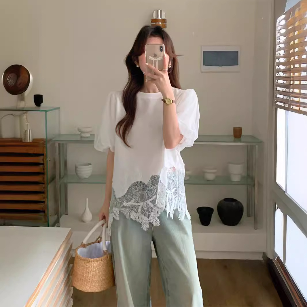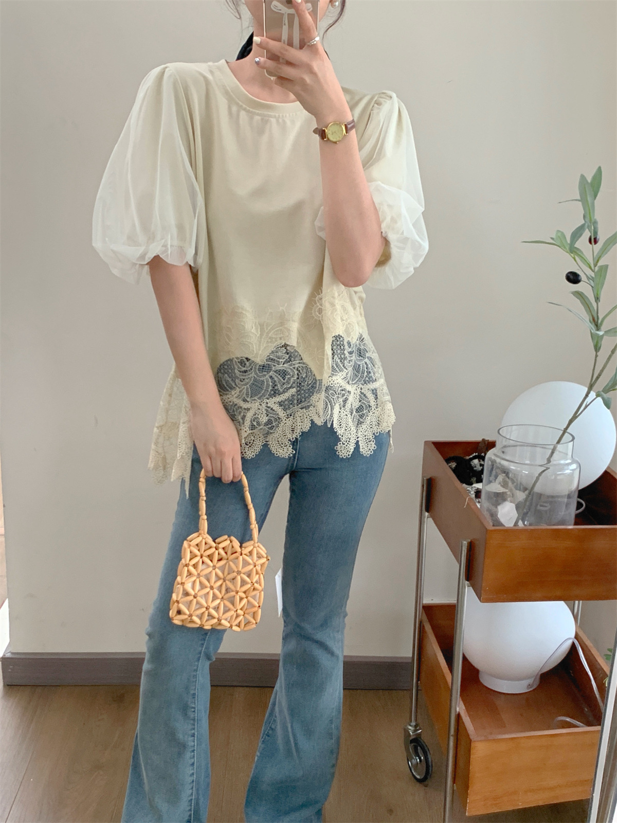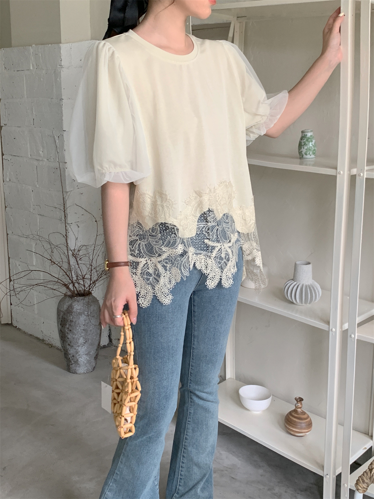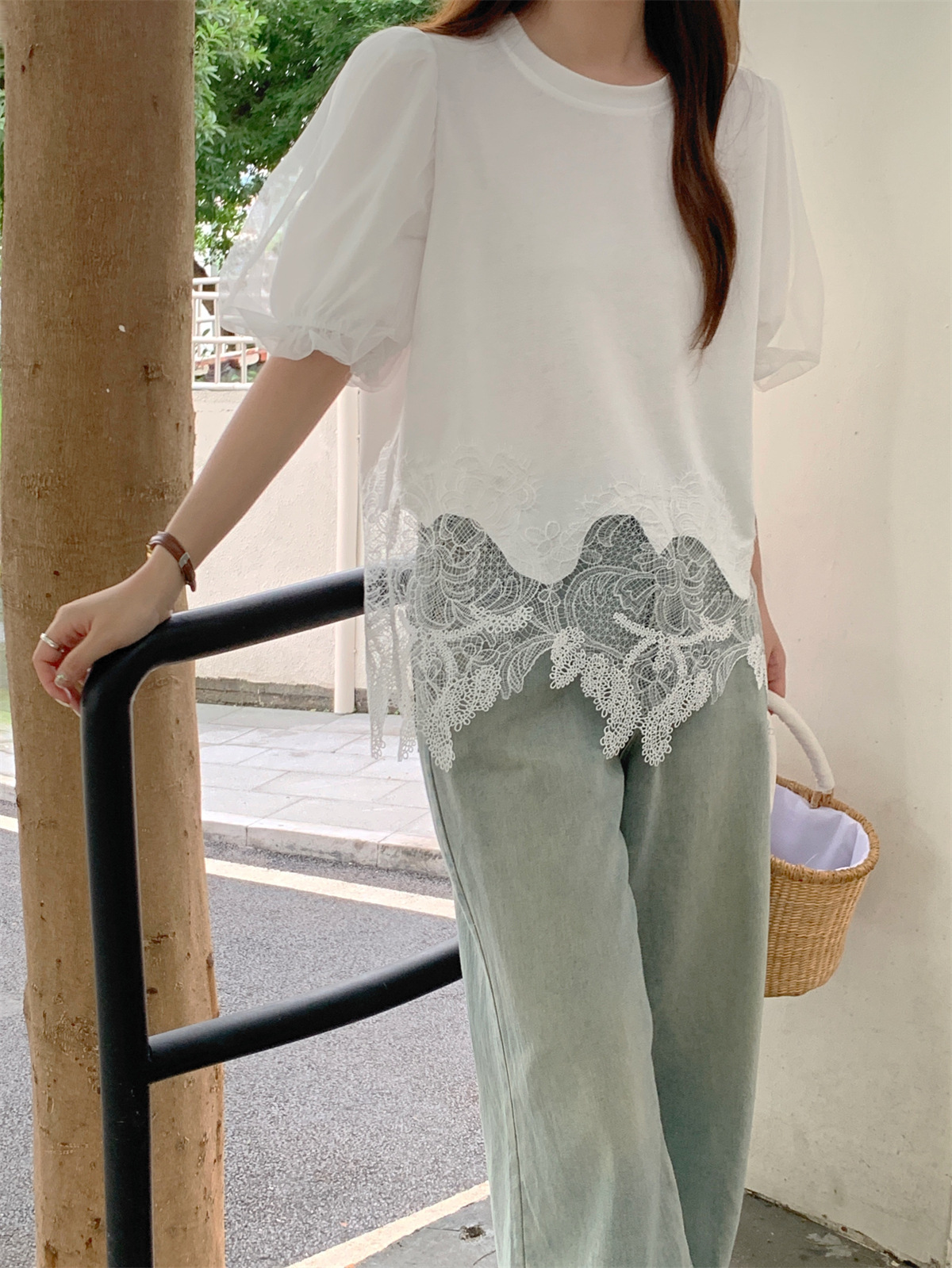 蕾絲花邊拼接 網紗泡泡袖上衣(杏/白)