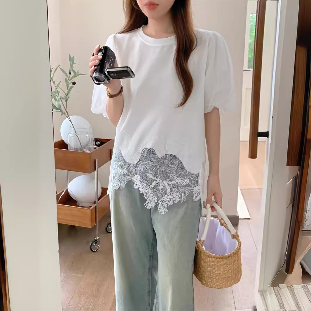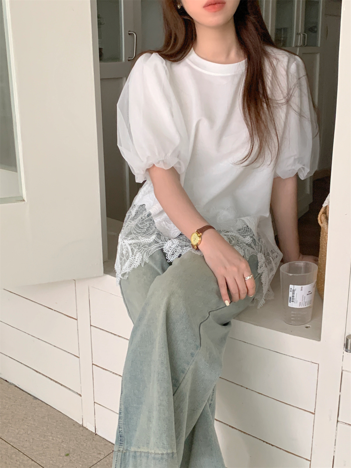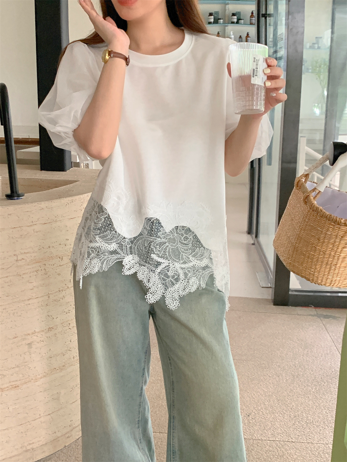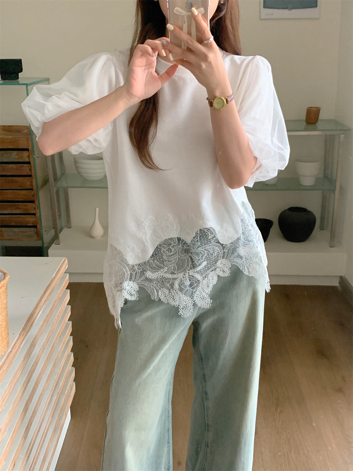 蕾絲花邊拼接 網紗泡泡袖上衣(杏/白)