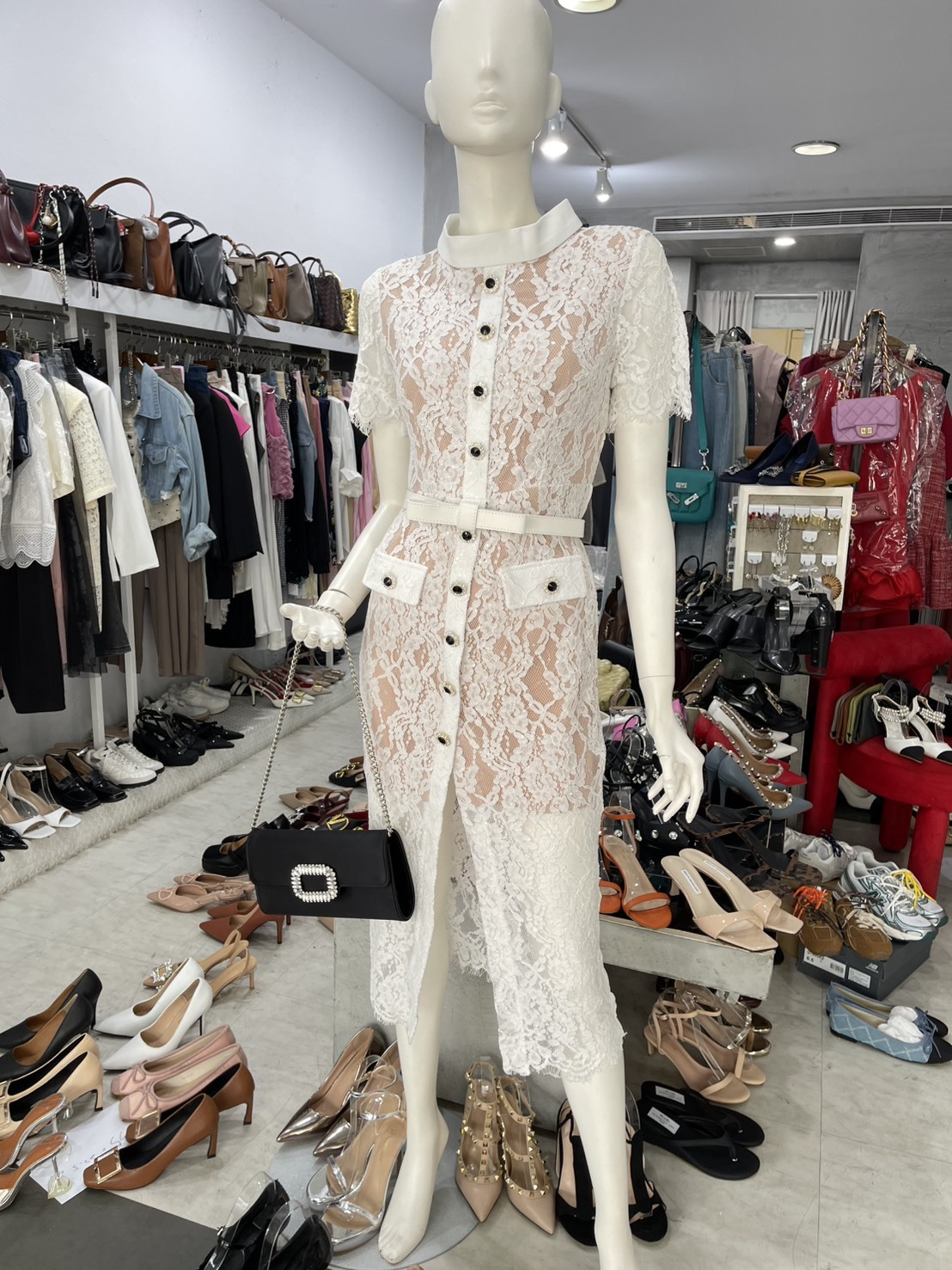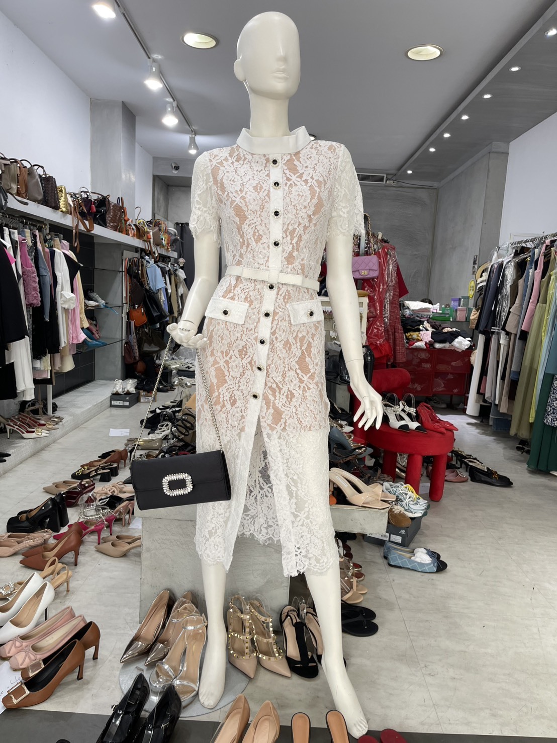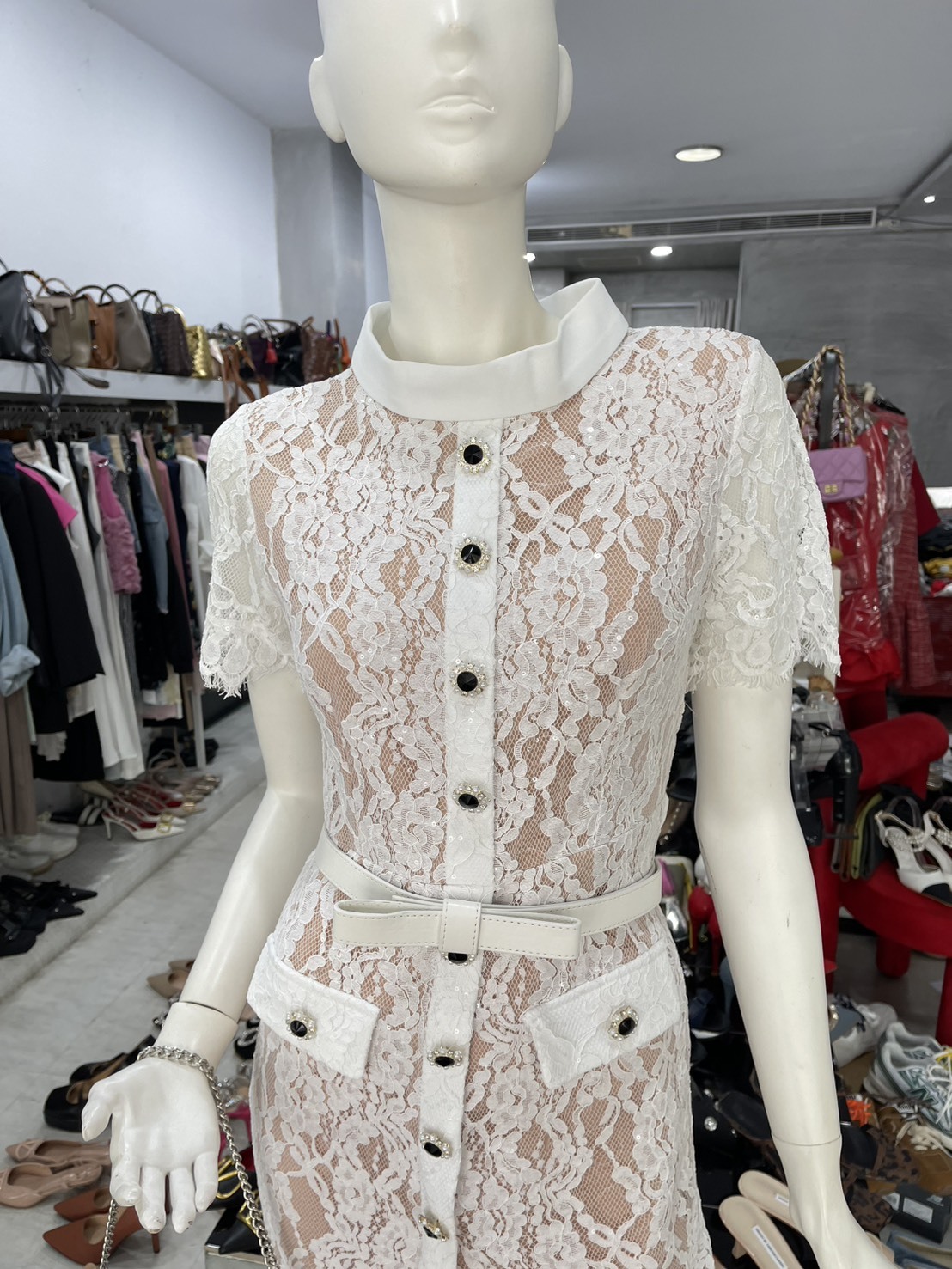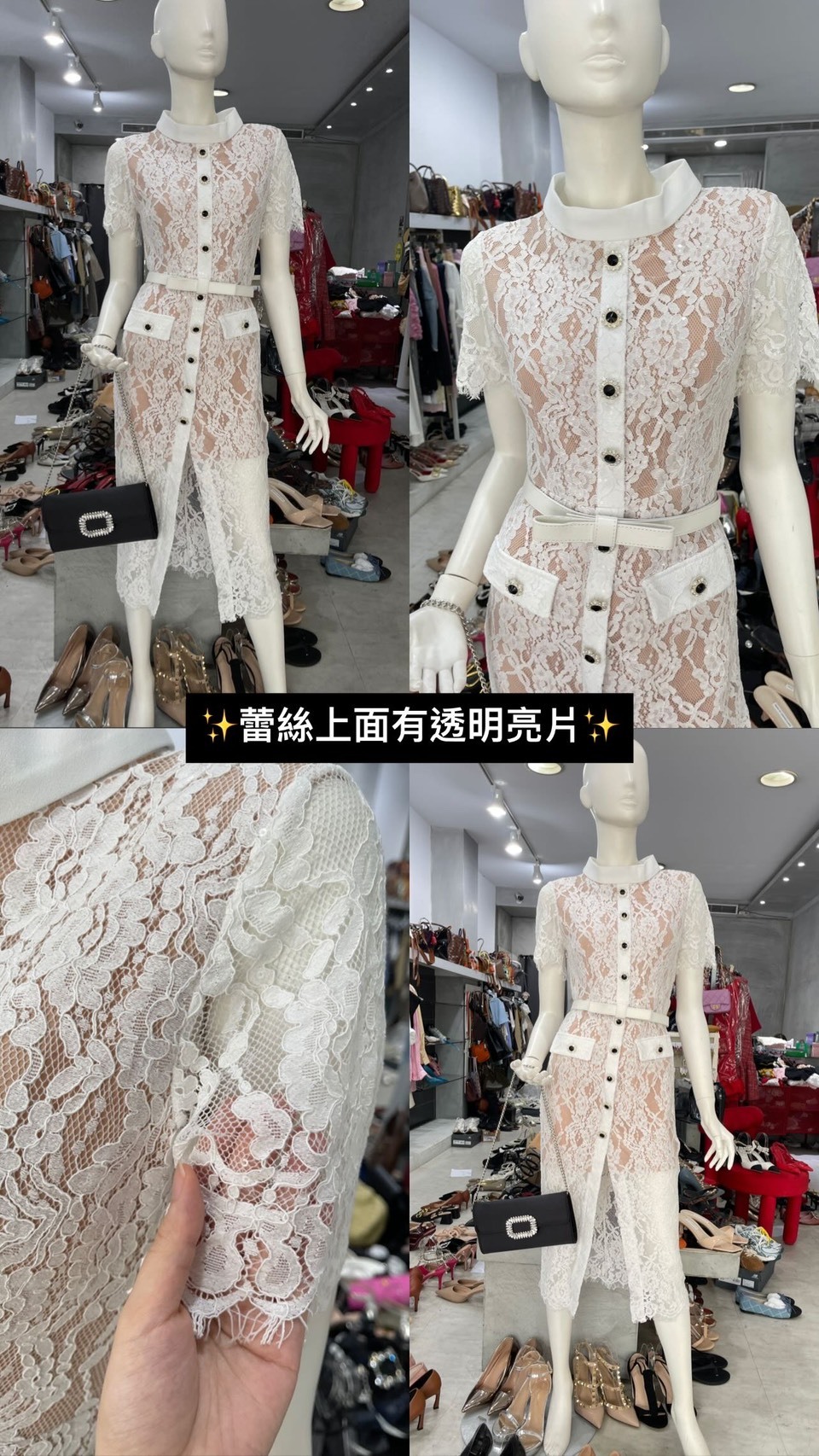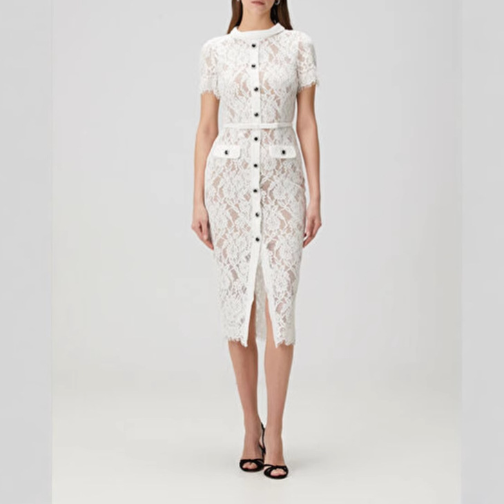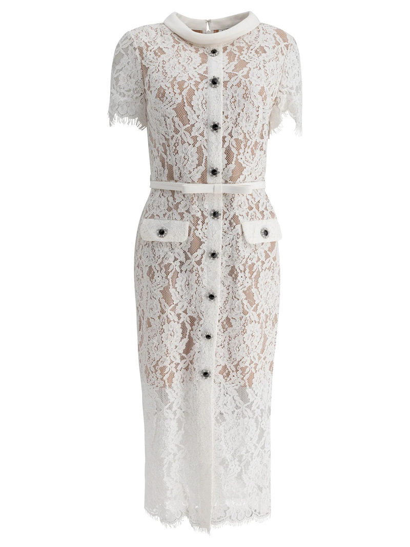 睫毛蕾絲單排釦收腰短袖洋裝(附腰帶)