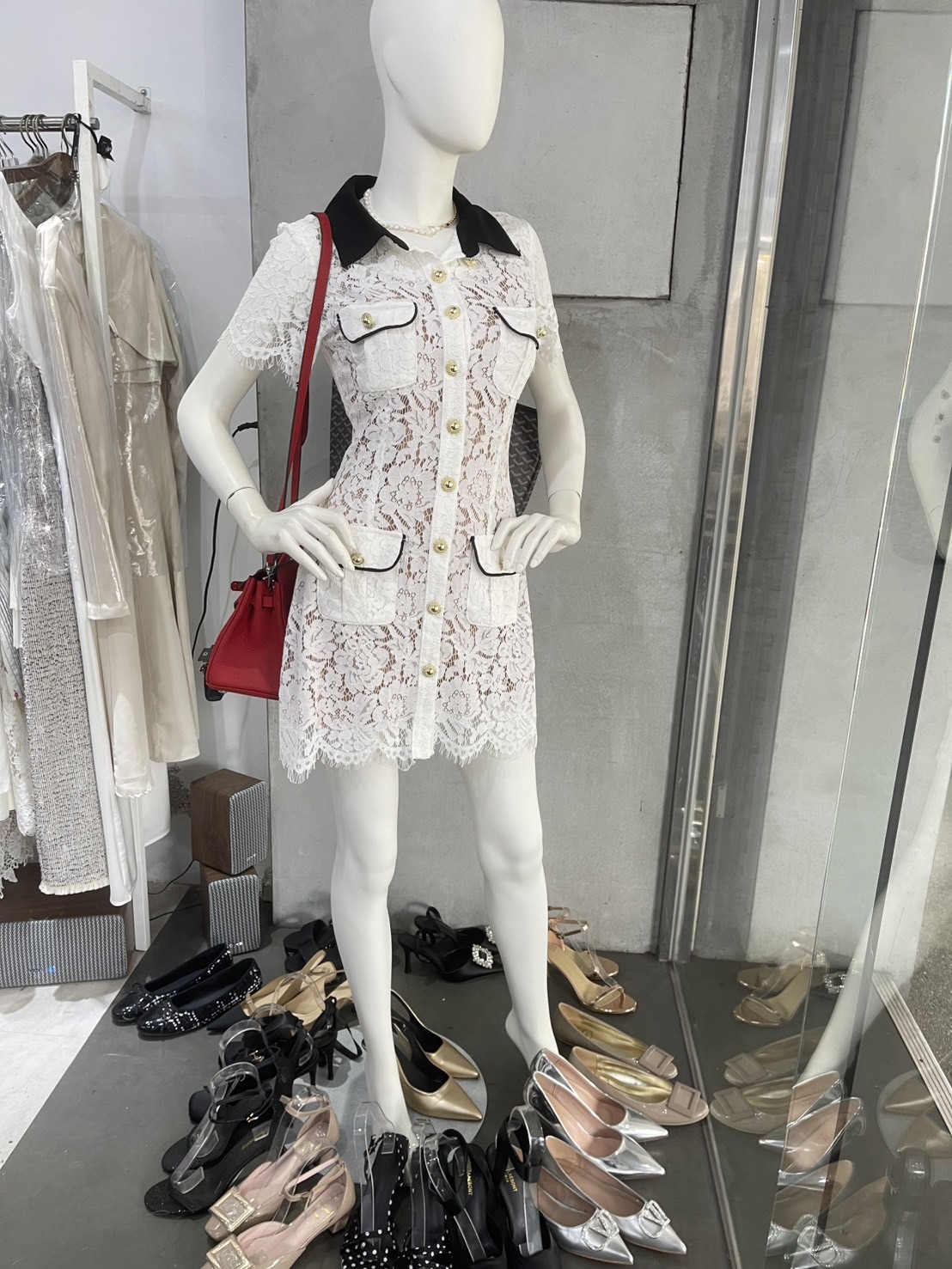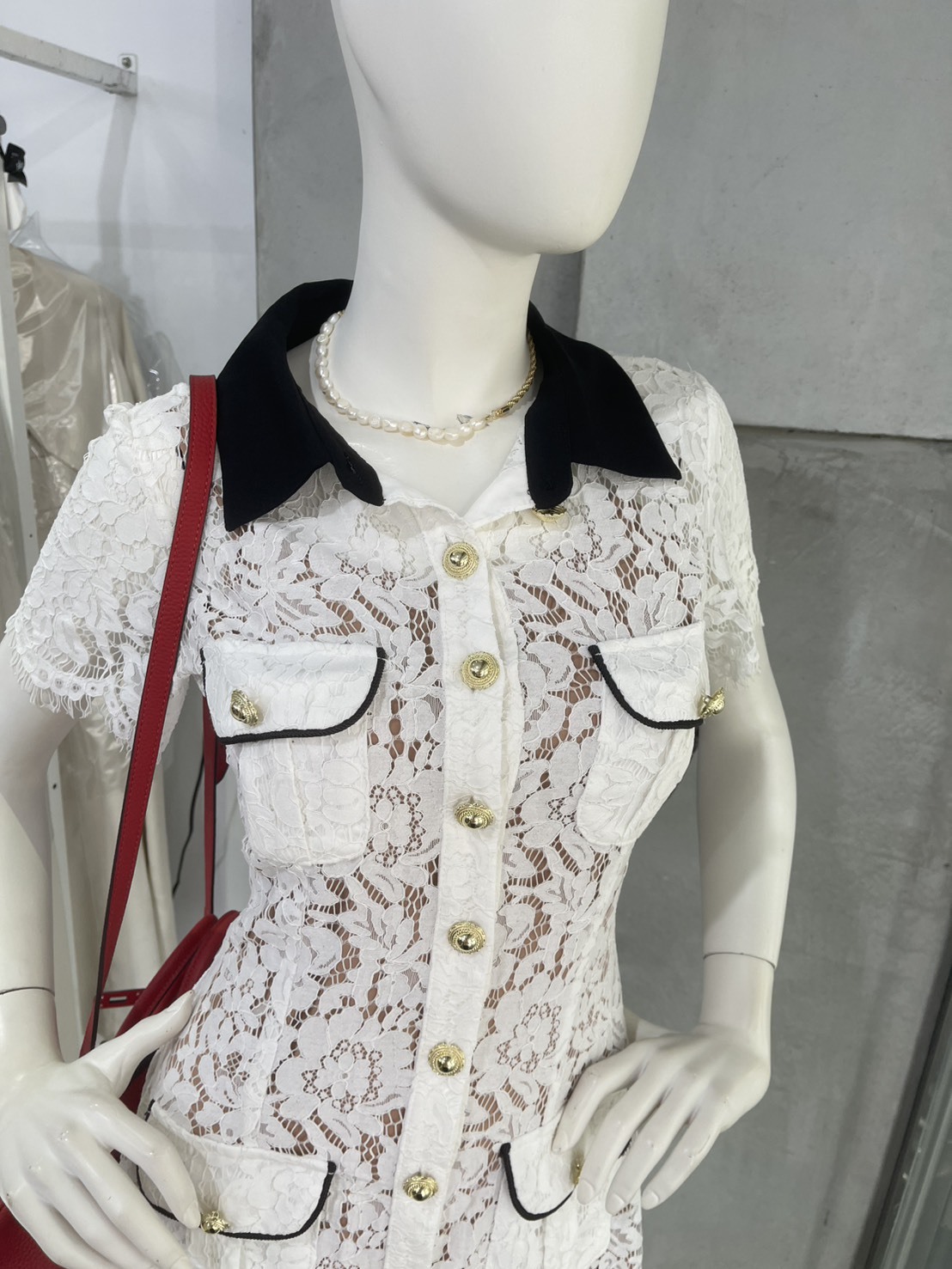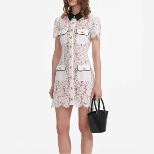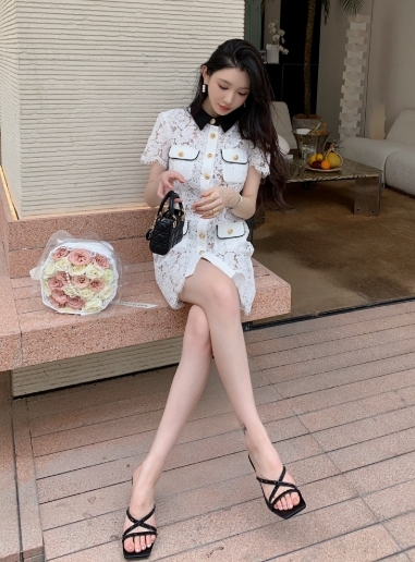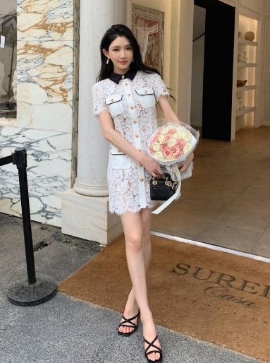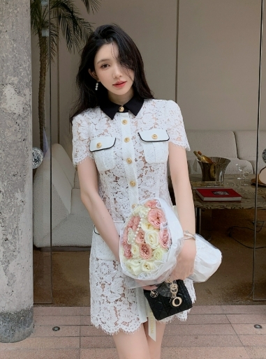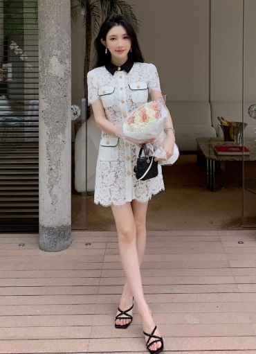 撞色翻領 蕾絲收腰小洋裝