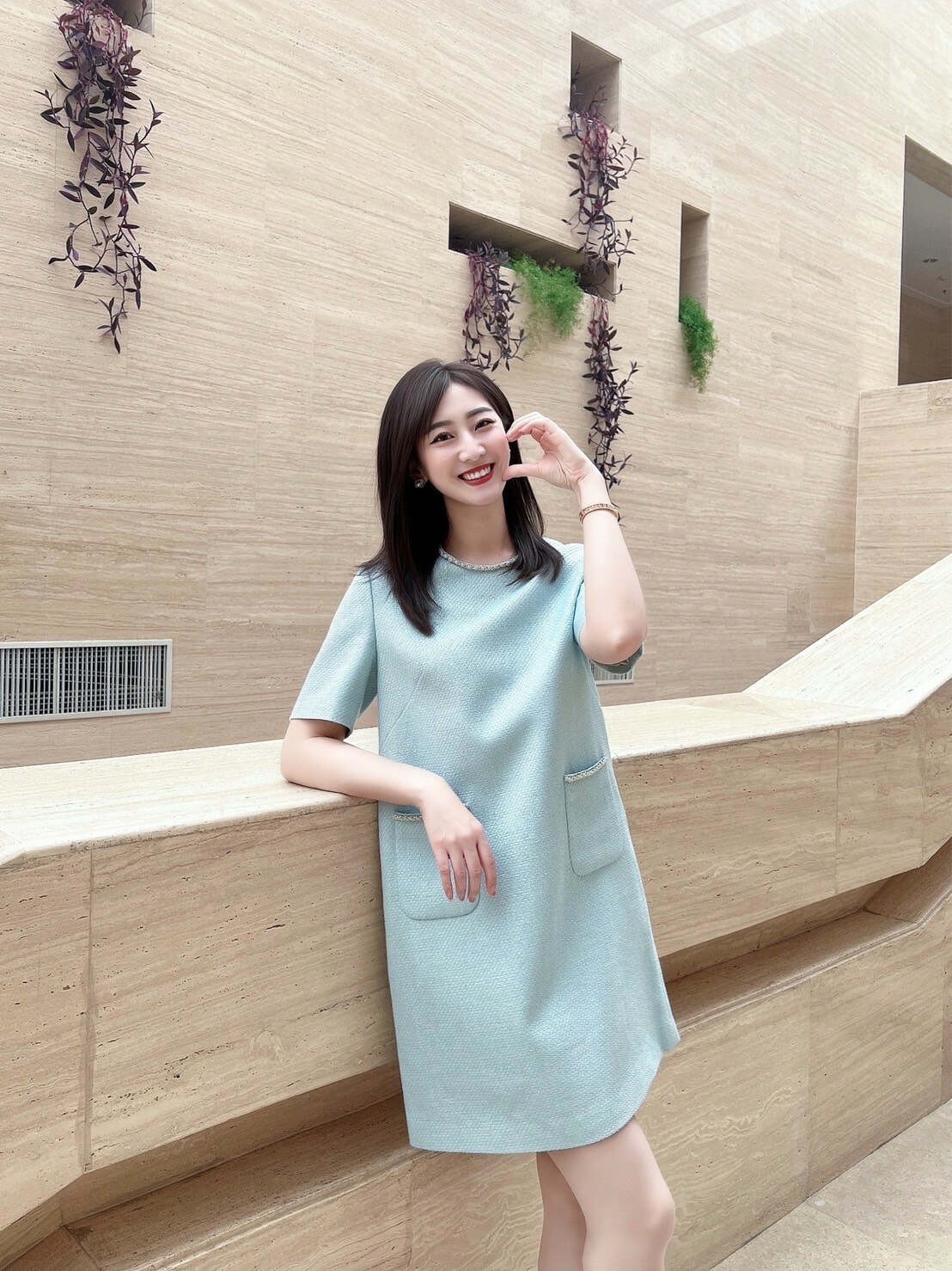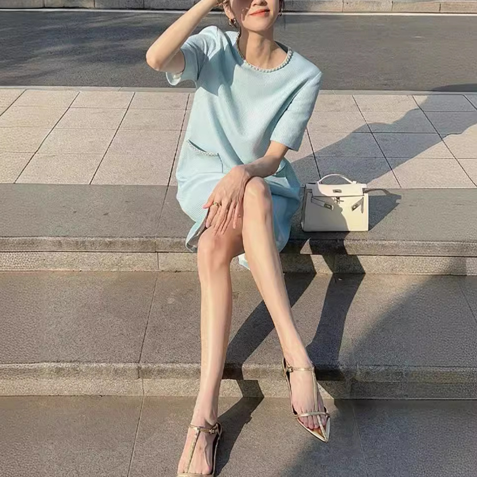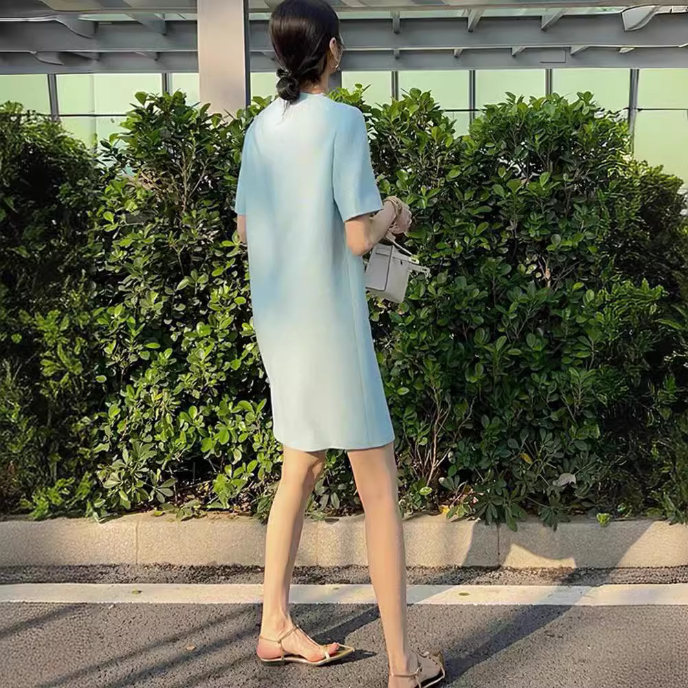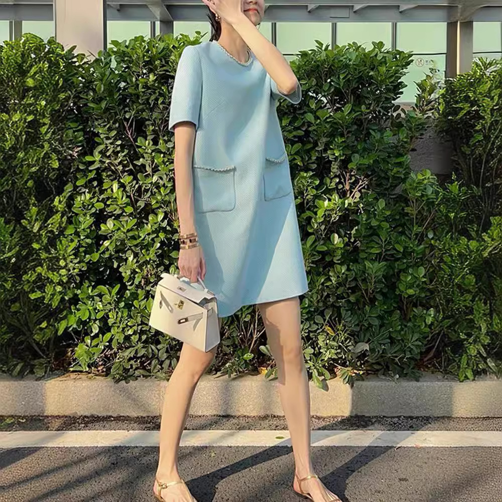 精巧可愛的淺藍色連衣裙,帶有鏈條裝飾增加時尚感。寬鬆版型,舒適體貼,短袖設計清爽宜人,薄款毛尼質地輕柔貼身。雙側口袋設計實用方便。適合夏日多種場合,展現淡雅優雅的個人風格。