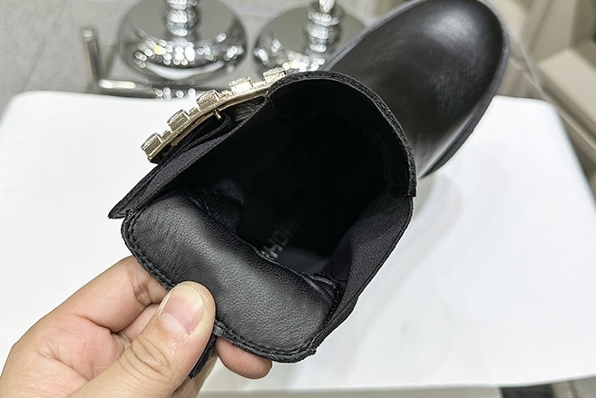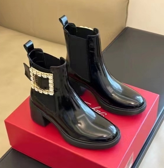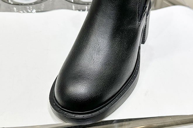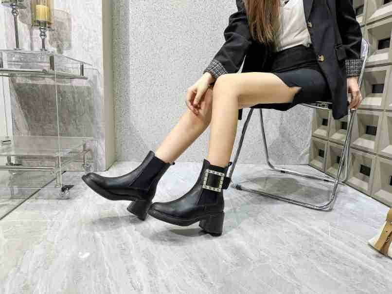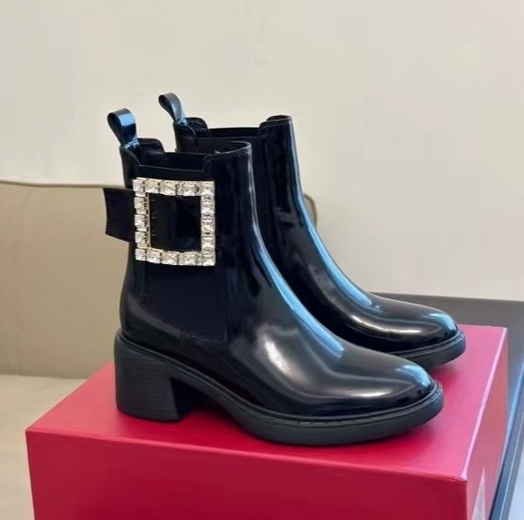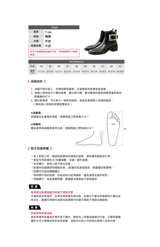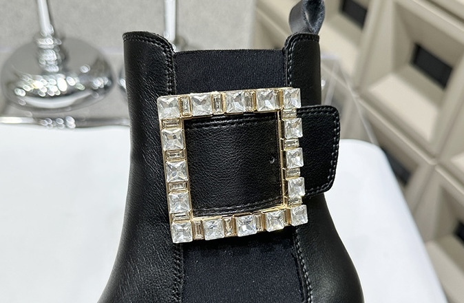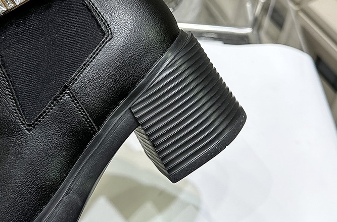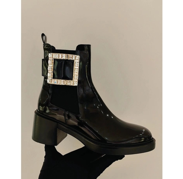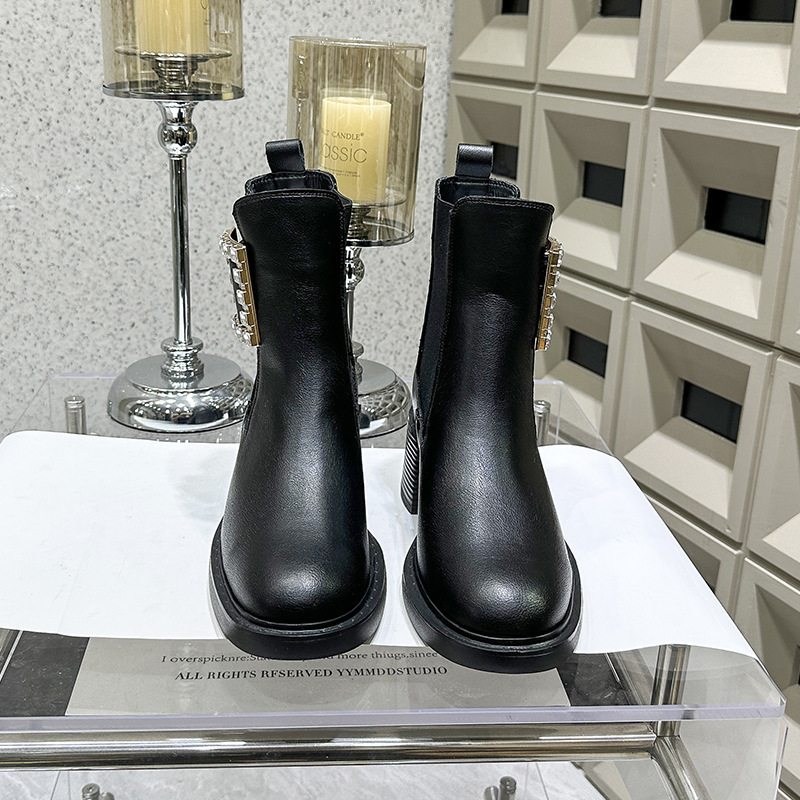 水鑽方釦 粗跟高真皮短靴(34-40)
