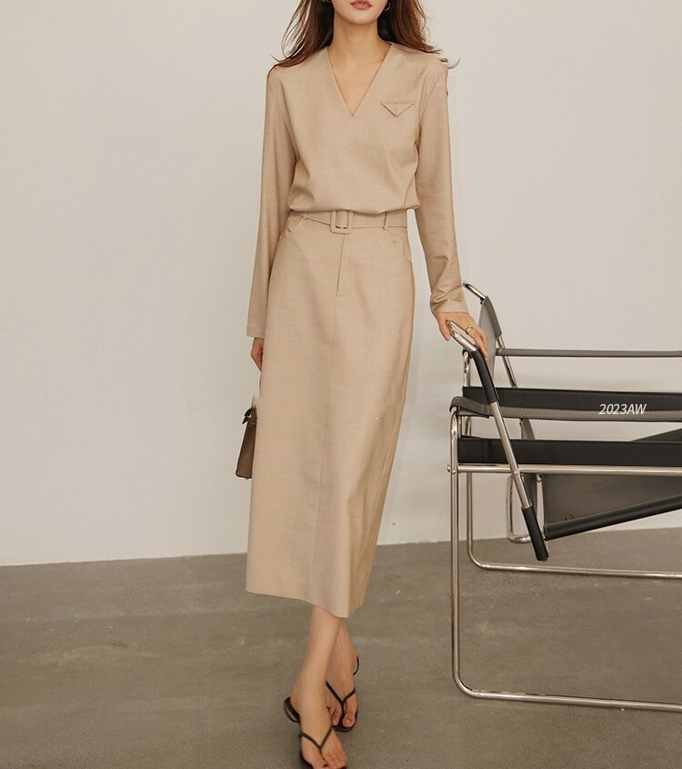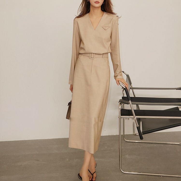 防皺面料V領襯衫+高腰裙(可單買)