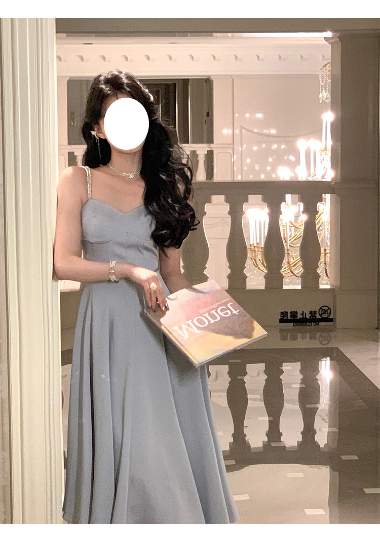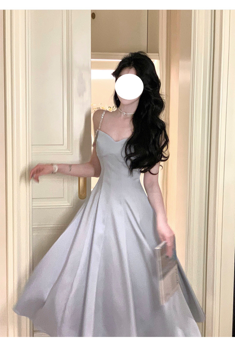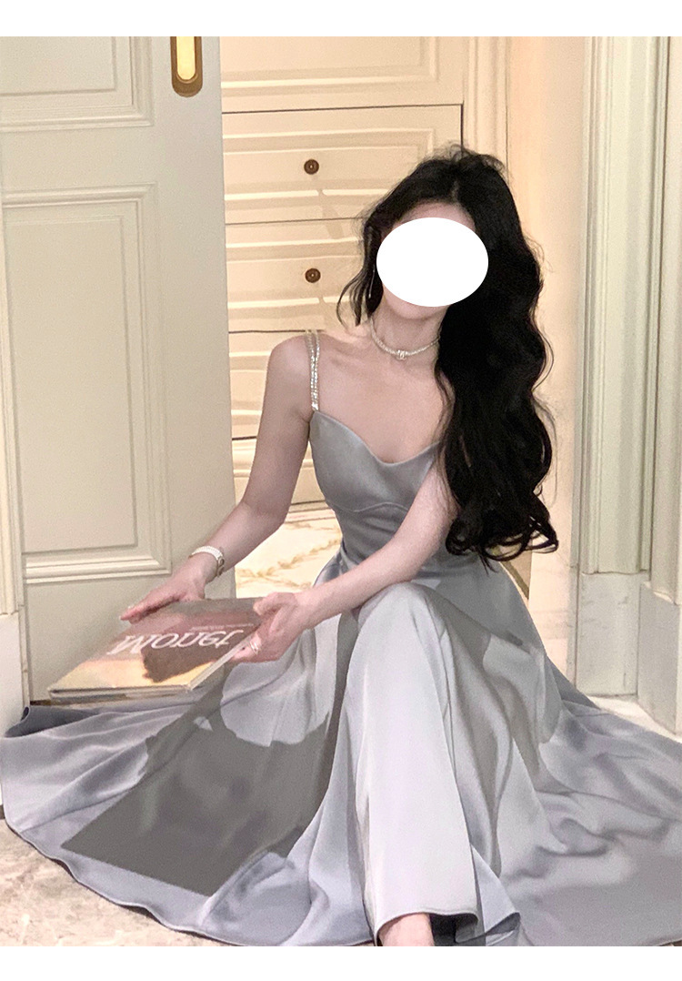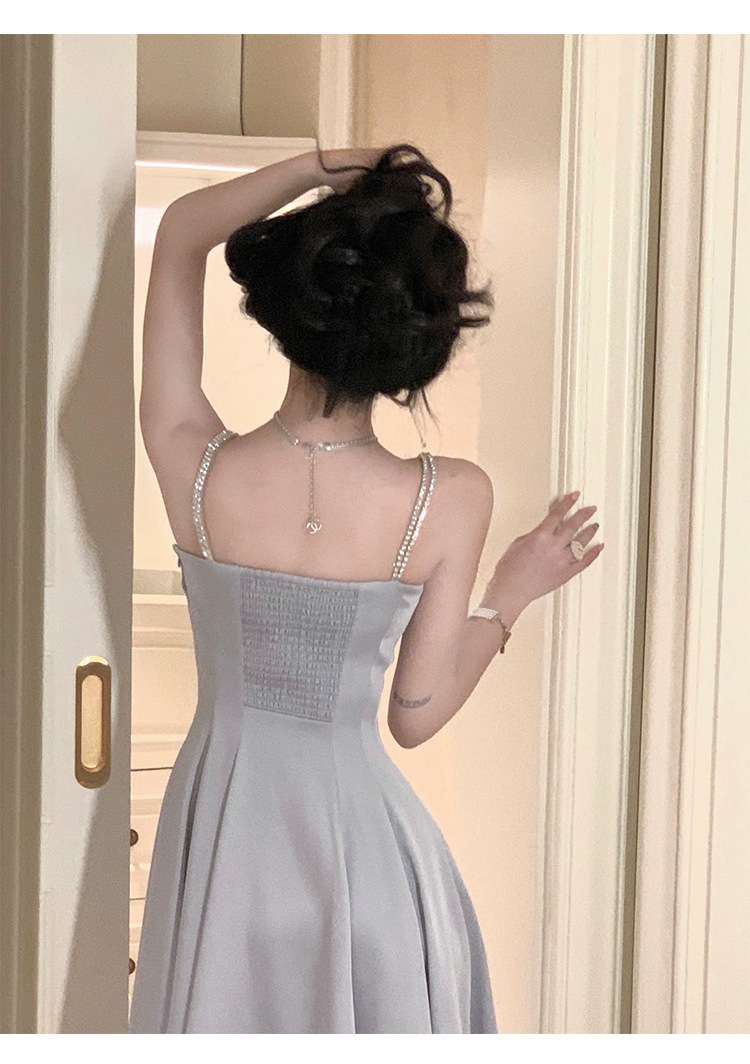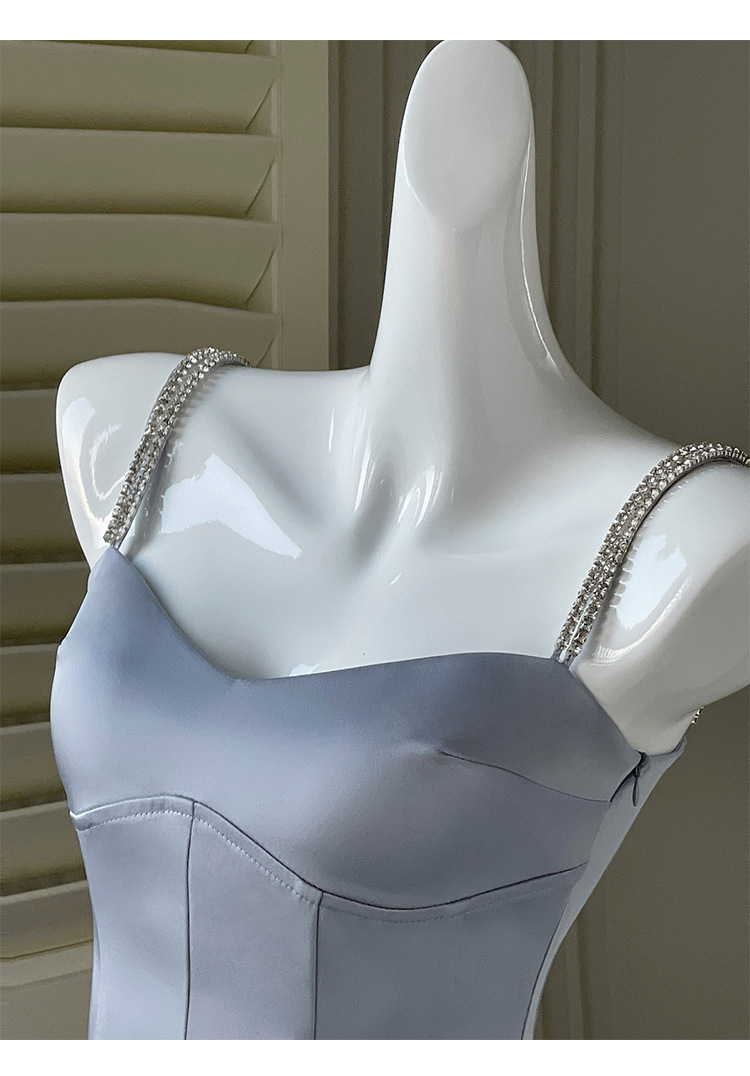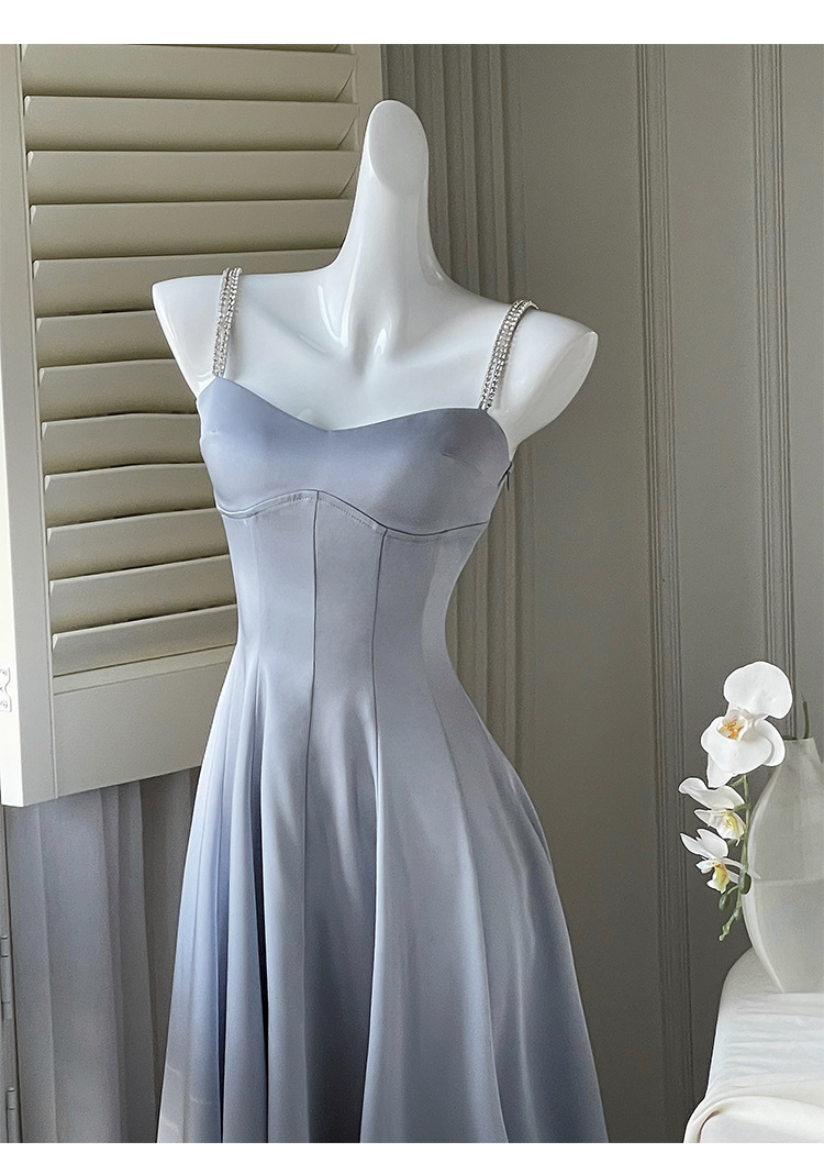 綢緞灰藍色 鑽肩帶小禮服