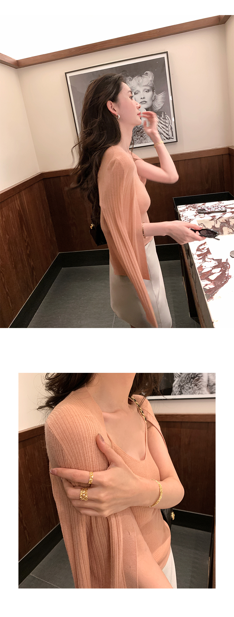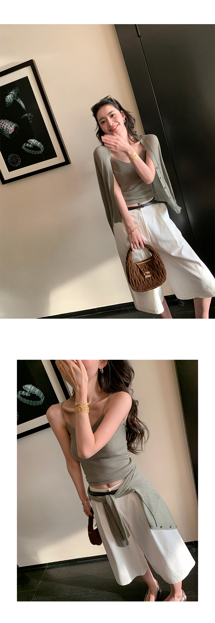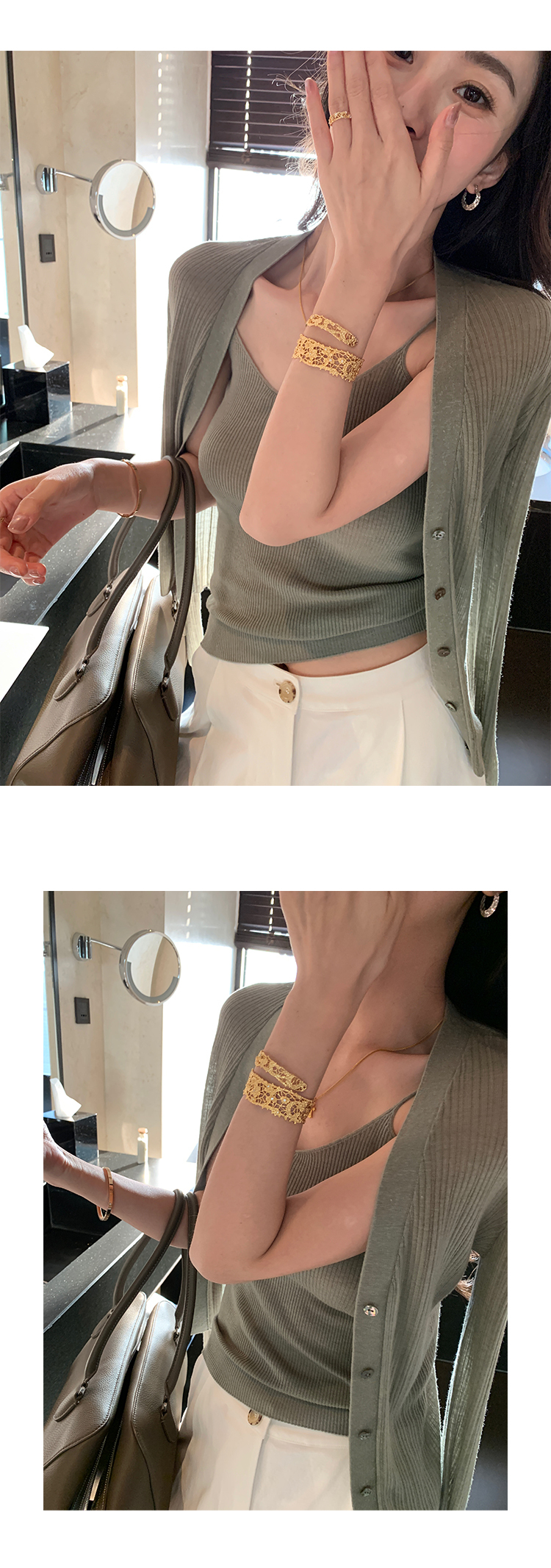 細膩剪裁的針織背心,讓妳展現自然優雅的身姿。外套的流暢剪裁增添造型層次,搭配背心的舒適涼感,打造清爽舒適的夏日造型。無論選擇優雅的綠色、粉嫩的粉色或時髦的咖啡色,這套搭配都能為妳的日常穿搭增添更多魅力。