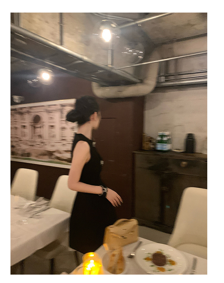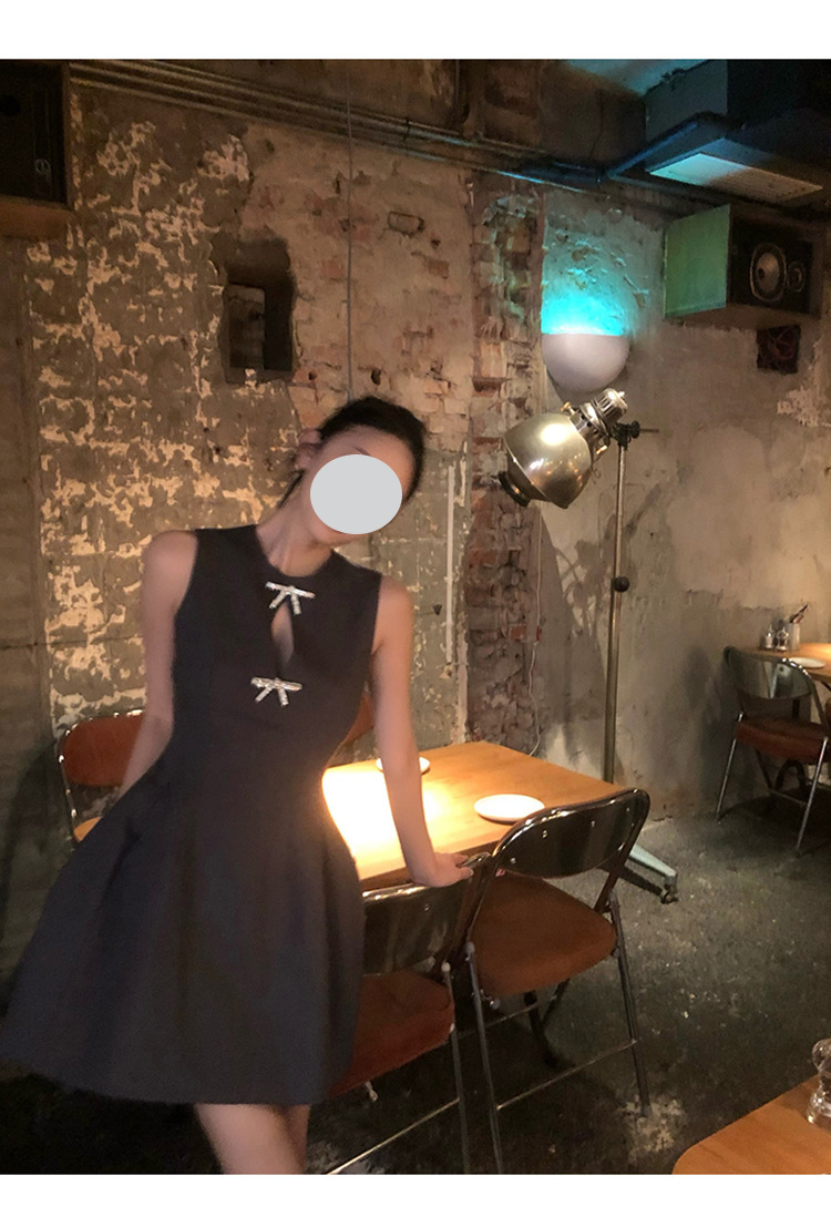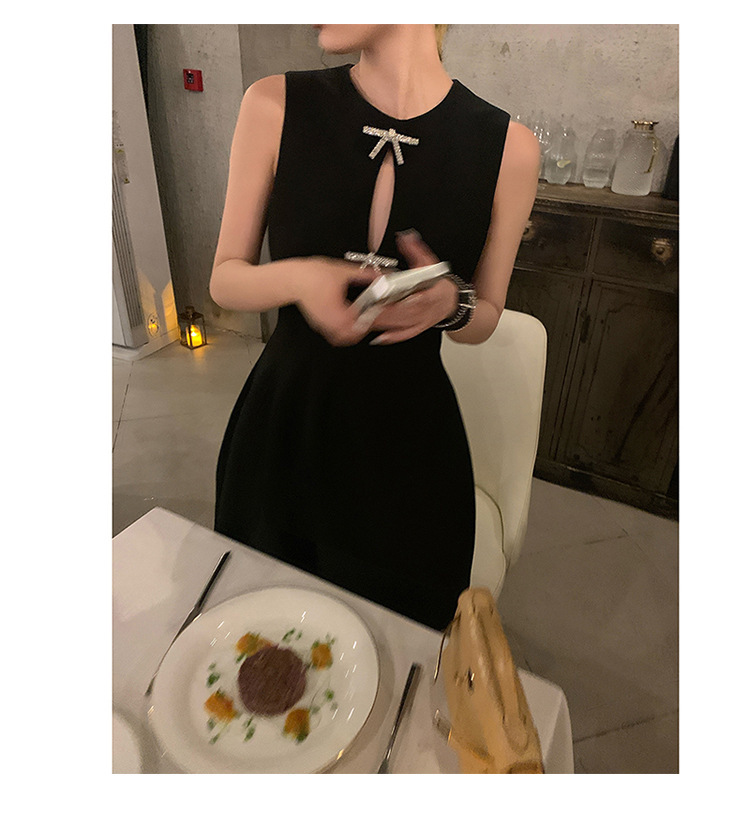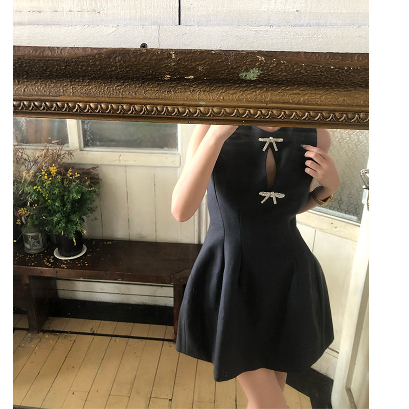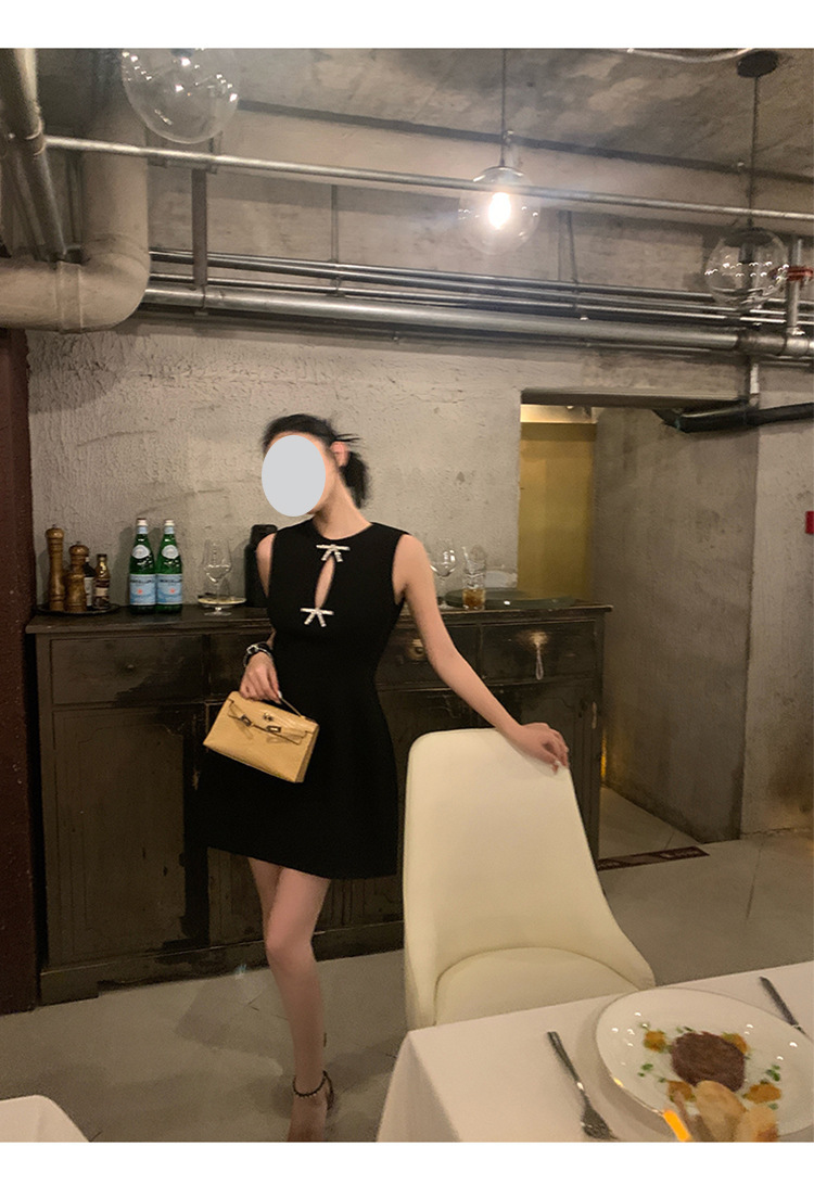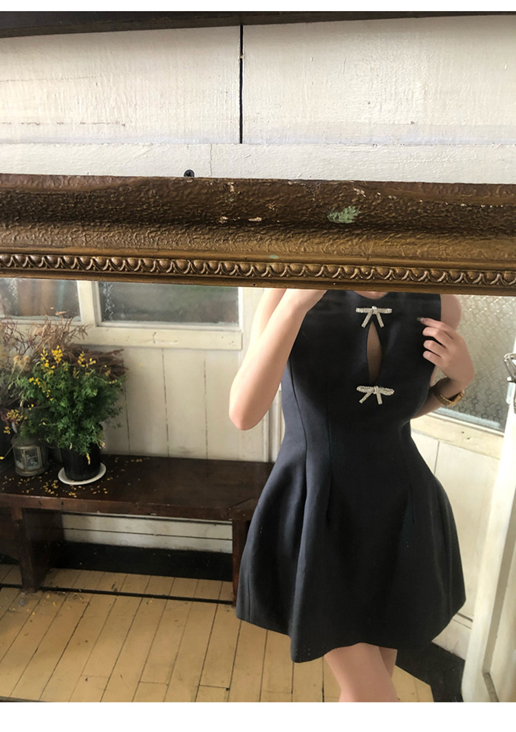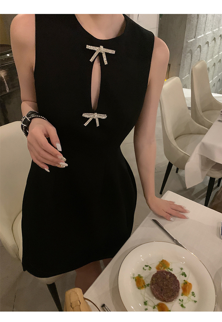 赫本式性感 蝴蝶結水鑽簍空 收腰小洋裝