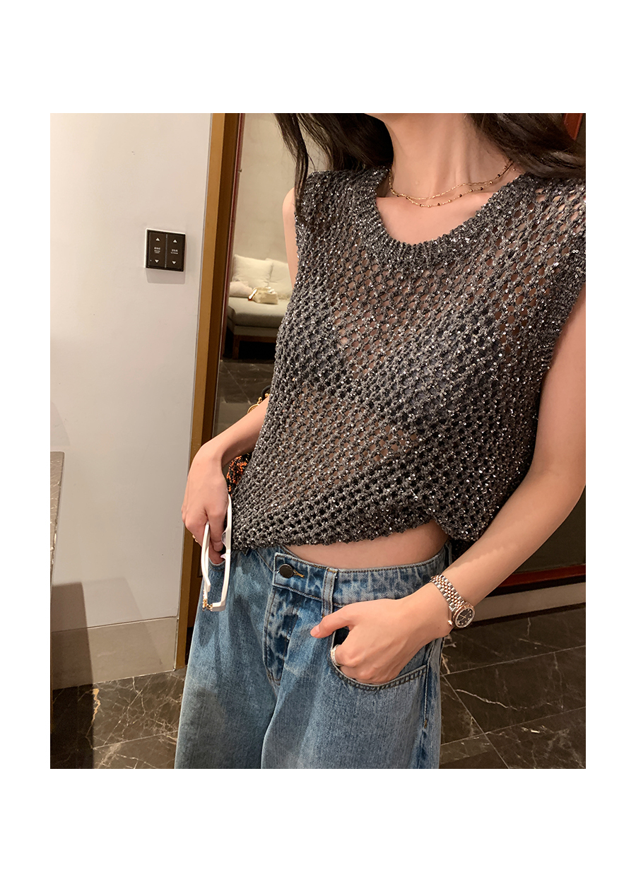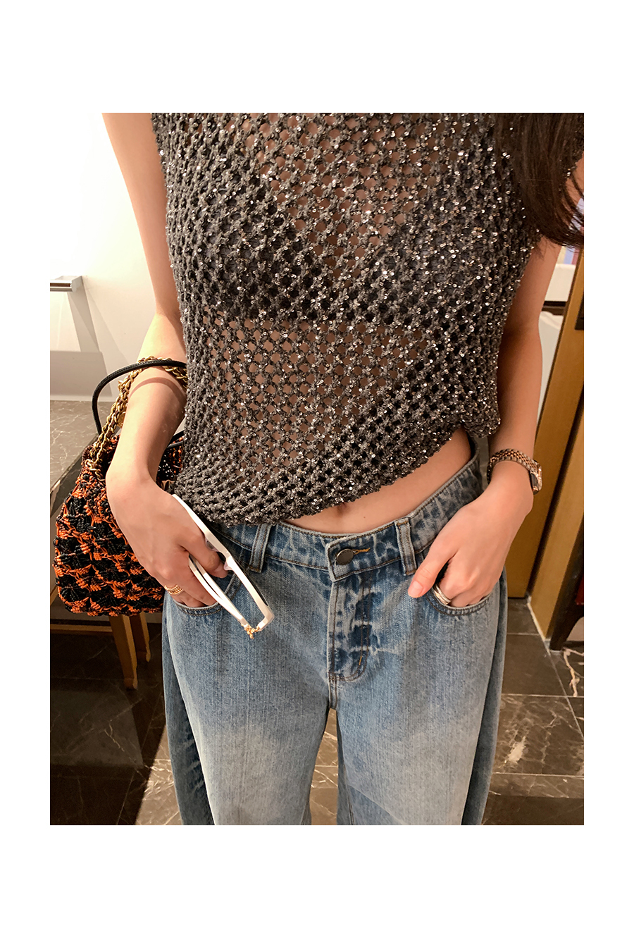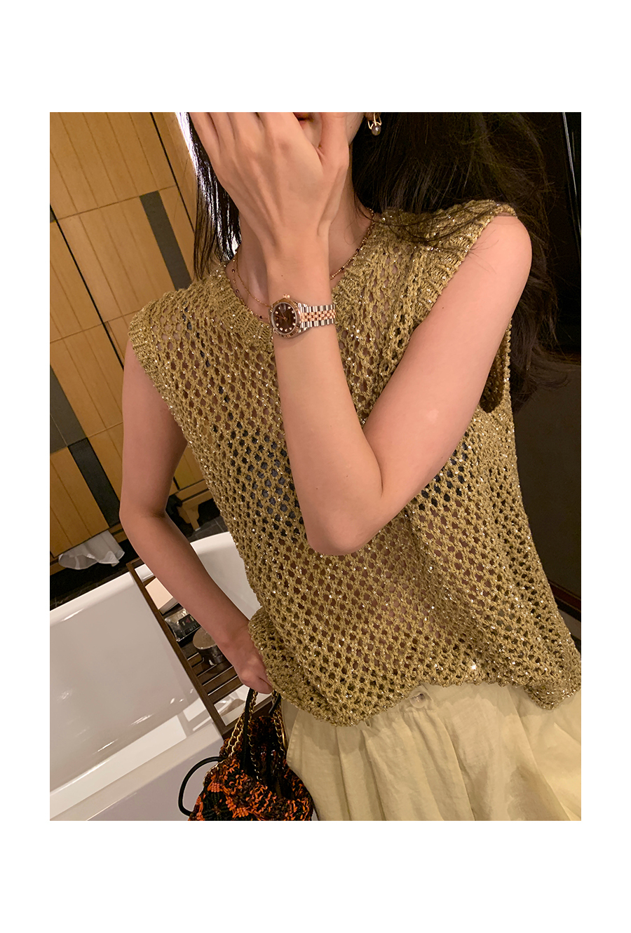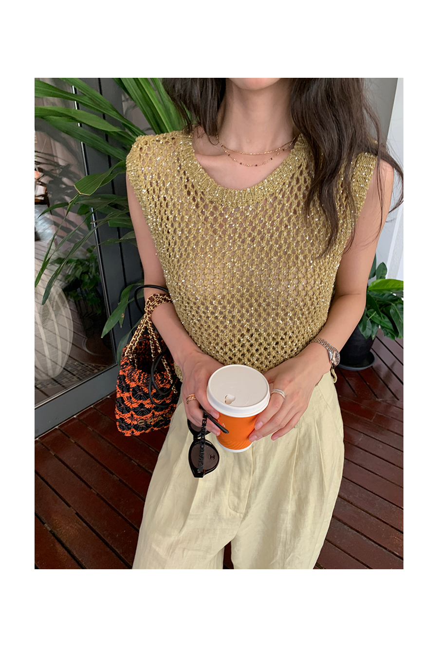 搖滾個性風 流金麻簍空背心(花灰/米白)