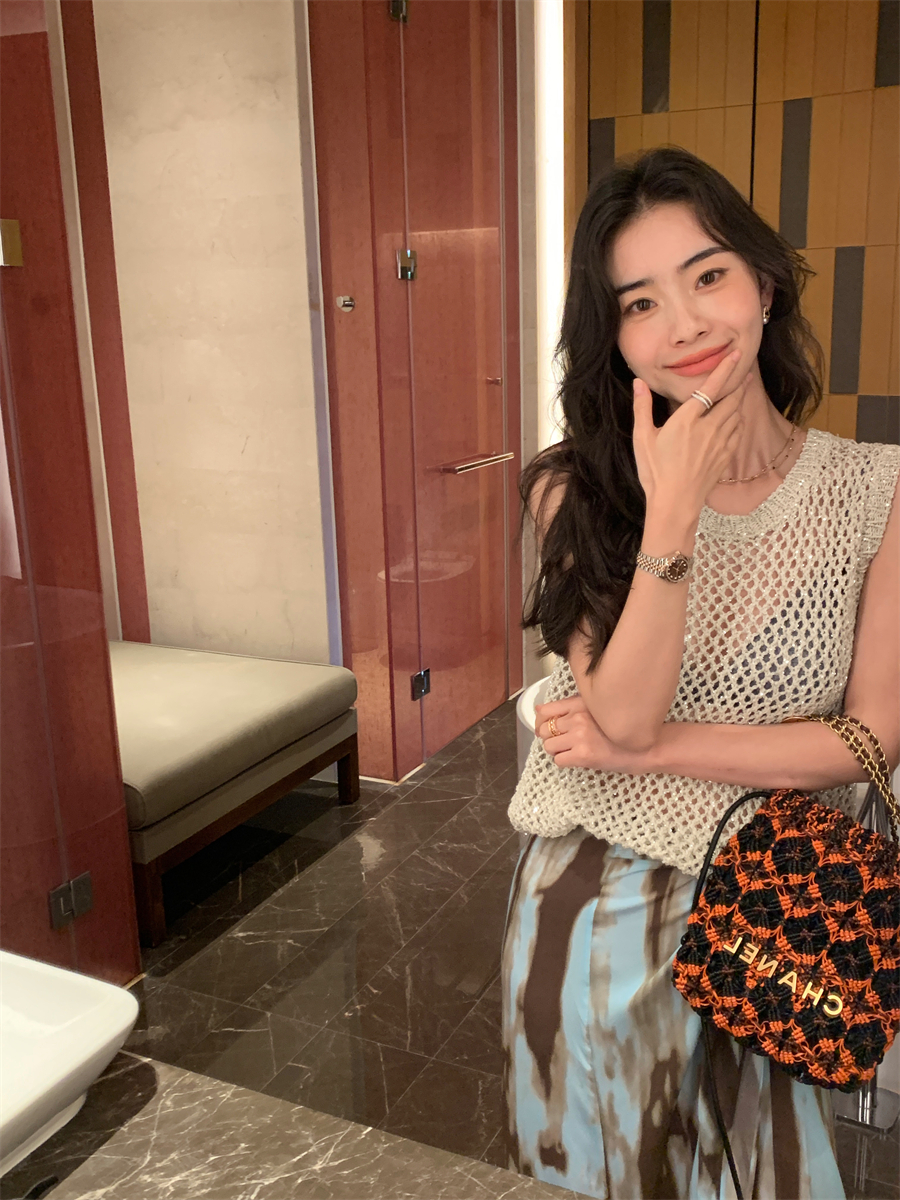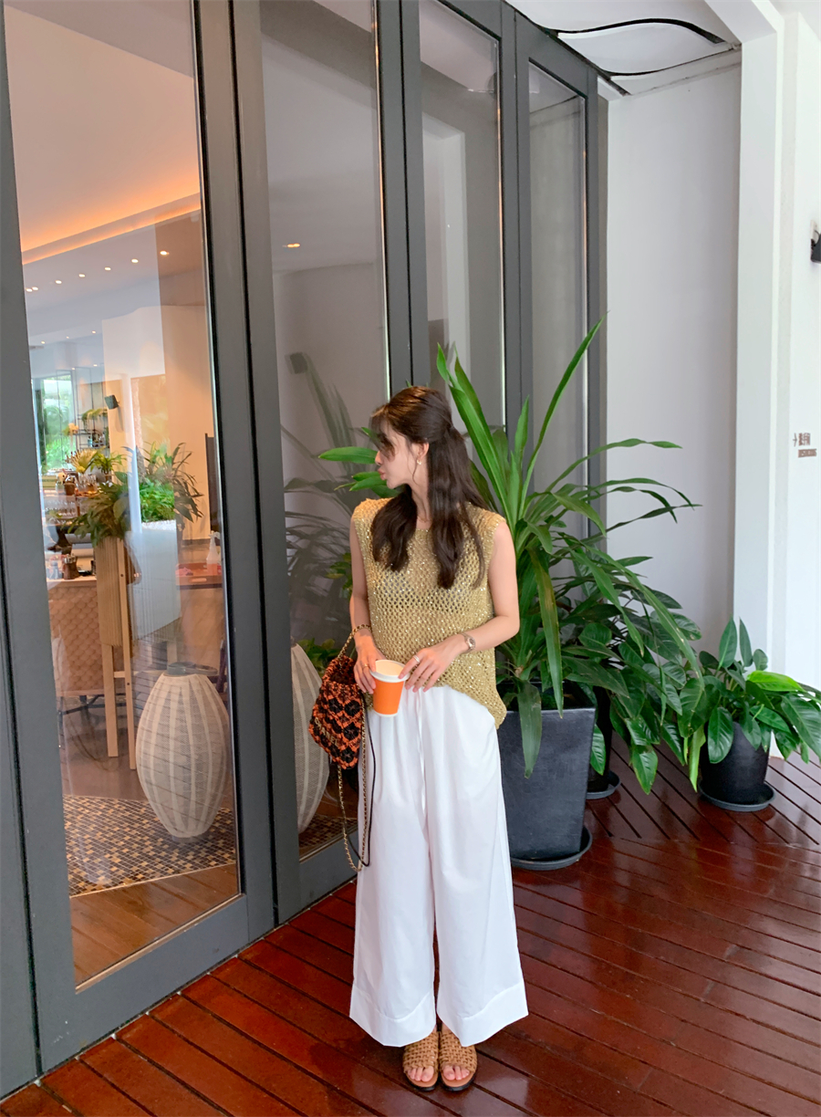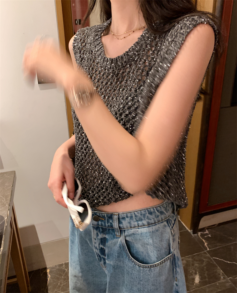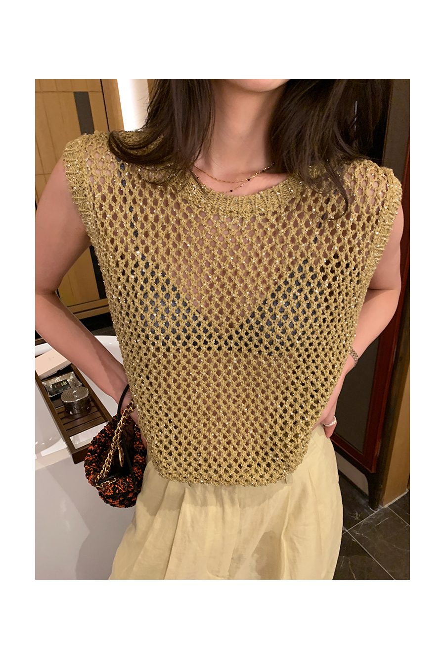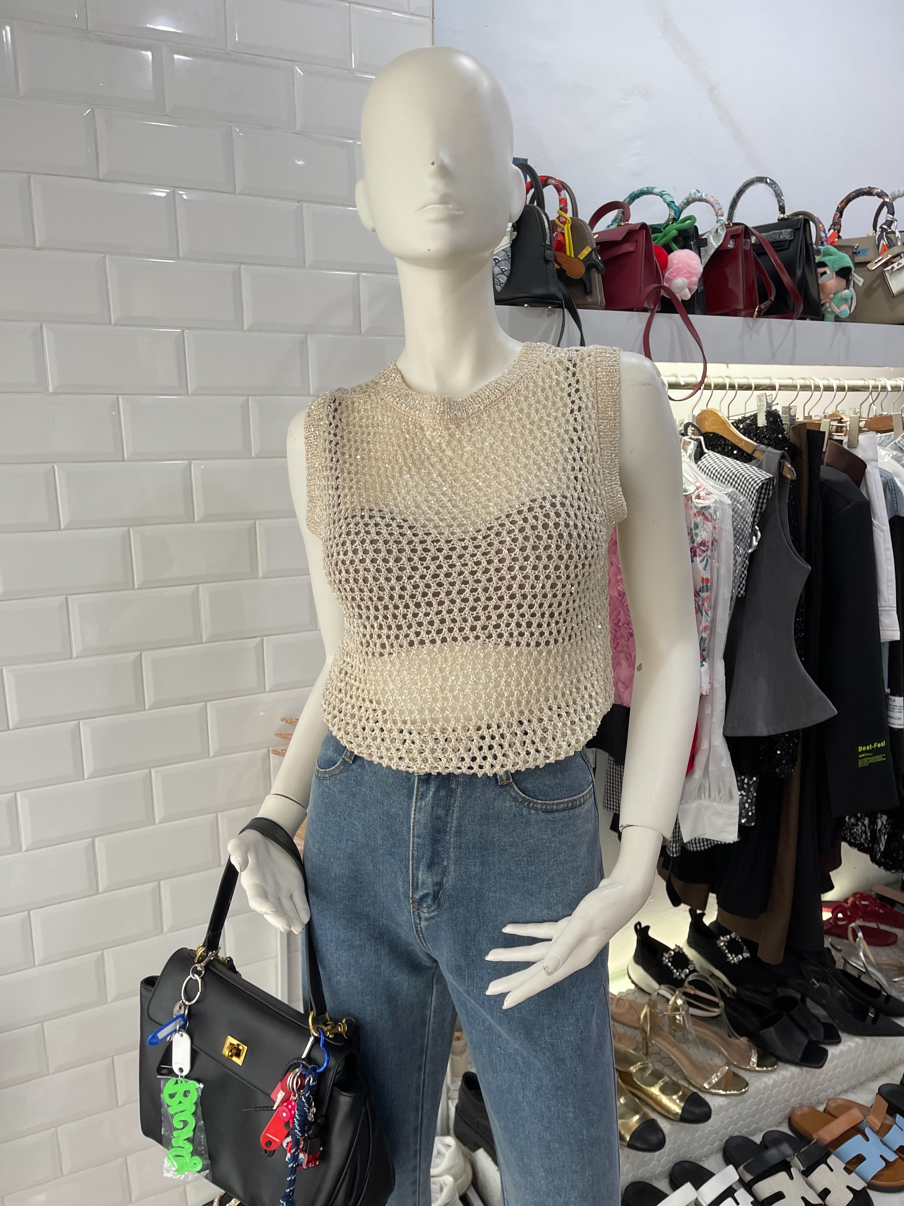 搖滾個性風 流金麻簍空背心(花灰/米白)