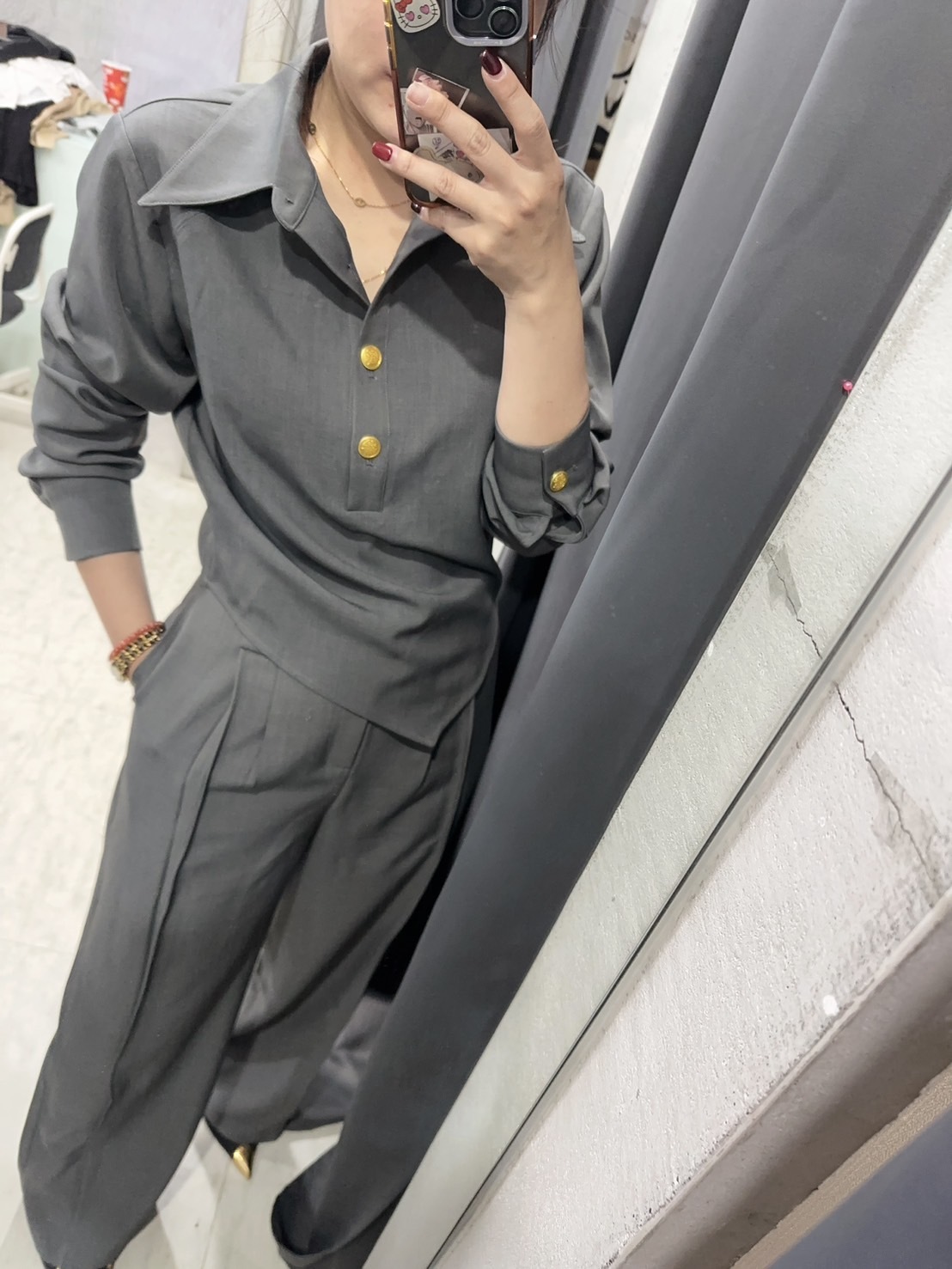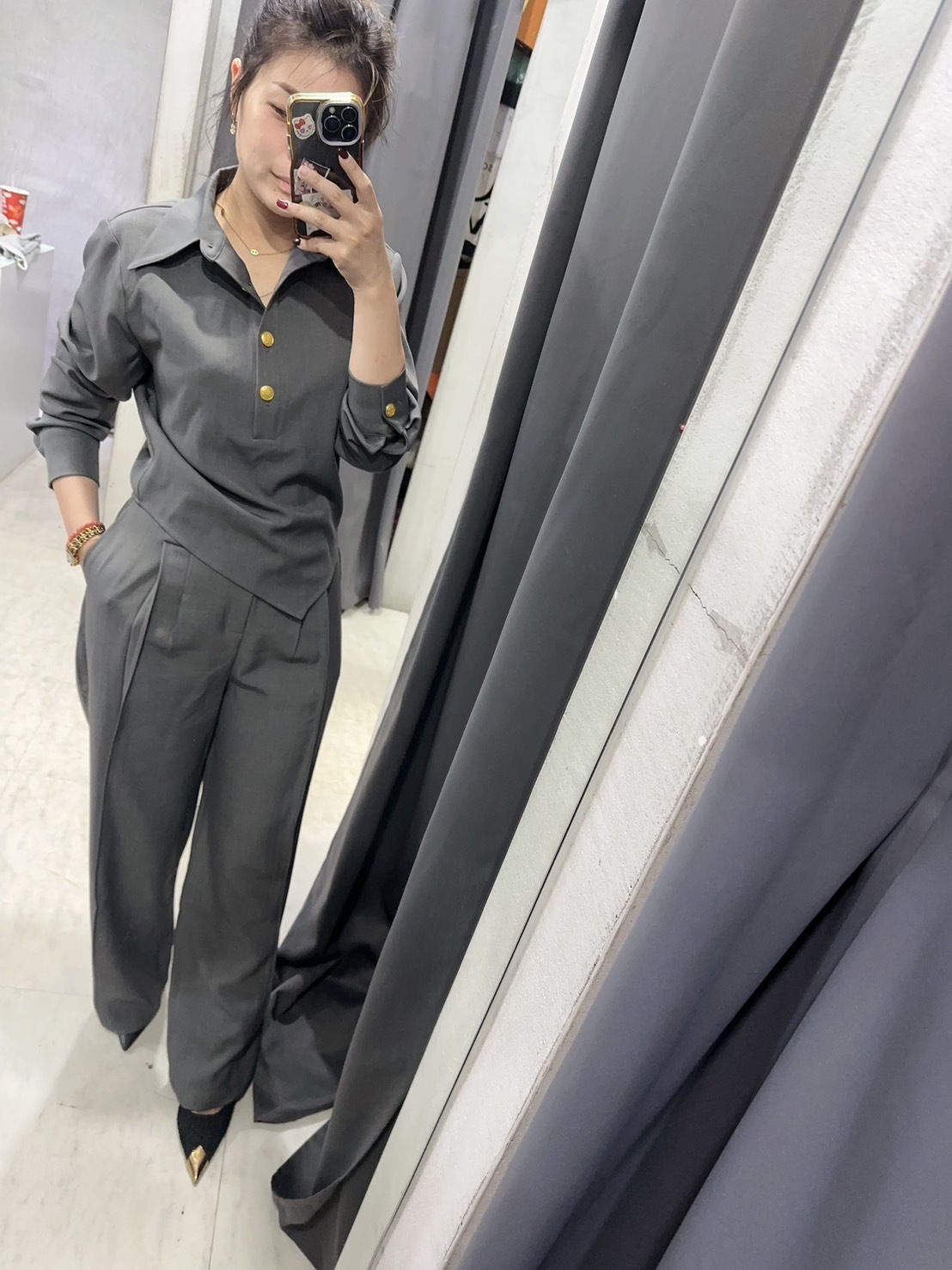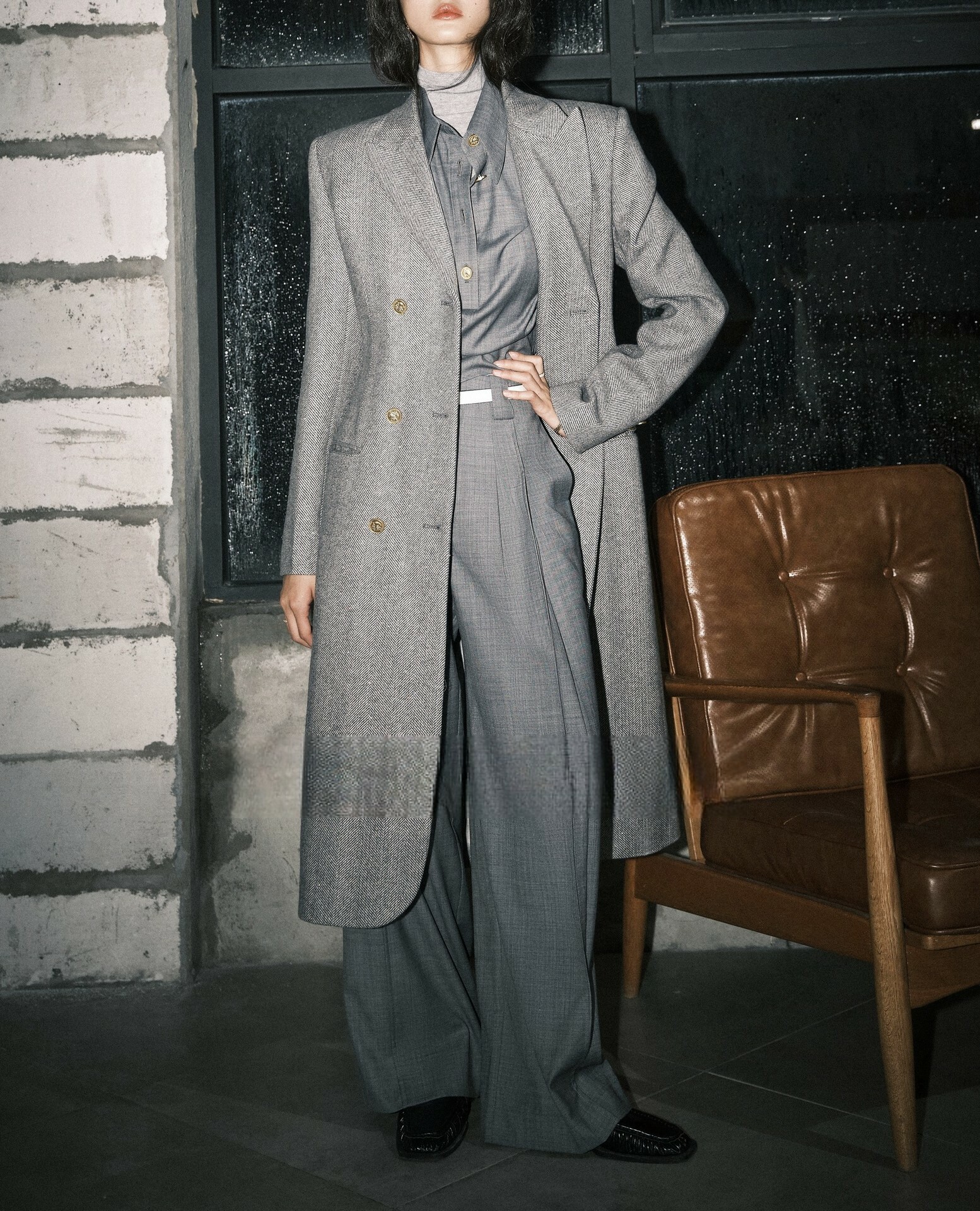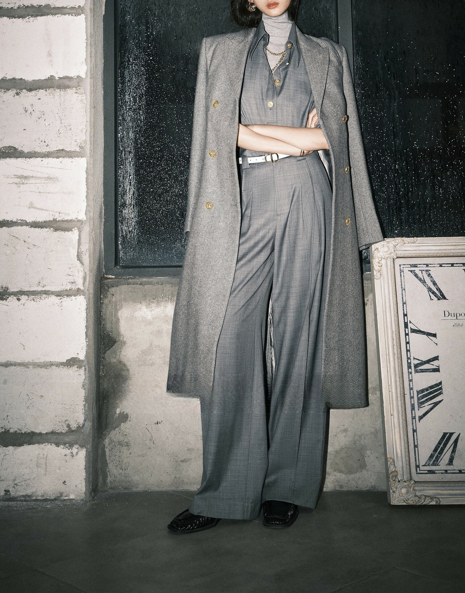 老錢風 不規則上衣+高腰直筒褲(卡其/灰)