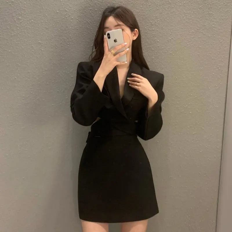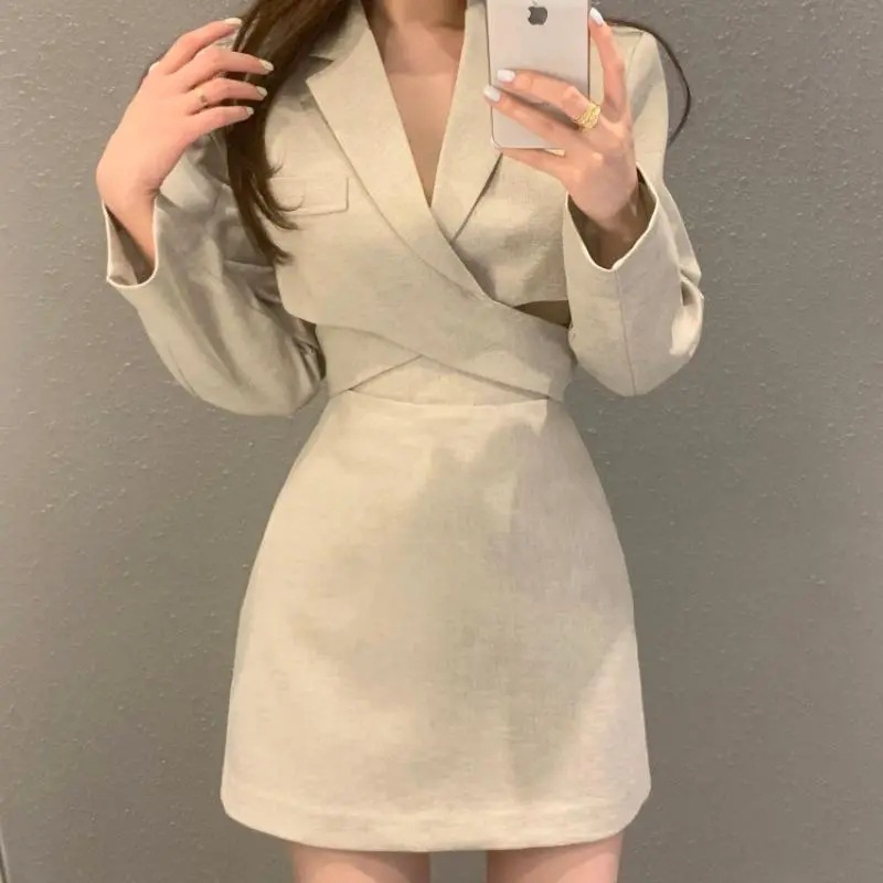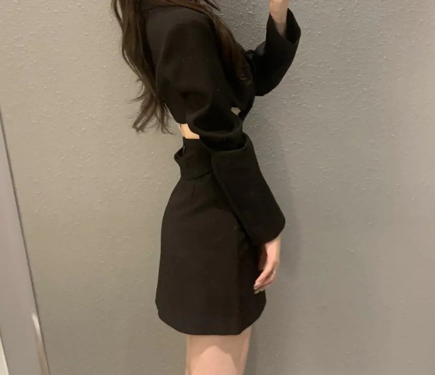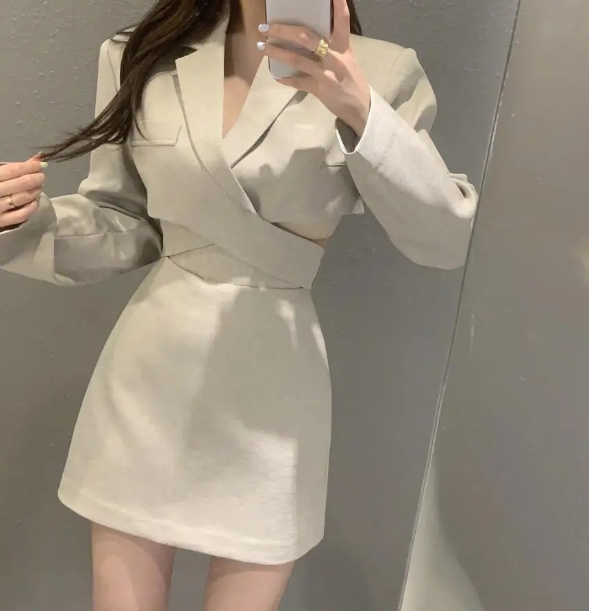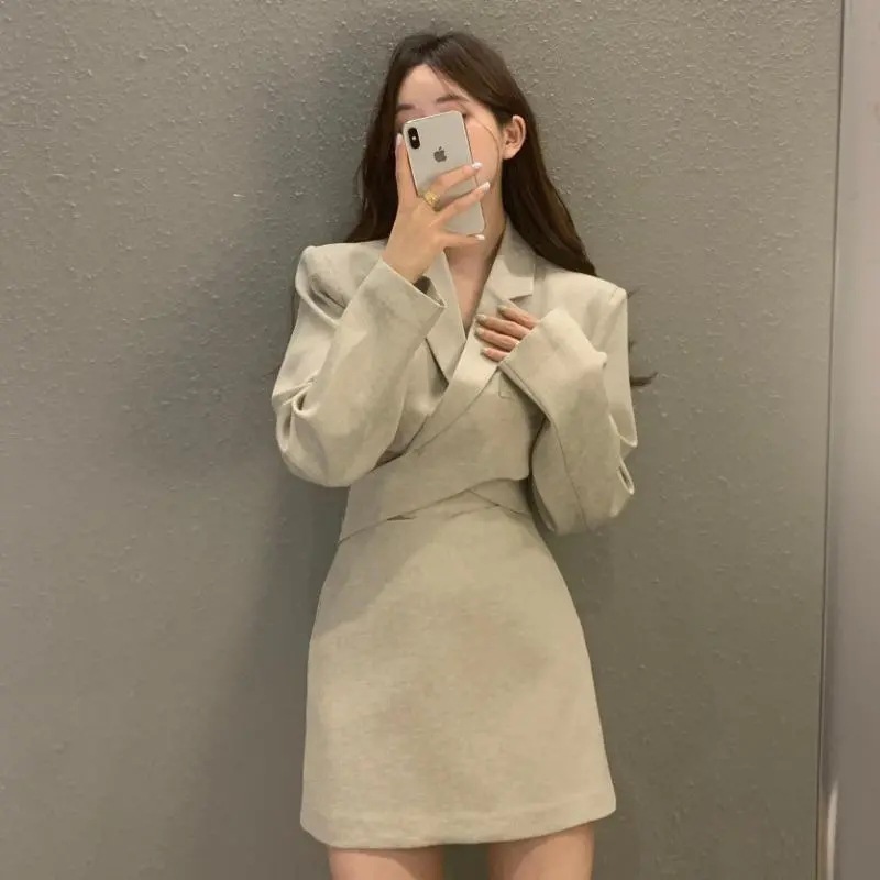 翻領交叉+高腰裙(2件組)(黑/杏)