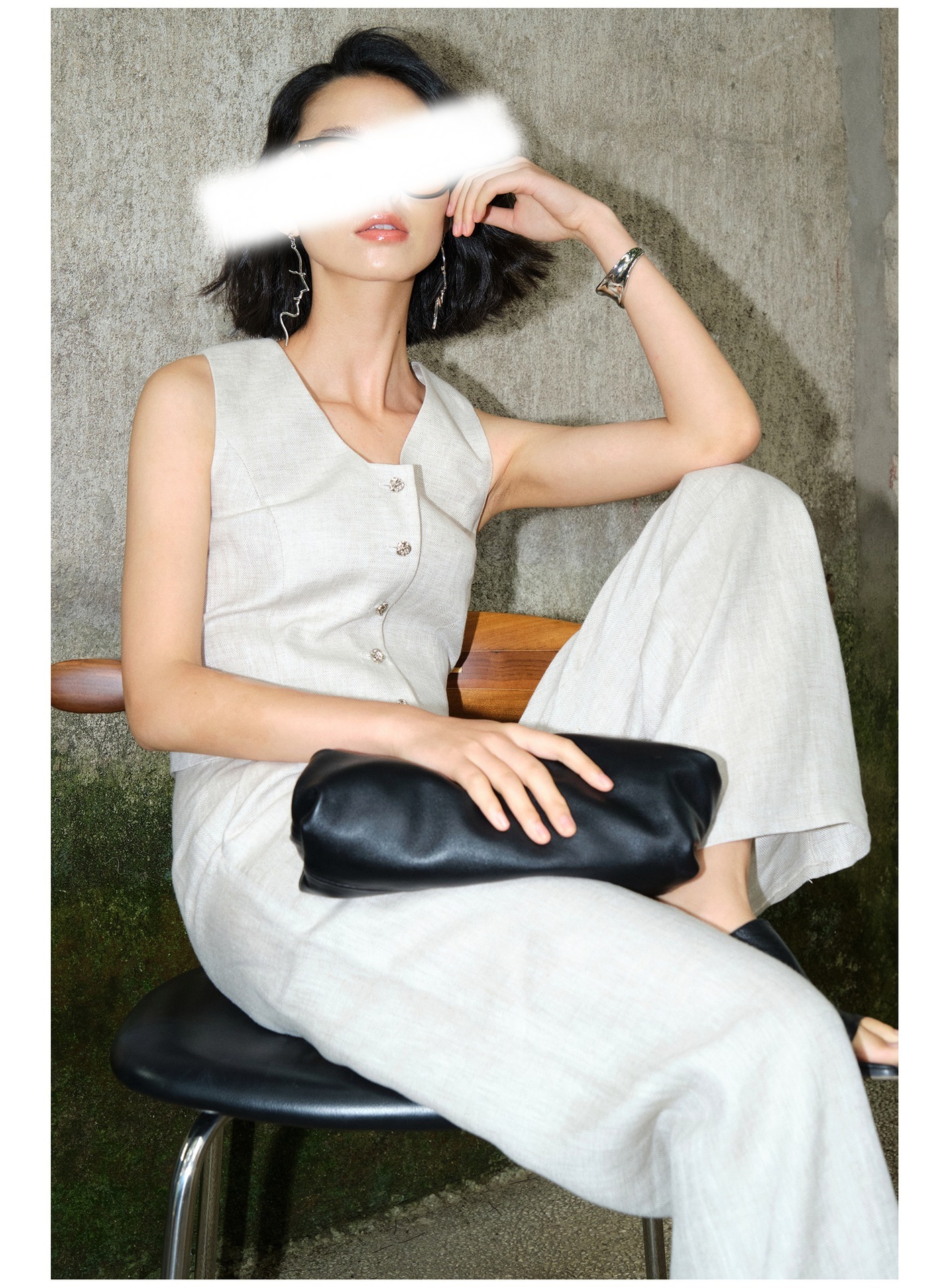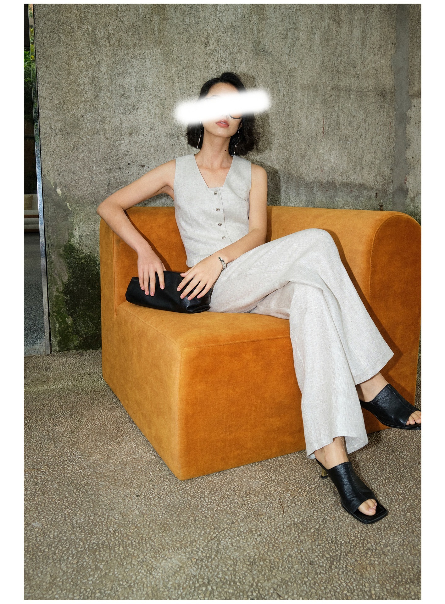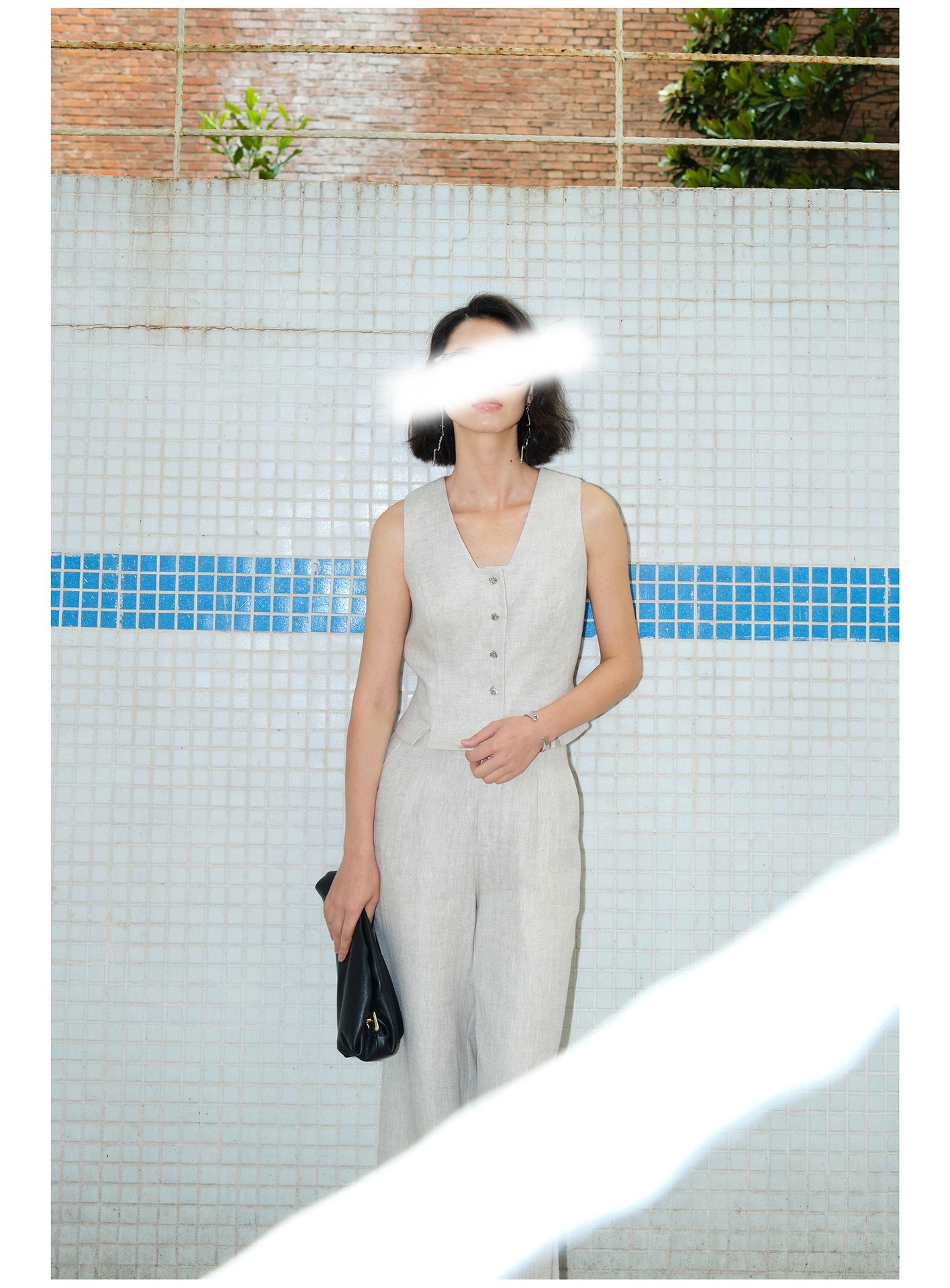 優雅時尚的亞麻背心搭配高腰寬版長褲,清爽舒適又能展現女性曲線優美。亞麻材質透氣涼爽,適合炎熱夏日。寬鬆剪裁及高腰設計,能修飾腰線、拉長腿部比例,創造出時尚靈動的造型。整體以簡約輕盈的氣質呈現,是百搭穿搭的理想選擇。無論是休閒or正式場合,都能襯托出俐落迷人的女性魅力。