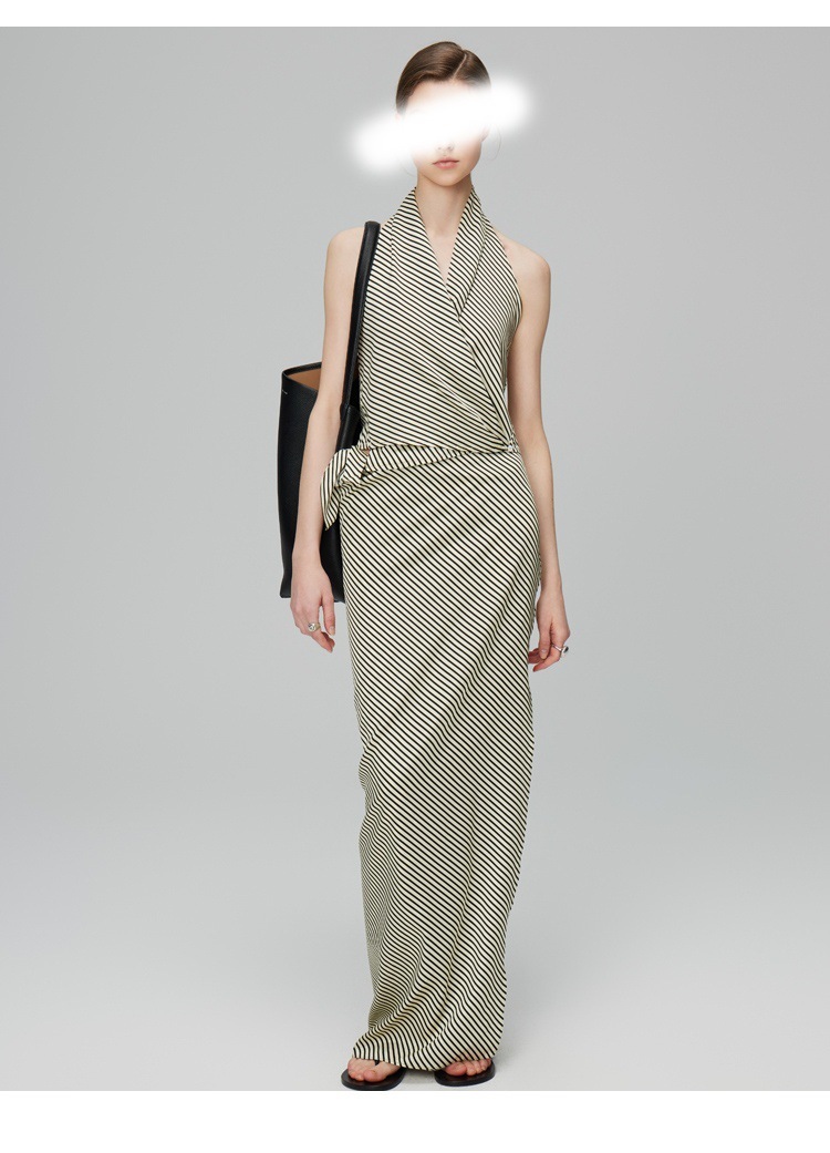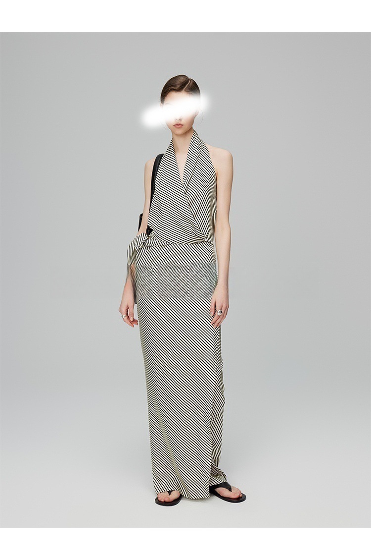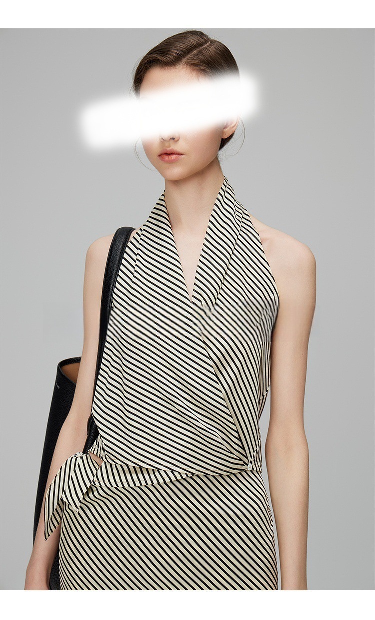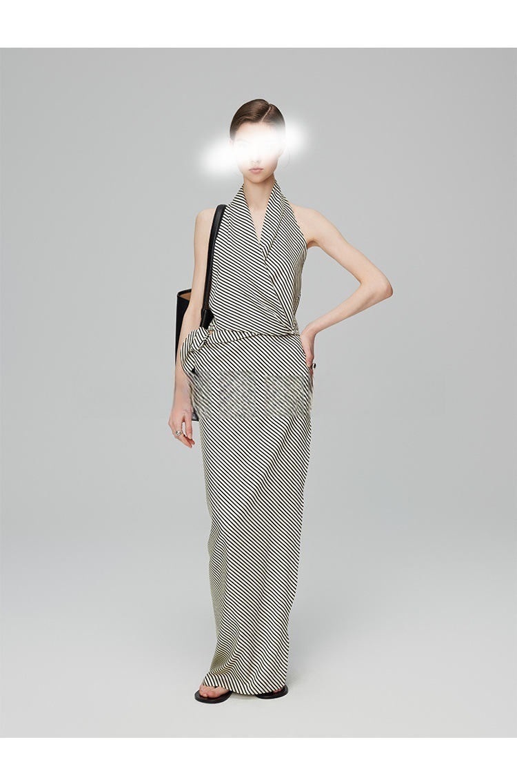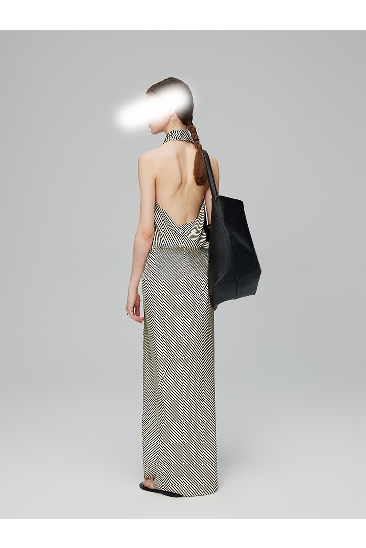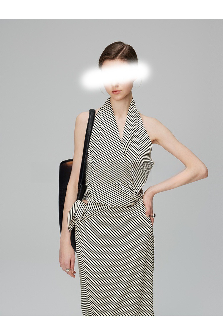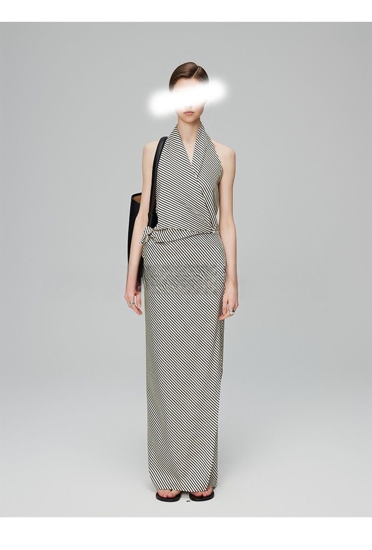 真絲線條印花 彈性繞脖上衣+一片裙(2件組)