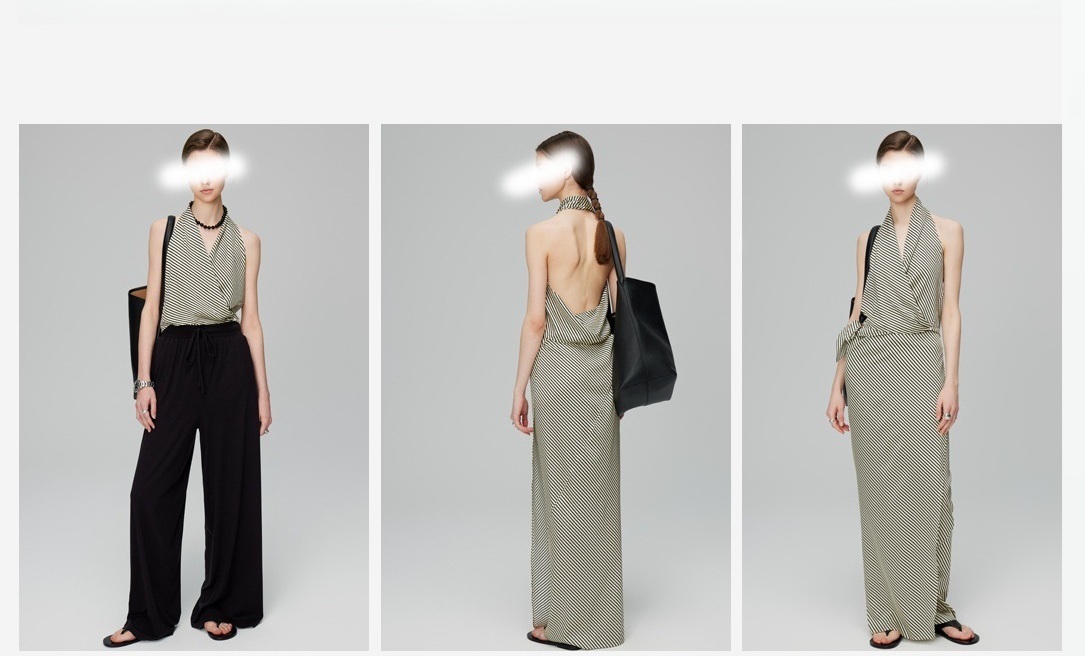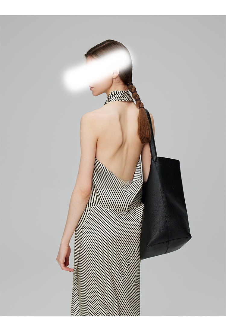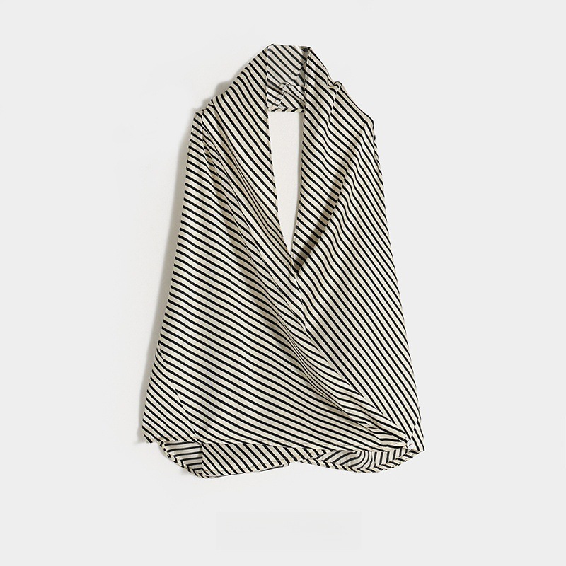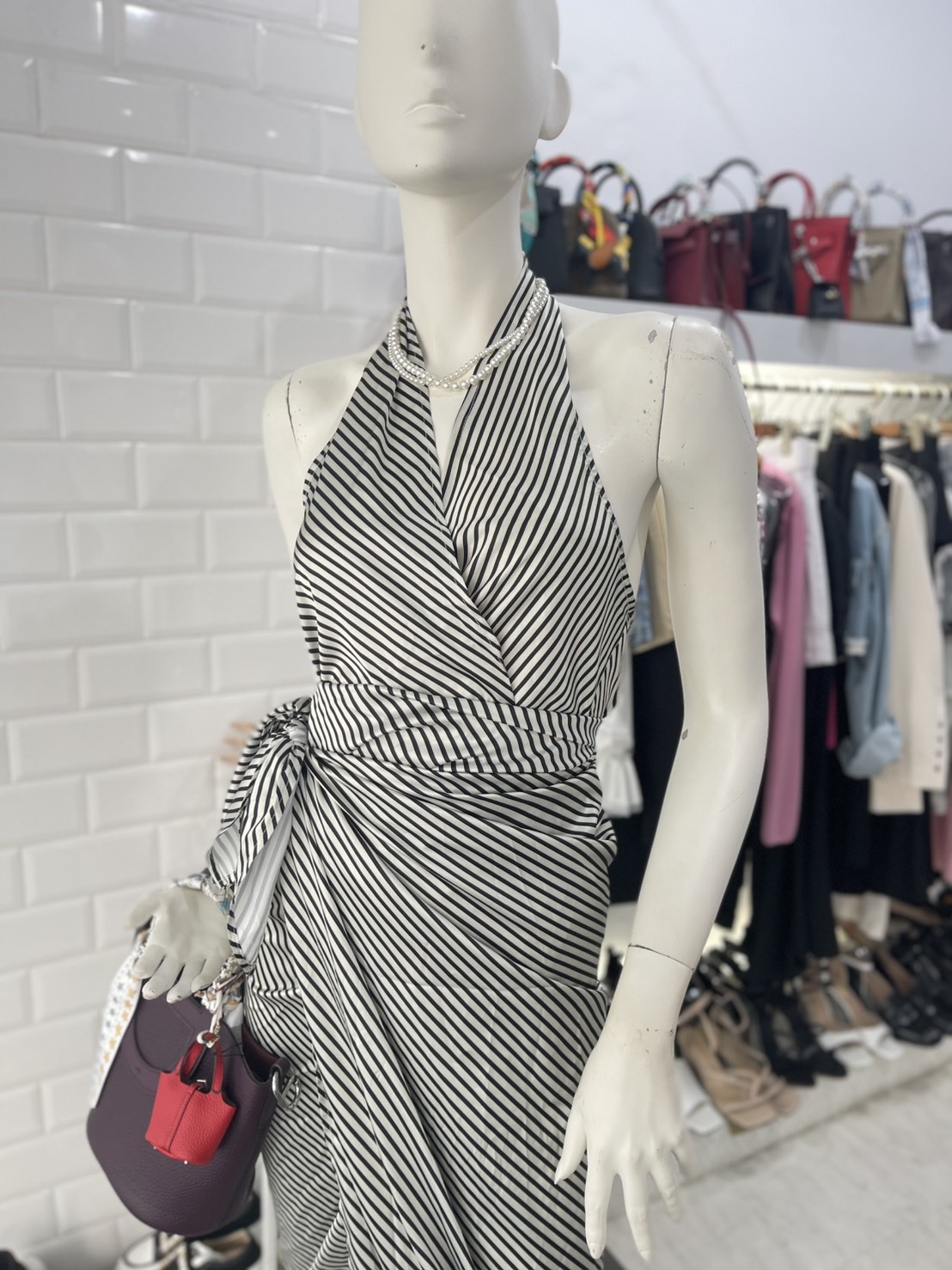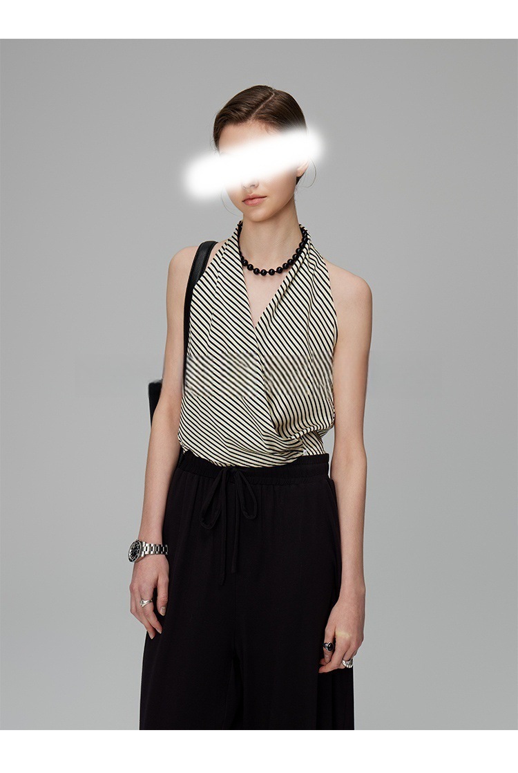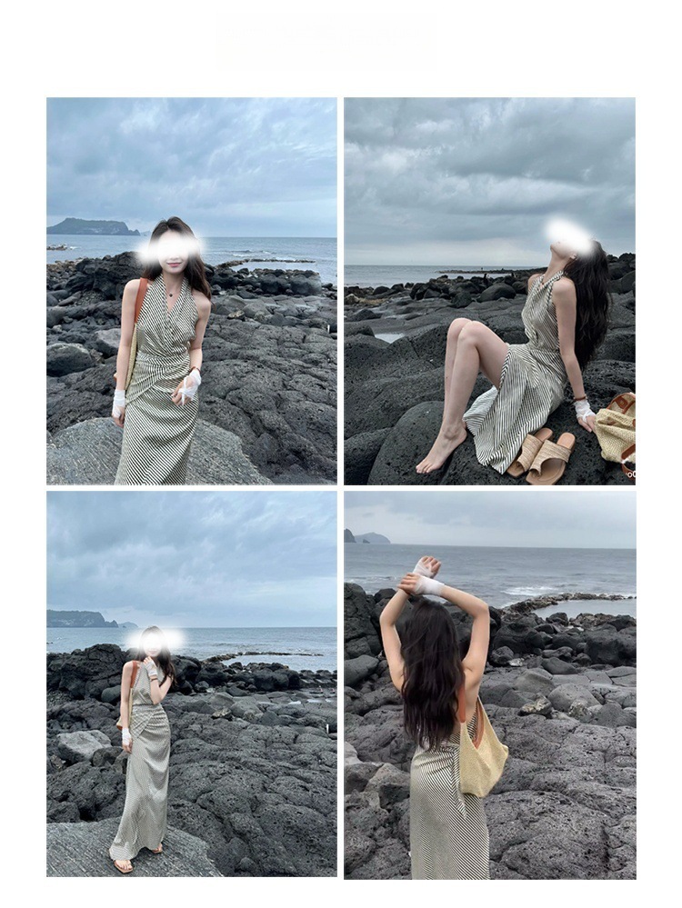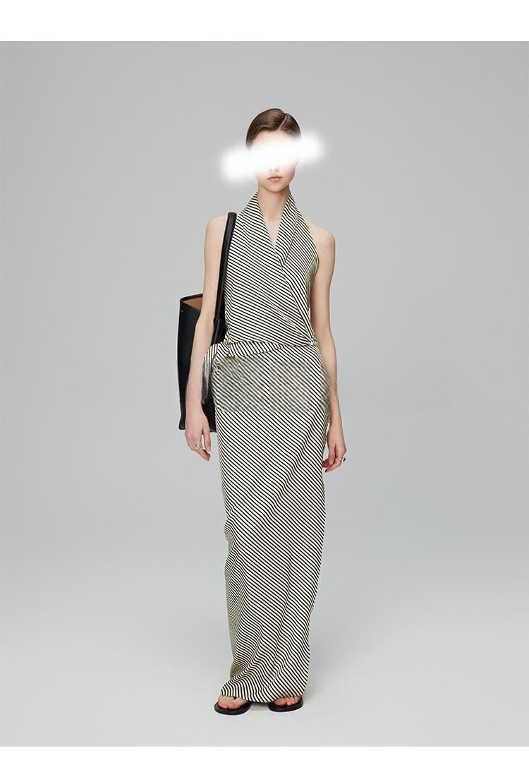 真絲線條印花 彈性繞脖上衣+一片裙(2件組)