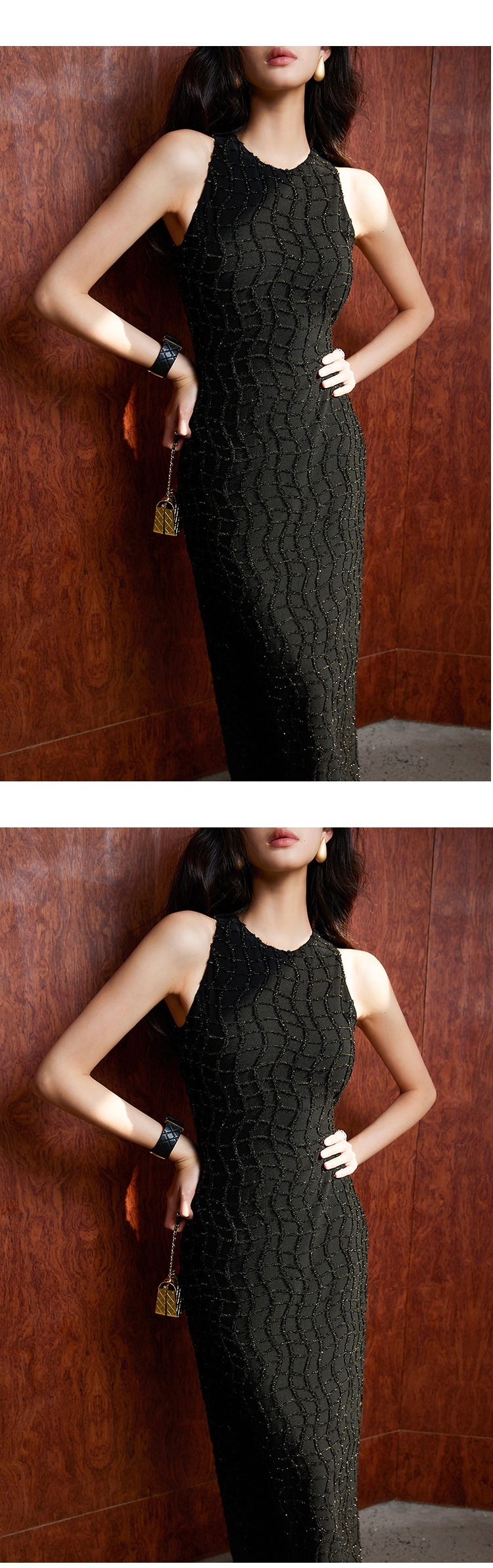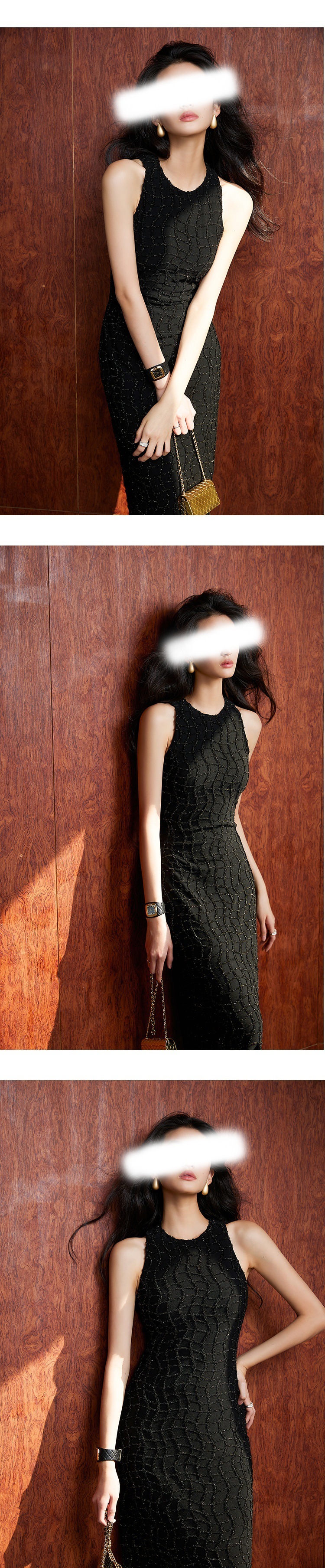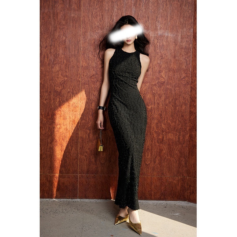 亮絲流蘇 彈性貼身長洋裝(黑/白)
