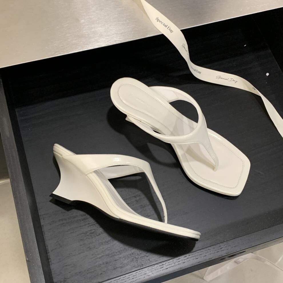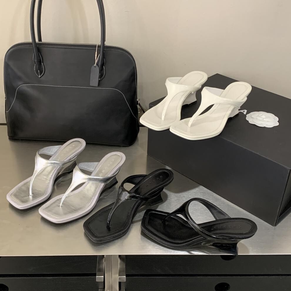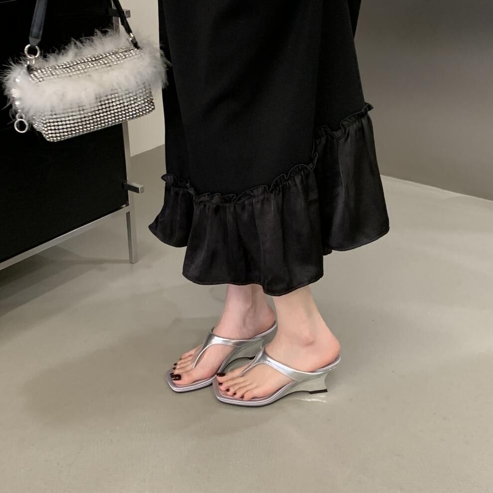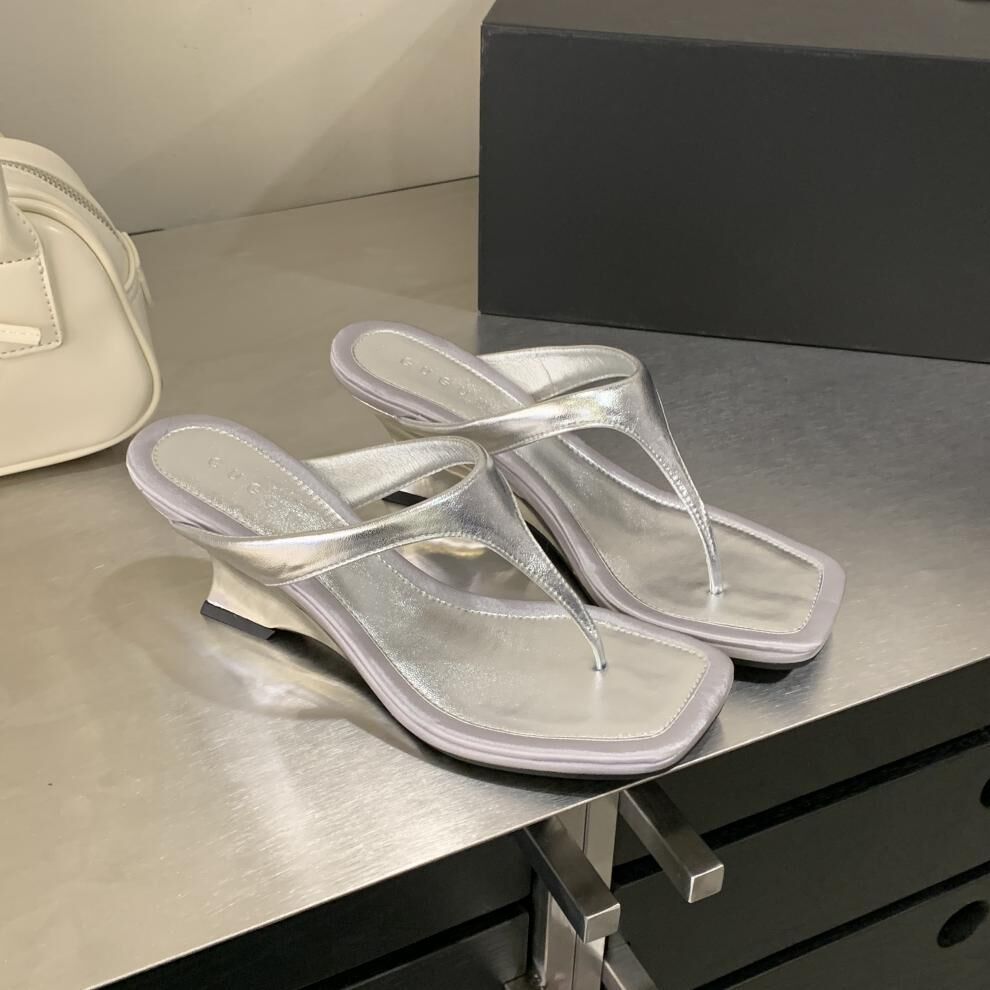 夾腳方頭 坡跟拖鞋(35-39)(黑/銀/白)