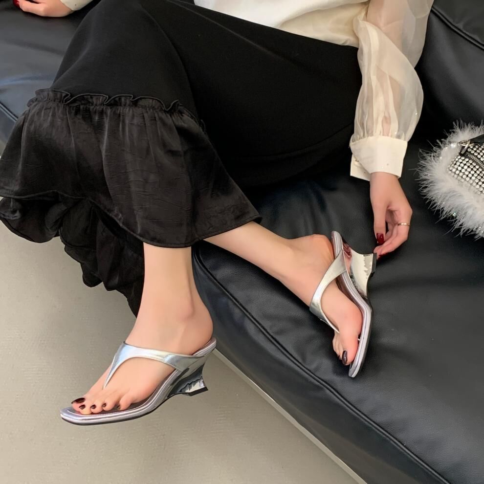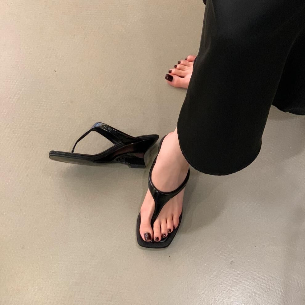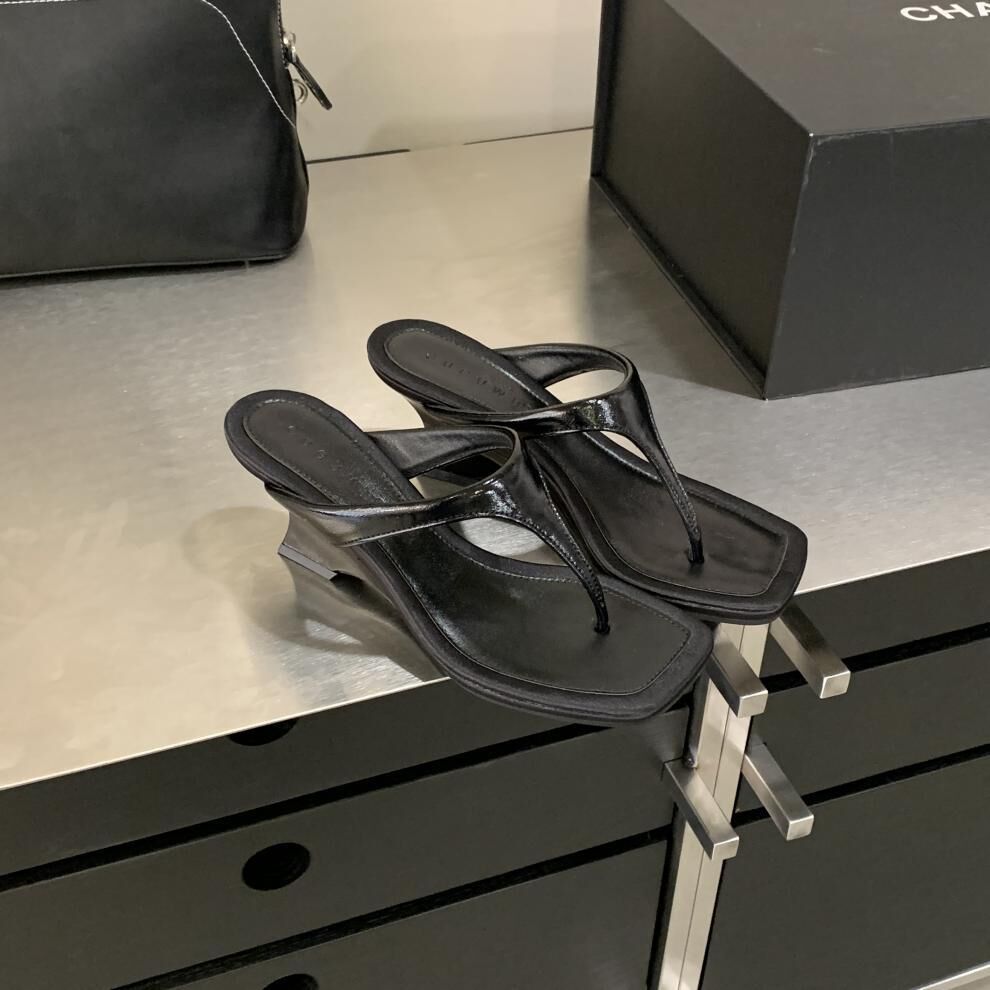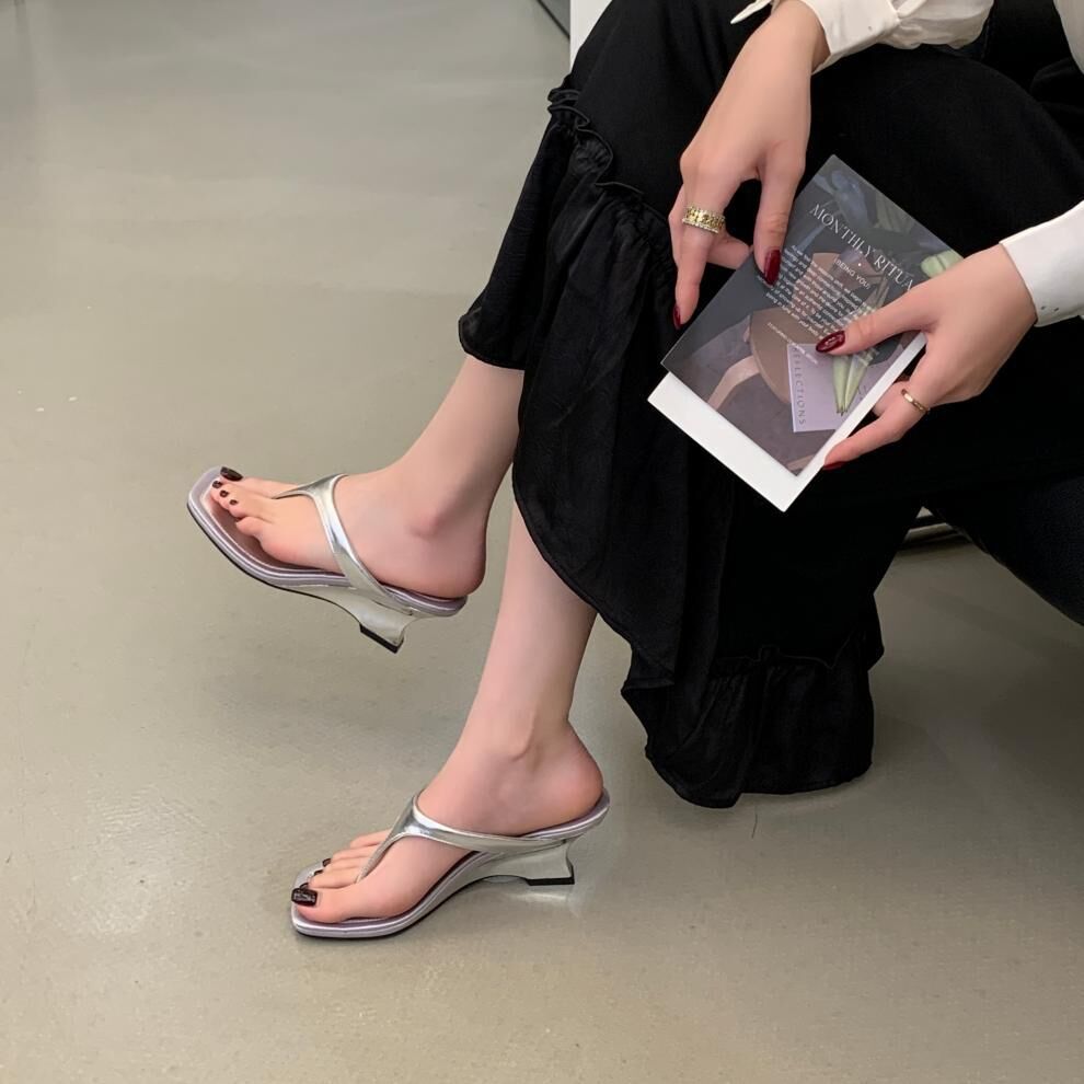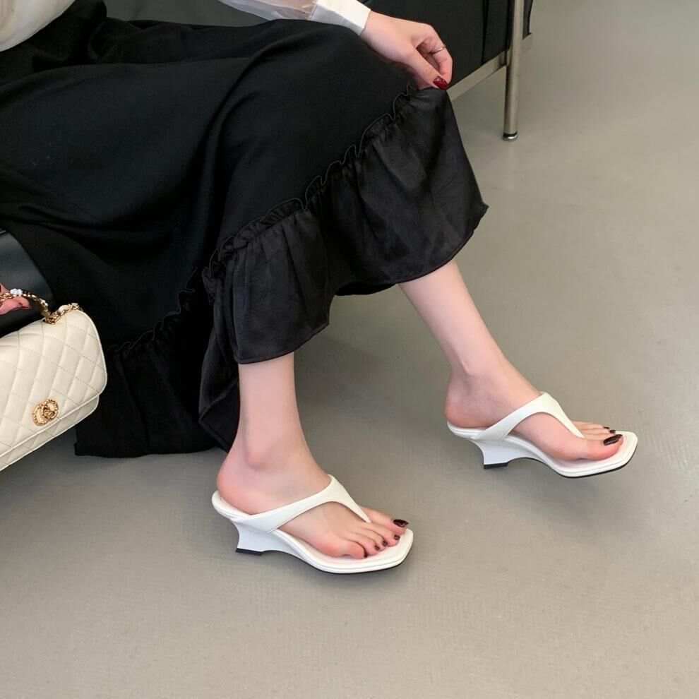 夾腳方頭 坡跟拖鞋(35-39)(黑/銀/白)